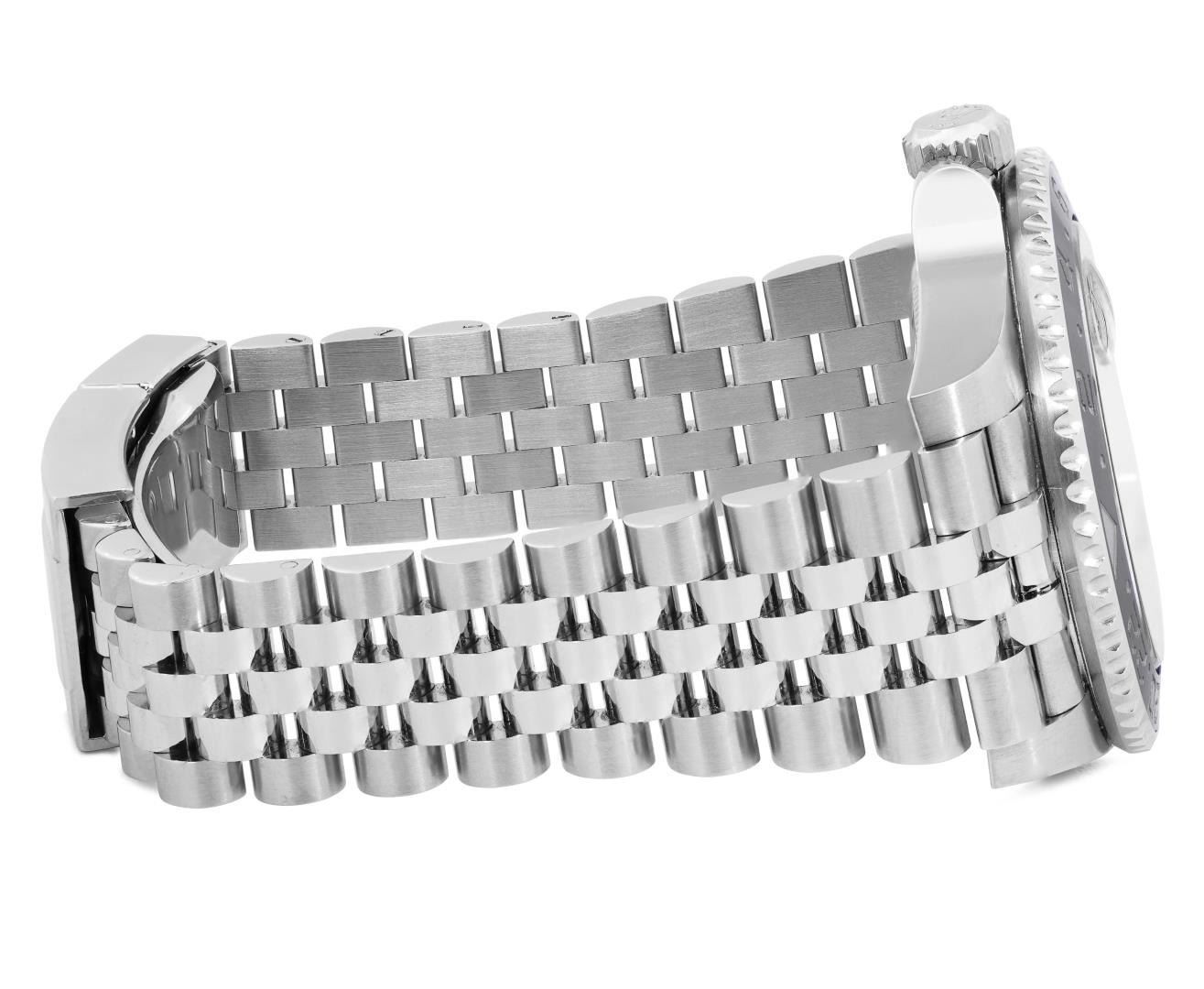 One Mens Pre Owned Rolex Stainless Steel GMT Master 2 Polished, Serviced And Electronically Tested, Rolex Stainless Steel Case: 40mm, Rolex Stainless Steel Crown, Rolex Bezel: Stainless Steel Bi Directional Rotatable Bezel With Blue And Black Insert. Rolex Crystal: Sapphire Crystal With Magnified Date Window. Rolex Movement: Automatic Winding Movement Caliber 3285. Dial: Black Dial. Functions: Quickset, GMT Hand. Date Window: 3 O'Clock Position Date Display, Model: GMT Master 2, Quickset, Condition: G-6 Extra Fine. Rolex Bracelet: Stainless Steel Jubilee Band. Bright Polish And Satin Finish. 7.25 Inch Length, Adjustable. Standard Clasp, With Rolex Logo. This Watch Has Been Serviced Time Tested And Is In Excellent Condition It Is Free Of All Scratches And Dents. This Watch Comes With A Rolex Box And Card.