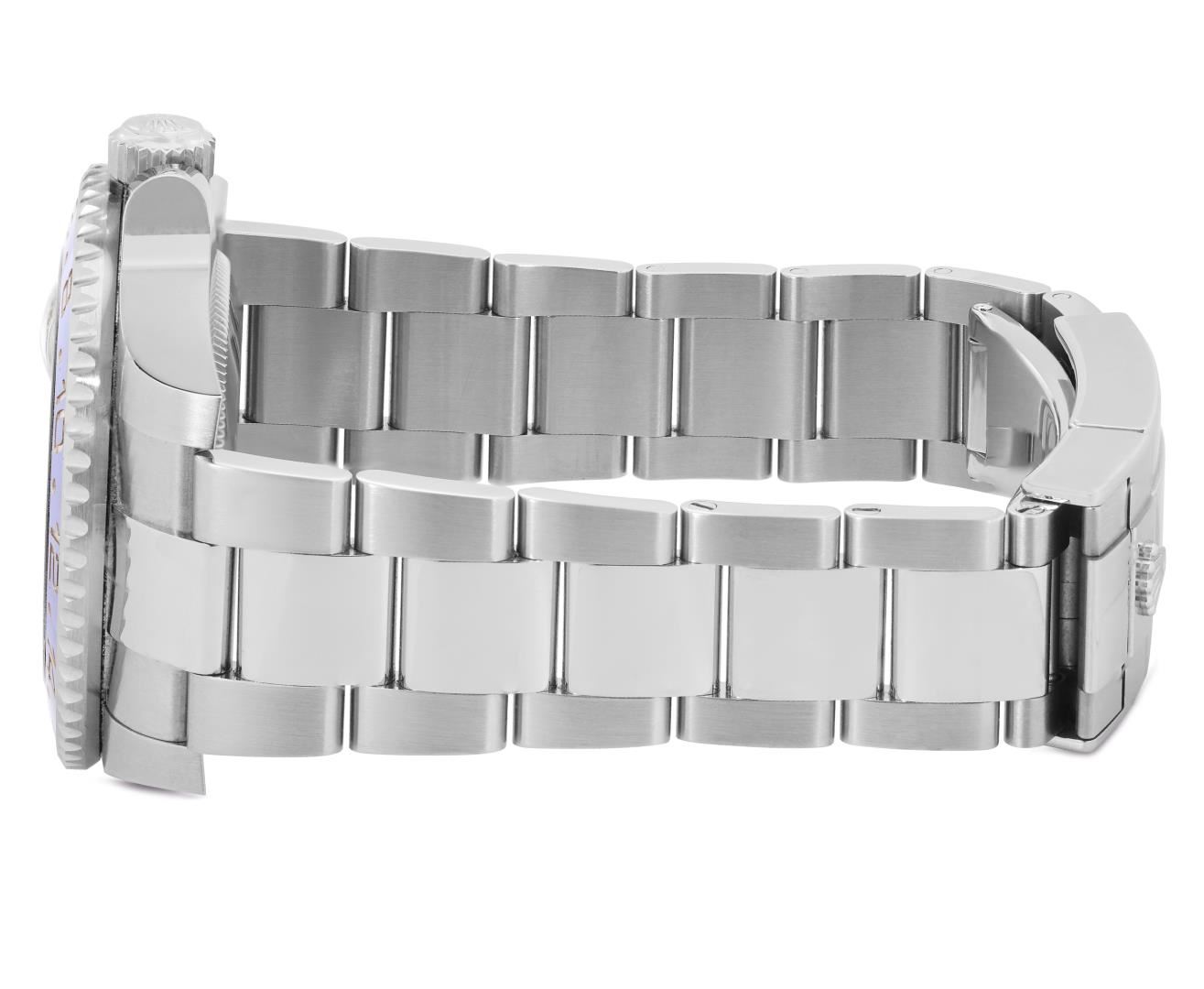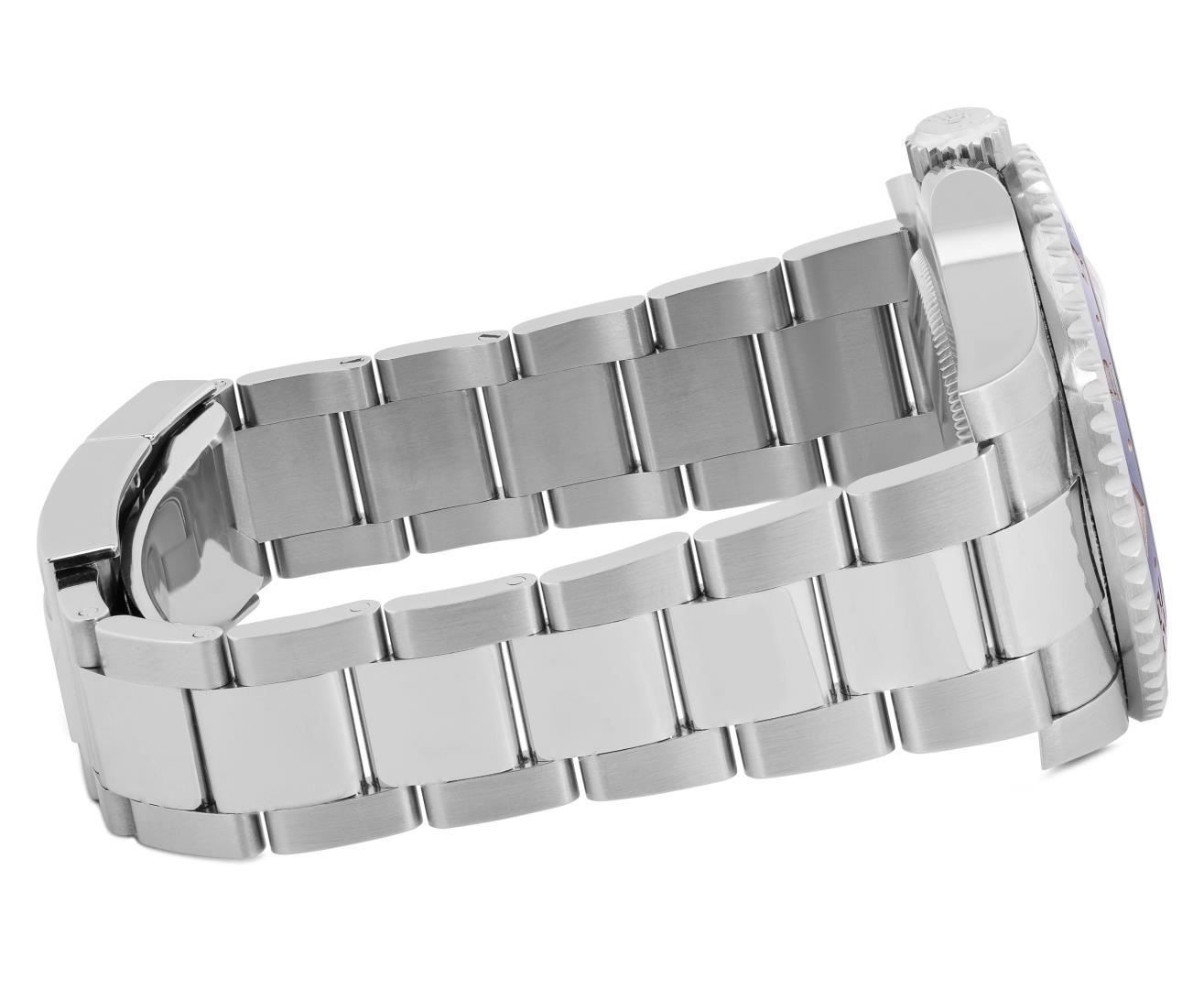 One Mens Pre Owned Rolex Stainless Steel GMT Master 2 Polished, Serviced And Electronically Tested, Rolex Stainless Steel Case: 40mm, Rolex Stainless Steel Crown, Rolex Bezel: Stainless Steel Bi Directional Rotatable Bezel With Blue And Black Insert. Rolex Crystal: Sapphire Crystal With Magnified Date Window. Rolex Movement: Automatic Winding Movement Caliber 3186. Dial: Black Dial. Functions: GMT Hand, Quickset. Date Window: 3 O'Clock Position Date Display, Model: GMT Master 2, Quickset, Condition: G-6 Extra Fine. Rolex Bracelet: Stainless Steel Oyster Band. Bright Polish And Satin Finish. 7.25 Inch Length, Adjustable. Standard Clasp, With Rolex Logo. This Watch Has Been Serviced Time Tested And Is In Excellent Condition It Is Free Of All Scratches And Dents. This Watch Comes With A Rolex Box And Card.