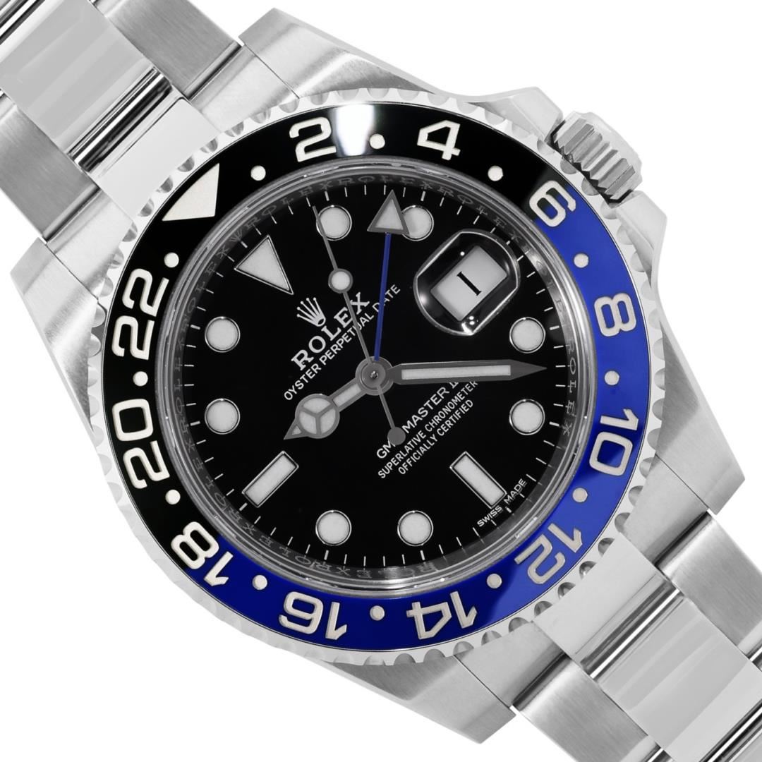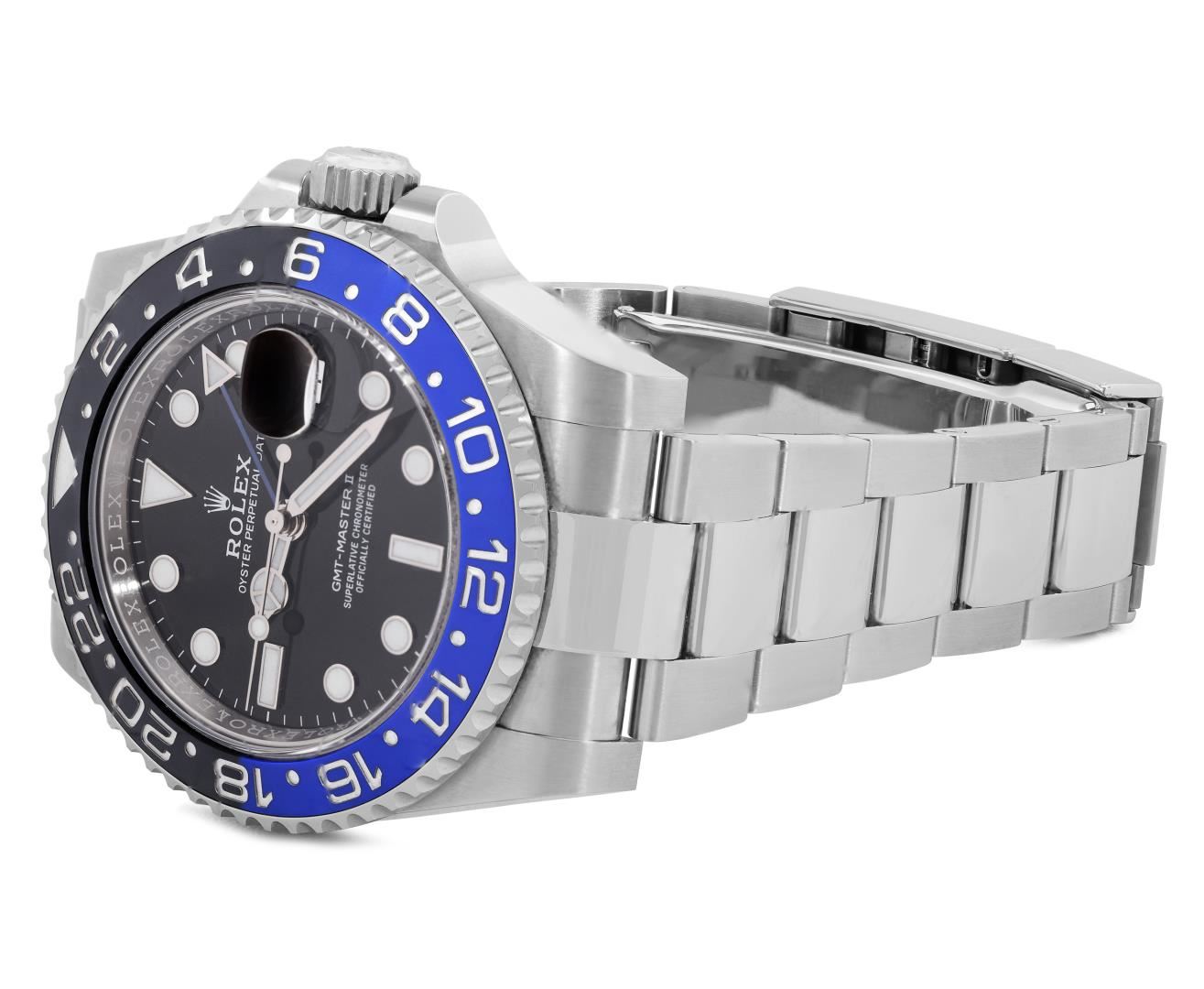 One Mens Pre Owned Rolex Stainless Steel GMT Master 2 Polished, Serviced And Electronically Tested, Rolex Stainless Steel Case: 40mm, Rolex Stainless Steel Crown, Rolex Bezel: Stainless Steel Bi Directional Rotatable Bezel With Blue And Black Insert. Rolex Crystal: Sapphire Crystal With Magnified Date Window. Rolex Movement: Automatic Winding Movement Caliber 3186. Dial: Black Dial. Functions: GMT Hand, Quickset. Date Window: 3 O'Clock Position Date Display, Model: GMT Master 2, Quickset, Condition: G-6 Extra Fine. Rolex Bracelet: Stainless Steel Oyster Band. Bright Polish And Satin Finish. 7.25 Inch Length, Adjustable. Standard Clasp, With Rolex Logo. This Watch Has Been Serviced Time Tested And Is In Excellent Condition It Is Free Of All Scratches And Dents. This Watch Comes With A Rolex Box And Card.