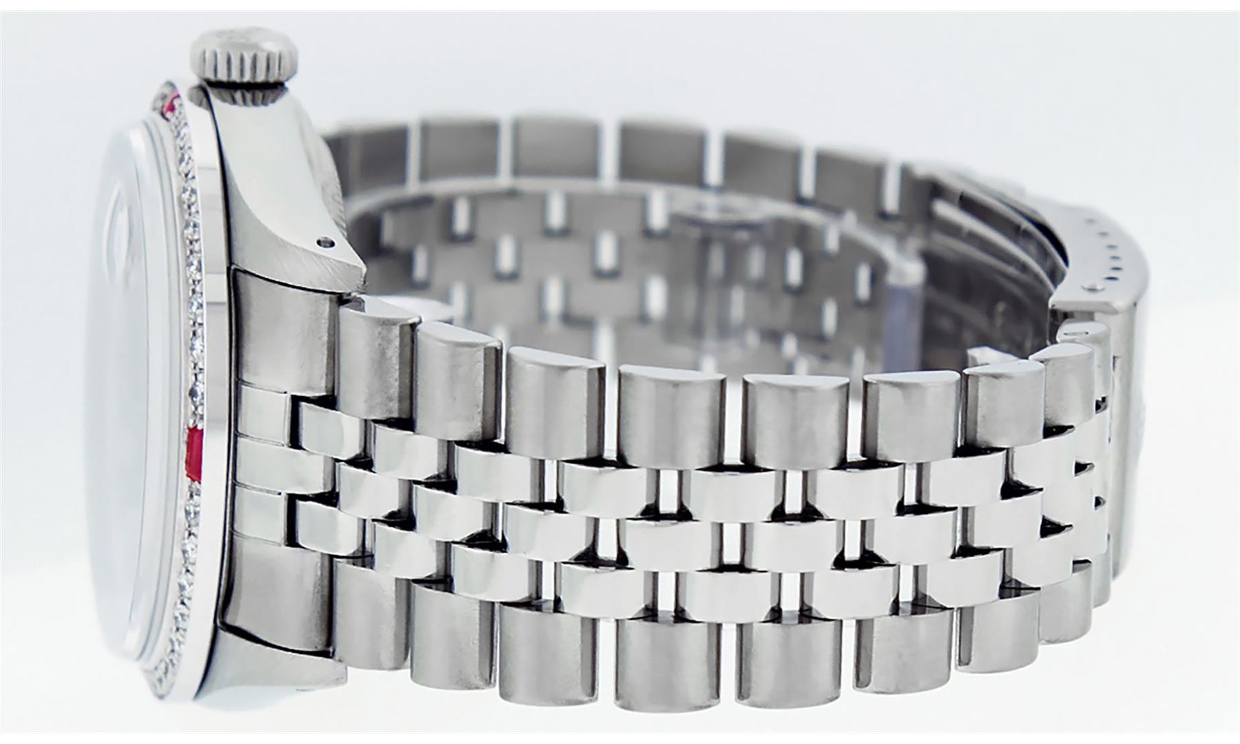 One Mens Rolex Stainless Steel Datejust Polished Bright with Satin Finish, This Watch Has Been Serviced & Electronically Tested, Stainless Steel Case: 36mm, Stainless Steel Crown, Custom Bezel: New 18K White Gold Ruby Beadset Diamond Bezel, Stone Count: 36 Diamonds + 4 Rubies In Bezel, Total Weight 1.00 Carat, Clarity: SI-VS, Color: G to H. Custom Crystal: New Scratch Resistant Synthetic Sapphire Cyclops Lens. Custom Hands: New Luminescent Hands. Movement: Automatic Winding Movement Caliber 3035. Custom Dial: Black Baguette Diamond + Ruby Dial, Stone Count: 8 Baguette Diamonds + 2 Synthetic Rubies On Dial, Color: G to H, Clarity: VS2-SI1. Date Window: 3 O'Clock Position Date Display, Quickset, Model: Datejust. Condition: G-6 Extra Fine. Bracelet: Stainless Steel Jubilee Band. Bright Polish & Satin Finish. 7.0 Inch Length, Adjustable. Standard Clasp, With Rolex Logo. This Watch Has Been Serviced Time Tested And Is In Excellent Condition It Is Free Of All Scratches And Dents.