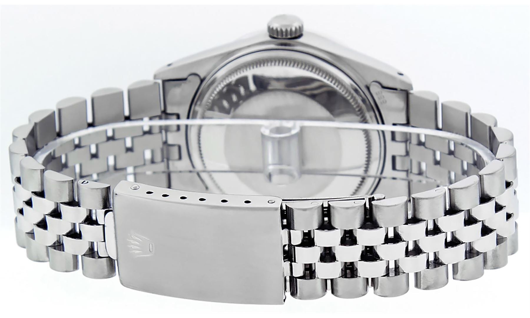One Mens Rolex Stainless Steel Datejust Polished Bright with Satin Finish, This Watch Has Been Serviced & Electronically Tested, Stainless Steel Case: 36mm, Stainless Steel Crown, Custom Bezel: New 18K White Gold Ruby Beadset Diamond Bezel, Stone Count: 36 Diamonds + 4 Rubies In Bezel, Total Weight 1.00 Carat, Clarity: SI-VS, Color: G to H. Custom Crystal: New Scratch Resistant Synthetic Sapphire Cyclops Lens. Custom Hands: New Luminescent Hands. Movement: Automatic Winding Movement Caliber 3035. Custom Dial: Black Baguette Diamond + Ruby Dial, Stone Count: 8 Baguette Diamonds + 2 Synthetic Rubies On Dial, Color: G to H, Clarity: VS2-SI1. Date Window: 3 O'Clock Position Date Display, Quickset, Model: Datejust. Condition: G-6 Extra Fine. Bracelet: Stainless Steel Jubilee Band. Bright Polish & Satin Finish. 7.0 Inch Length, Adjustable. Standard Clasp, With Rolex Logo. This Watch Has Been Serviced Time Tested And Is In Excellent Condition It Is Free Of All Scratches And Dents.
