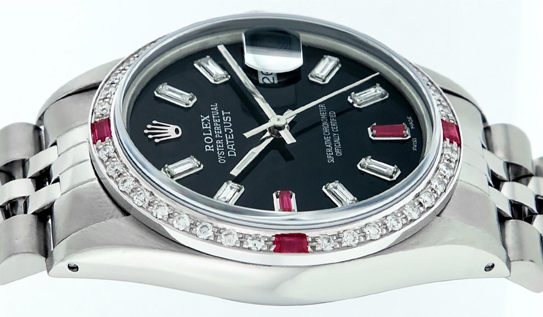 One Mens Rolex Stainless Steel Datejust Polished Bright with Satin Finish, This Watch Has Been Serviced & Electronically Tested, Stainless Steel Case: 36mm, Stainless Steel Crown, Custom Bezel: New 18K White Gold Ruby Beadset Diamond Bezel, Stone Count: 36 Diamonds + 4 Rubies In Bezel, Total Weight 1.00 Carat, Clarity: SI-VS, Color: G to H. Custom Crystal: New Scratch Resistant Synthetic Sapphire Cyclops Lens. Custom Hands: New Luminescent Hands. Movement: Automatic Winding Movement Caliber 3035. Custom Dial: Black Baguette Diamond + Ruby Dial, Stone Count: 8 Baguette Diamonds + 2 Synthetic Rubies On Dial, Color: G to H, Clarity: VS2-SI1. Date Window: 3 O'Clock Position Date Display, Quickset, Model: Datejust. Condition: G-6 Extra Fine. Bracelet: Stainless Steel Jubilee Band. Bright Polish & Satin Finish. 7.0 Inch Length, Adjustable. Standard Clasp, With Rolex Logo. This Watch Has Been Serviced Time Tested And Is In Excellent Condition It Is Free Of All Scratches And Dents.