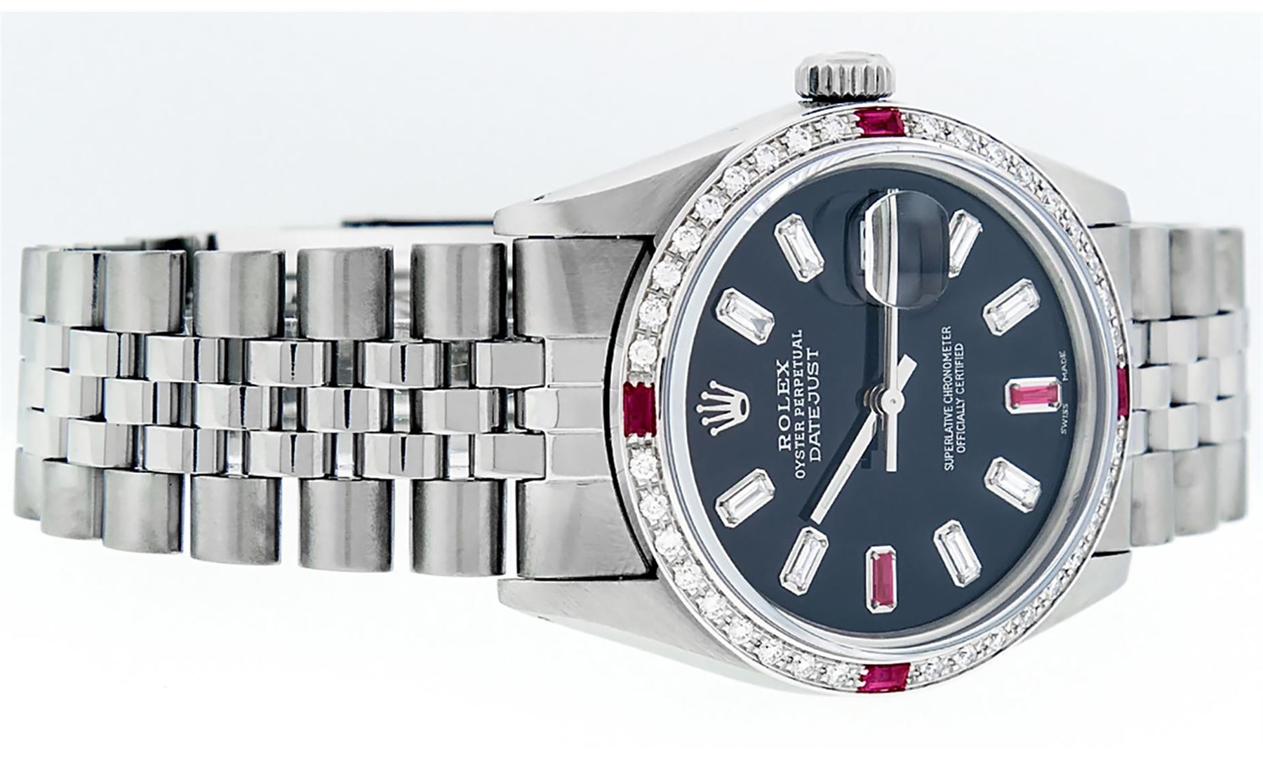 One Mens Rolex Stainless Steel Datejust Polished Bright with Satin Finish, This Watch Has Been Serviced & Electronically Tested, Stainless Steel Case: 36mm, Stainless Steel Crown, Custom Bezel: New 18K White Gold Ruby Beadset Diamond Bezel, Stone Count: 36 Diamonds + 4 Rubies In Bezel, Total Weight 1.00 Carat, Clarity: SI-VS, Color: G to H. Custom Crystal: New Scratch Resistant Synthetic Sapphire Cyclops Lens. Custom Hands: New Luminescent Hands. Movement: Automatic Winding Movement Caliber 3035. Custom Dial: Black Baguette Diamond + Ruby Dial, Stone Count: 8 Baguette Diamonds + 2 Synthetic Rubies On Dial, Color: G to H, Clarity: VS2-SI1. Date Window: 3 O'Clock Position Date Display, Quickset, Model: Datejust. Condition: G-6 Extra Fine. Bracelet: Stainless Steel Jubilee Band. Bright Polish & Satin Finish. 7.0 Inch Length, Adjustable. Standard Clasp, With Rolex Logo. This Watch Has Been Serviced Time Tested And Is In Excellent Condition It Is Free Of All Scratches And Dents.