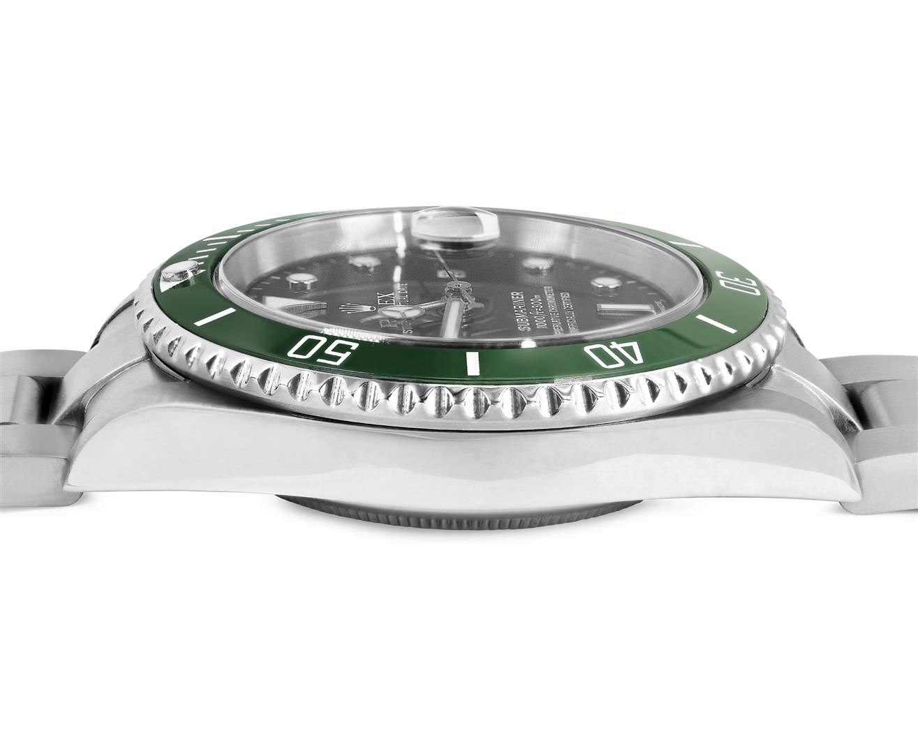 One Mens Pre Owned Rolex Stainless Steel Submariner With Date Polished, Serviced & Electronically Tested, Rolex Stainless Steel Case: 40mm, Rolex Stainless Steel Crown, Rolex Bezel: Stainless Steel Rotatable Bezel. Custom Bezel Insert: New Custom Green Ceramic Insert. Crystal: Sapphire With Magnified Date Window. Rolex Movement: Automatic Winding Movement Caliber 3135. Rolex Dial: Black Submariner Dial with Luminous Index Hour Markers And Dash Track. Date Window: 3 O'Clock Position Date Display, Model: Date No Holes Submariner, Quickset, Condition: G-6 Extra Fine. Rolex Bracelet: Stainless Steel Oyster Band. Bright Polish & Satin Finish. 7.0 Inch Length, Adjustable. Fold Clasp, With Rolex Logo. This Watch Comes With A Rolex Box.