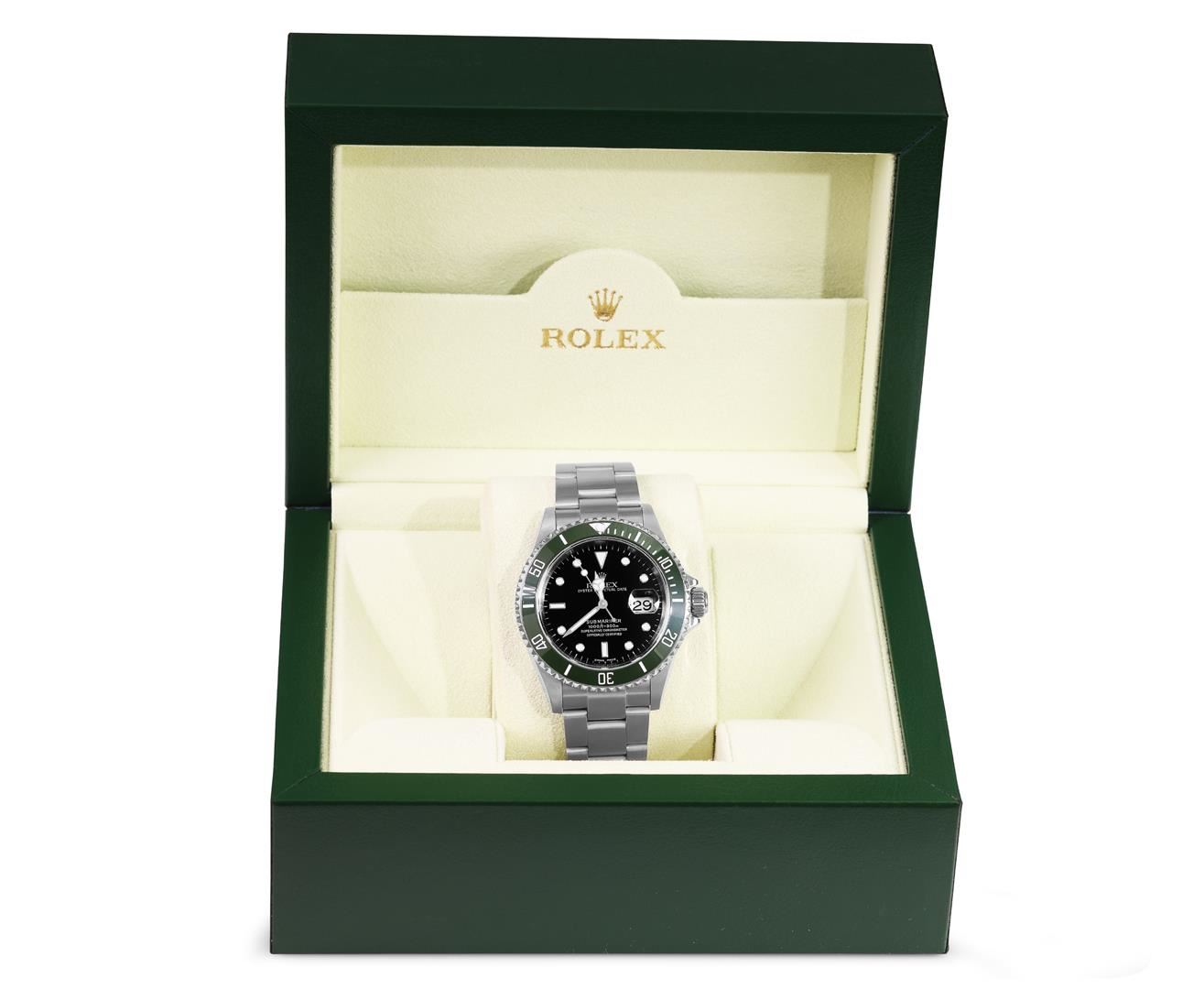 One Mens Pre Owned Rolex Stainless Steel Submariner With Date Polished, Serviced & Electronically Tested, Rolex Stainless Steel Case: 40mm, Rolex Stainless Steel Crown, Rolex Bezel: Stainless Steel Rotatable Bezel. Custom Bezel Insert: New Custom Green Ceramic Insert. Crystal: Sapphire With Magnified Date Window. Rolex Movement: Automatic Winding Movement Caliber 3135. Rolex Dial: Black Submariner Dial with Luminous Index Hour Markers And Dash Track. Date Window: 3 O'Clock Position Date Display, Model: Date No Holes Submariner, Quickset, Condition: G-6 Extra Fine. Rolex Bracelet: Stainless Steel Oyster Band. Bright Polish & Satin Finish. 7.0 Inch Length, Adjustable. Fold Clasp, With Rolex Logo. This Watch Comes With A Rolex Box.