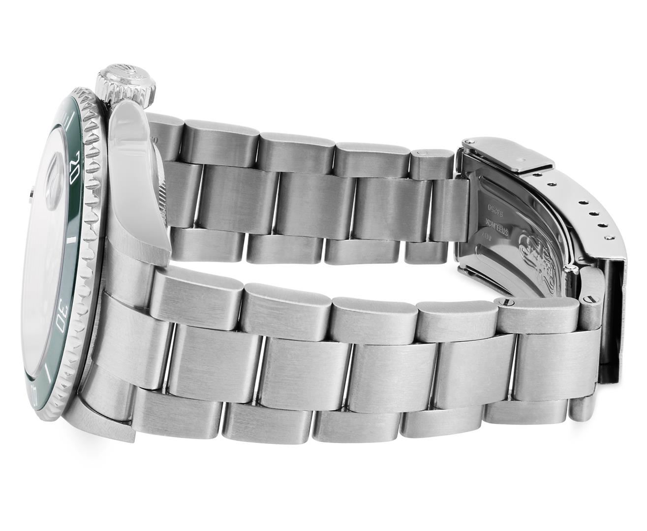One Mens Pre Owned Rolex Stainless Steel Submariner With Date Polished, Serviced & Electronically Tested, Rolex Stainless Steel Case: 40mm, Rolex Stainless Steel Crown, Rolex Bezel: Stainless Steel Rotatable Bezel. Custom Bezel Insert: New Custom Green Ceramic Insert. Crystal: Sapphire With Magnified Date Window. Rolex Movement: Automatic Winding Movement Caliber 3135. Rolex Dial: Black Submariner Dial with Luminous Index Hour Markers And Dash Track. Date Window: 3 O'Clock Position Date Display, Model: Date No Holes Submariner, Quickset, Condition: G-6 Extra Fine. Rolex Bracelet: Stainless Steel Oyster Band. Bright Polish & Satin Finish. 7.0 Inch Length, Adjustable. Fold Clasp, With Rolex Logo. This Watch Comes With A Rolex Box.