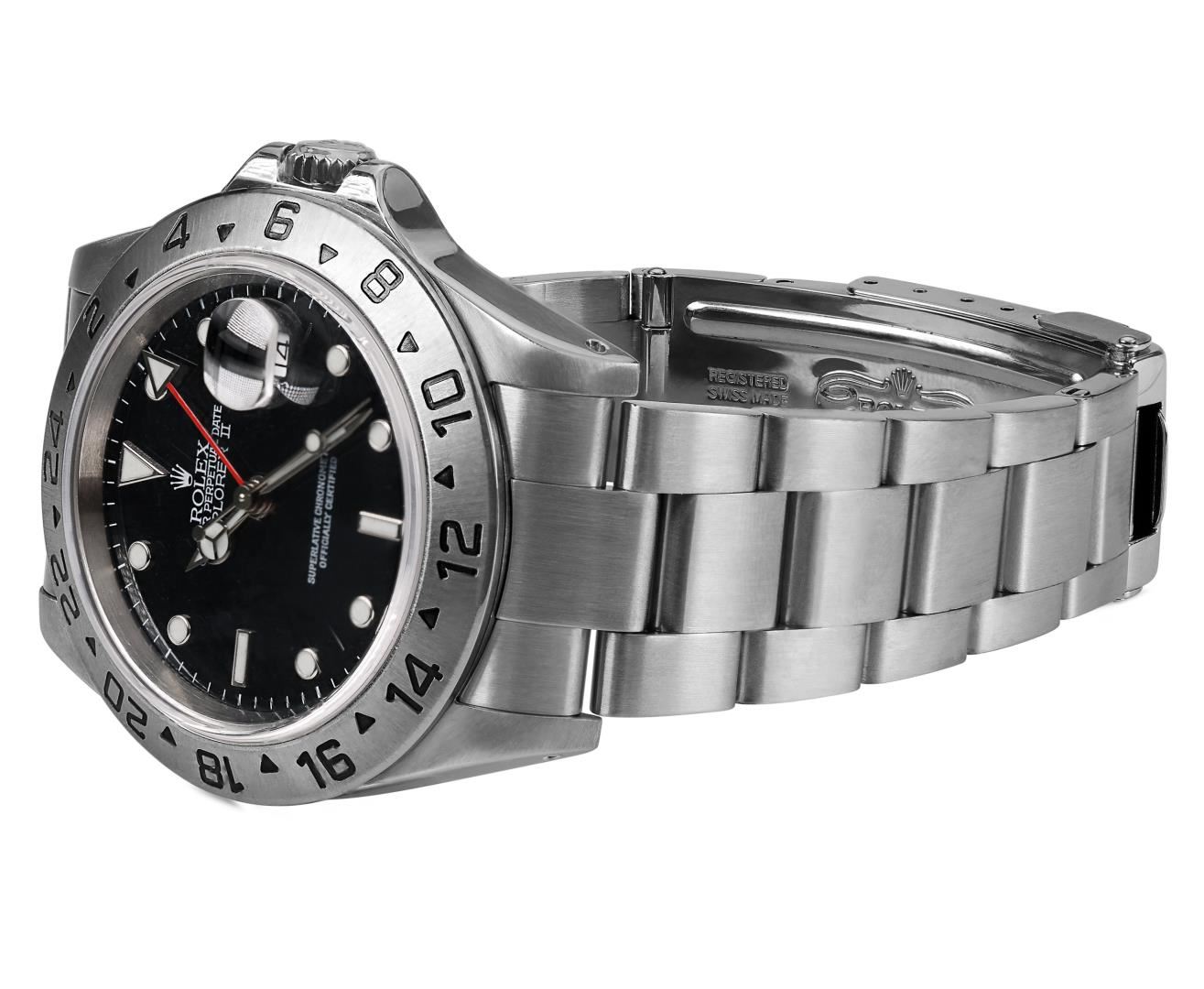 One Mens Pre Owned Stainless Steel Rolex Explorer II Polished, Serviced & Electronically Tested, Rolex Stainless Steel Case: 40mm, Rolex Stainless Steel Crown, Rolex Bezel: Stainless Steel Rolex Bezel. Crystal: Sapphire With Magnified Date Window. Rolex Movement: Automatic Winding Movement Caliber 3186. Rolex Dial: Black Explorer II Dial with Luminous Index Hour Markers And Dash Track. Date Window: 3 O'Clock Position Date Display, Model: Date Explorer 2, Quickset, Dial Time Watch, Condition: G-6 Extra Fine. Rolex Bracelet: Stainless Steel Oyster Band. Bright Polish & Satin Finish. 7.0 Inch Length, Adjustable. Fold Clasp, With Rolex Logo. This Watch Comes With A Rolex Box.