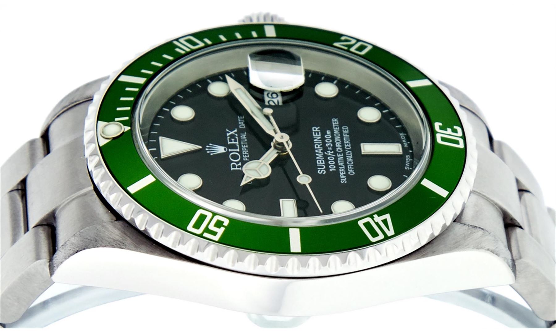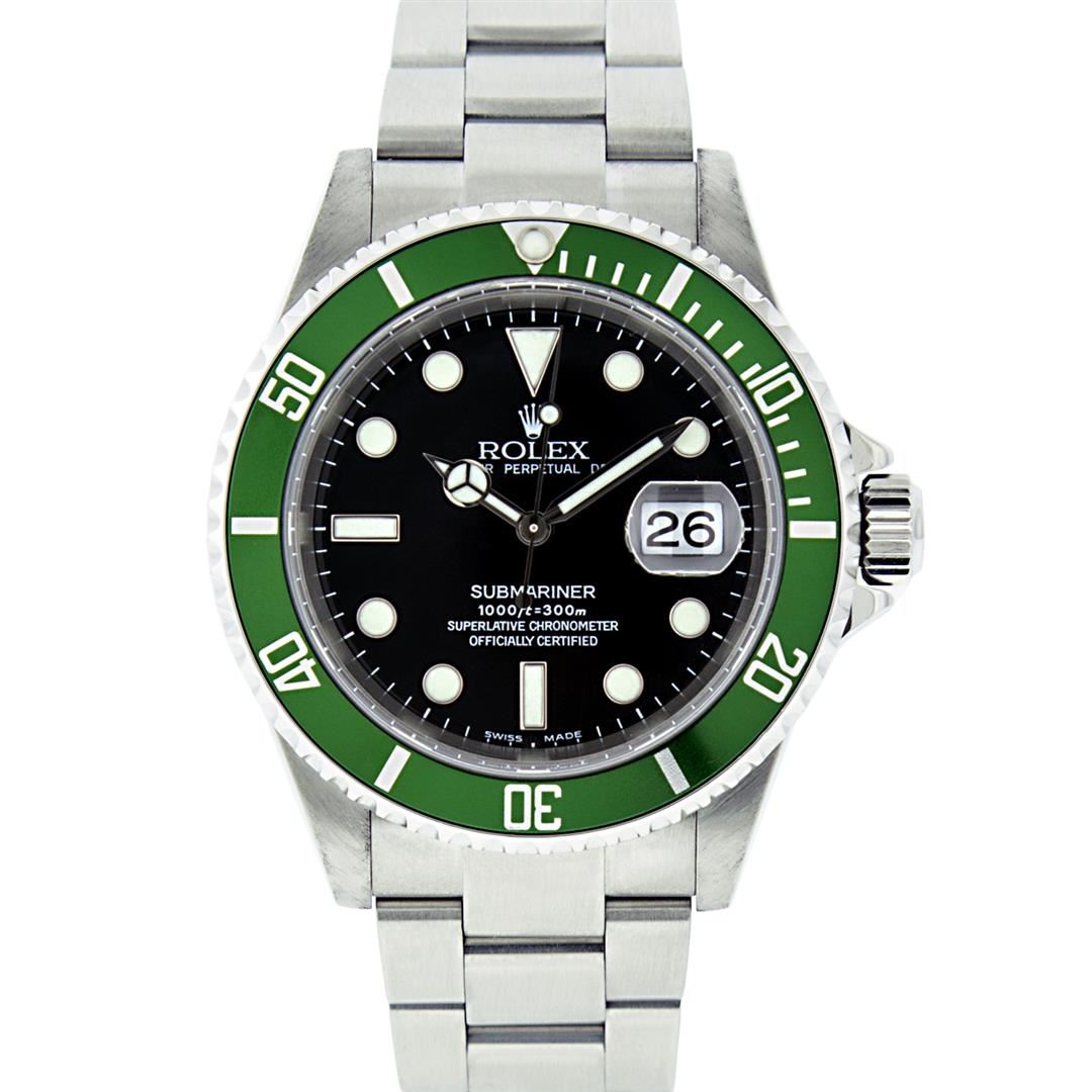 One Mens Pre Owned Rolex Anniversary Edition Stainless Steel Submariner "Kermit" With Date Polished, Serviced & Electronically Tested, Rolex Stainless Steel Case: 40mm, Rolex Stainless Steel Crown, Rolex Bezel: Stainless Steel Rotatable Bezel With Green I