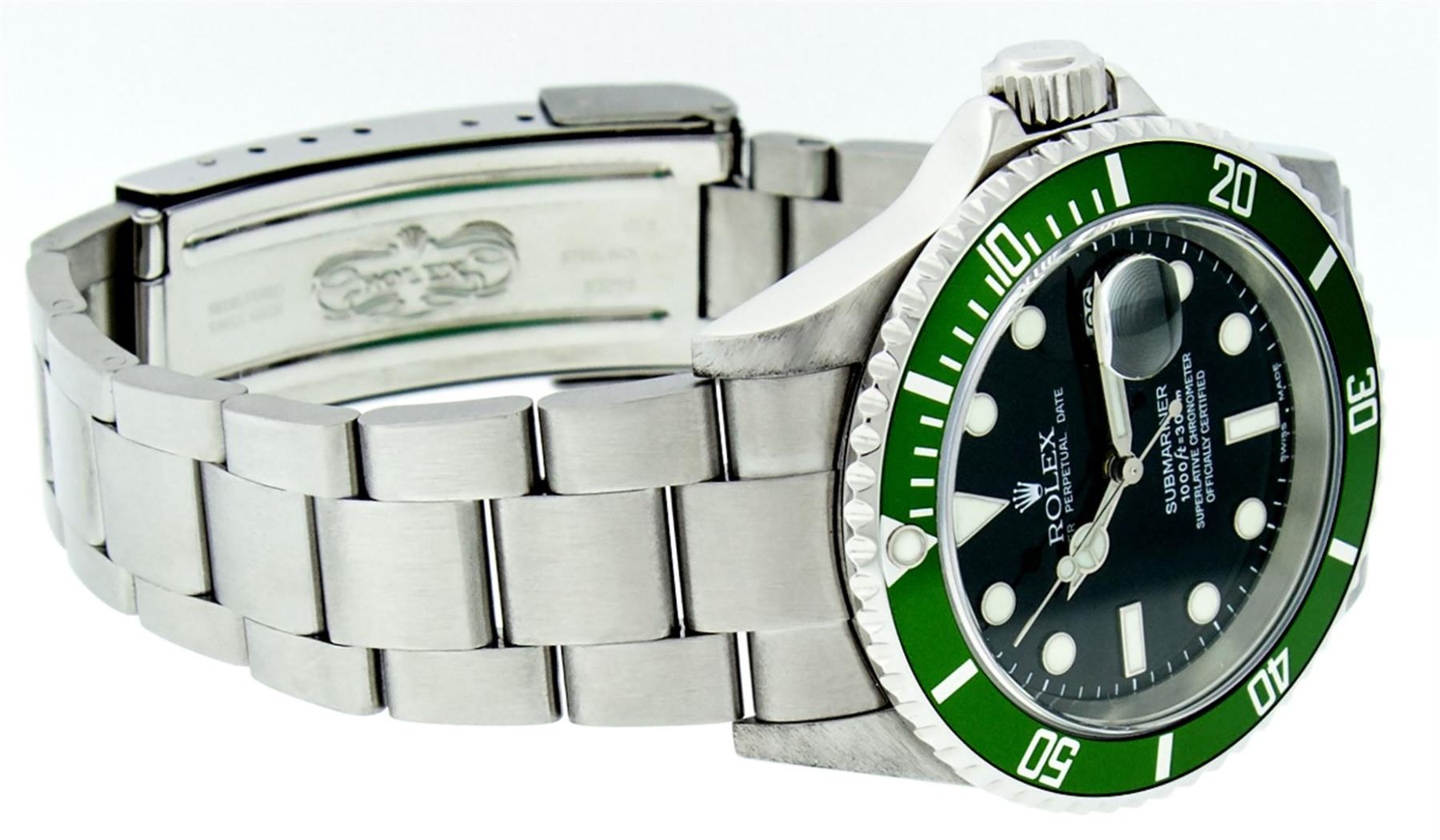One Mens Pre Owned Rolex Anniversary Edition Stainless Steel Submariner "Kermit" With Date Polished, Serviced & Electronically Tested, Rolex Stainless Steel Case: 40mm, Rolex Stainless Steel Crown, Rolex Bezel: Stainless Steel Rotatable Bezel With Green Insert. Crystal: Sapphire With Magnified Date Window. Rolex Movement: Automatic Winding Movement Caliber 3135. Rolex Dial: Black Submariner Dial, Hands: Submariner Hands. Date Window: 3 O'Clock Position Date Display, Model: Submariner, Quickset, Condition: G-6 Extra Fine. Rolex Bracelet: Stainless Steel Oyster Band. Bright Polish & Satin Finish. 7.0 Inch Length, Adjustable. Standard Clasp, With Rolex Logo.