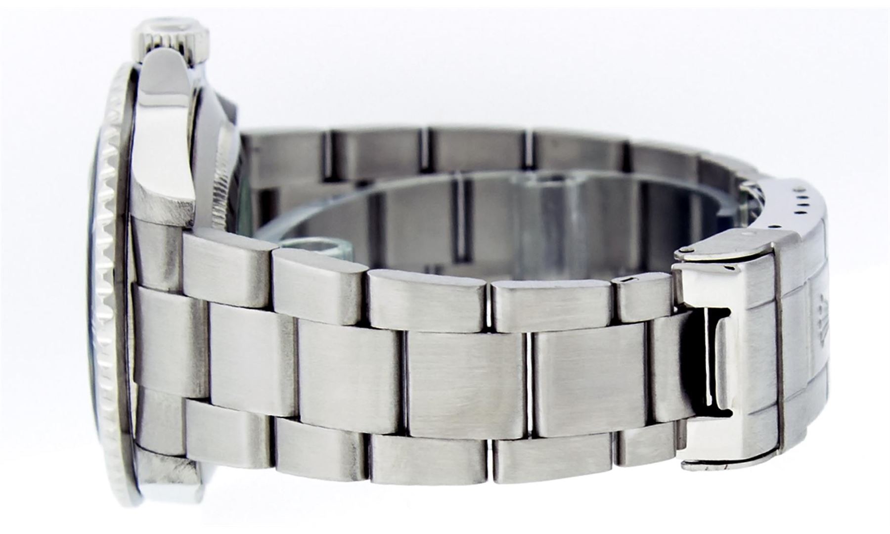 One Mens Pre Owned Rolex Anniversary Edition Stainless Steel Submariner "Kermit" With Date Polished, Serviced & Electronically Tested, Rolex Stainless Steel Case: 40mm, Rolex Stainless Steel Crown, Rolex Bezel: Stainless Steel Rotatable Bezel With Green Insert. Crystal: Sapphire With Magnified Date Window. Rolex Movement: Automatic Winding Movement Caliber 3135. Rolex Dial: Black Submariner Dial, Hands: Submariner Hands. Date Window: 3 O'Clock Position Date Display, Model: Submariner, Quickset, Condition: G-6 Extra Fine. Rolex Bracelet: Stainless Steel Oyster Band. Bright Polish & Satin Finish. 7.0 Inch Length, Adjustable. Standard Clasp, With Rolex Logo.