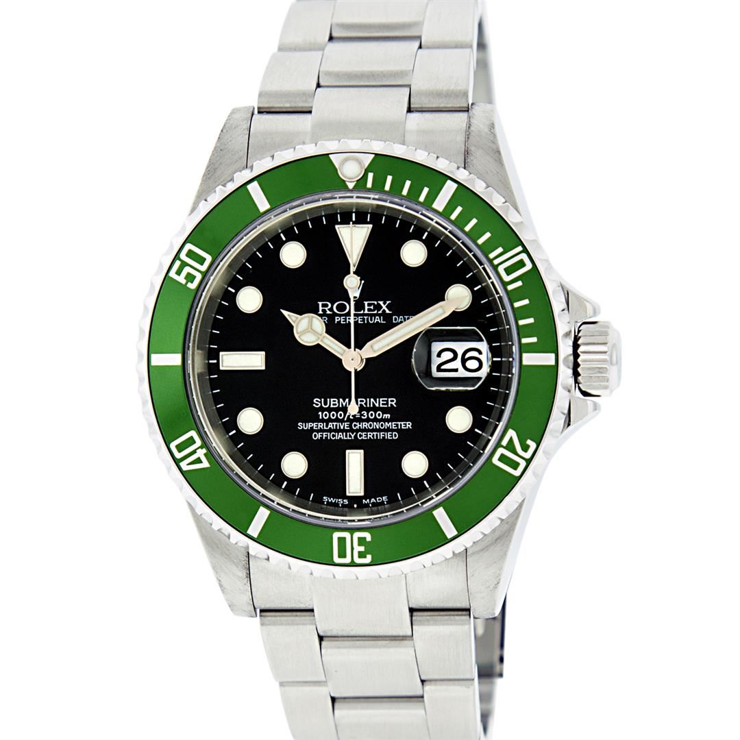 One Mens Pre Owned Rolex Anniversary Edition Stainless Steel Submariner "Kermit" With Date Polished, Serviced & Electronically Tested, Rolex Stainless Steel Case: 40mm, Rolex Stainless Steel Crown, Rolex Bezel: Stainless Steel Rotatable Bezel With Green Insert. Crystal: Sapphire With Magnified Date Window. Rolex Movement: Automatic Winding Movement Caliber 3135. Rolex Dial: Black Submariner Dial, Hands: Submariner Hands. Date Window: 3 O'Clock Position Date Display, Model: Submariner, Quickset, Condition: G-6 Extra Fine. Rolex Bracelet: Stainless Steel Oyster Band. Bright Polish & Satin Finish. 7.0 Inch Length, Adjustable. Standard Clasp, With Rolex Logo.