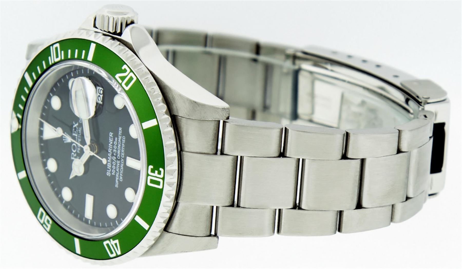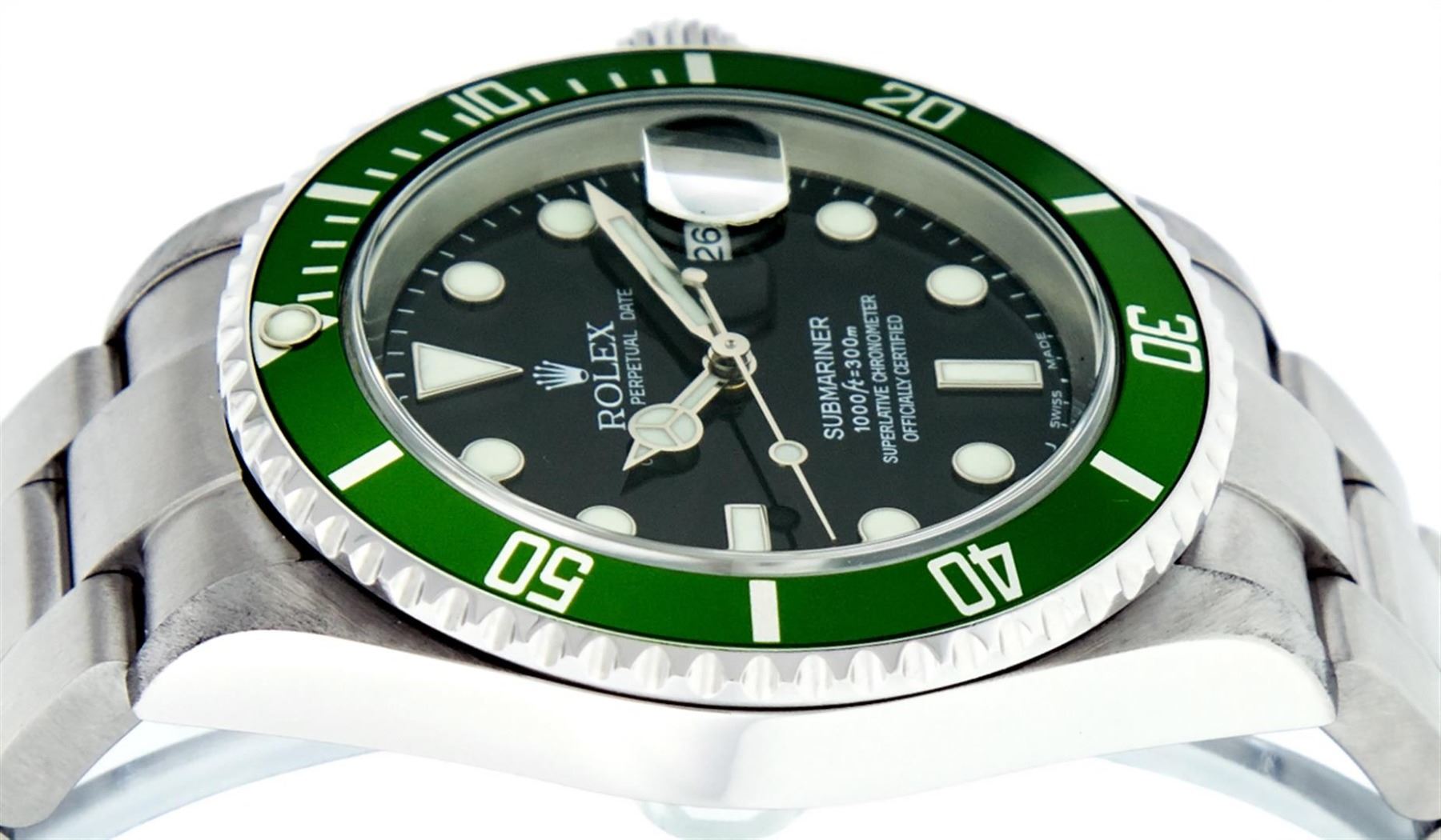 One Mens Pre Owned Rolex Anniversary Edition Stainless Steel Submariner "Kermit" With Date Polished, Serviced & Electronically Tested, Rolex Stainless Steel Case: 40mm, Rolex Stainless Steel Crown, Rolex Bezel: Stainless Steel Rotatable Bezel With Green Insert. Crystal: Sapphire With Magnified Date Window. Rolex Movement: Automatic Winding Movement Caliber 3135. Rolex Dial: Black Submariner Dial, Hands: Submariner Hands. Date Window: 3 O'Clock Position Date Display, Model: Submariner, Quickset, Condition: G-6 Extra Fine. Rolex Bracelet: Stainless Steel Oyster Band. Bright Polish & Satin Finish. 7.0 Inch Length, Adjustable. Standard Clasp, With Rolex Logo.