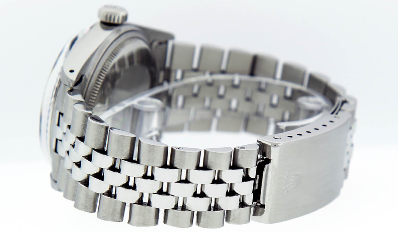 One Mens Stainless Steel Rolex Datejust Polished Bright with Satin Finish, This Watch Has Been Serviced & Electronically Tested, Stainless Steel Case: 36mm, Stainless Steel Crown, Original Bezel: 14K White Gold Fluted Bezel. Custom Crystal: New Acrylic Cyclops Lens. Custom Hands: New Luminescent Hands. Movement: Automatic Winding Movement Caliber 3035. Custom Dial: Black Diamond Dial With Diamond Hour Markers, Diamond Count: 10 Diamonds in Dial G To H In Color, SI-VS Clarity. Date Window: 3 O'Clock Position Date Display, Quickset, Model: Datejust, Condition: G-6 Extra Fine. Bracelet: Stainless Steel Jubilee. Bright Polish & Satin Finish. 7.0 Inch Length, Adjustable. Standard Clasp, With Rolex Logo. This Watch Has Been Serviced Time Tested And Is In Excellent Condition It Is Free Of All Scratches And Dents