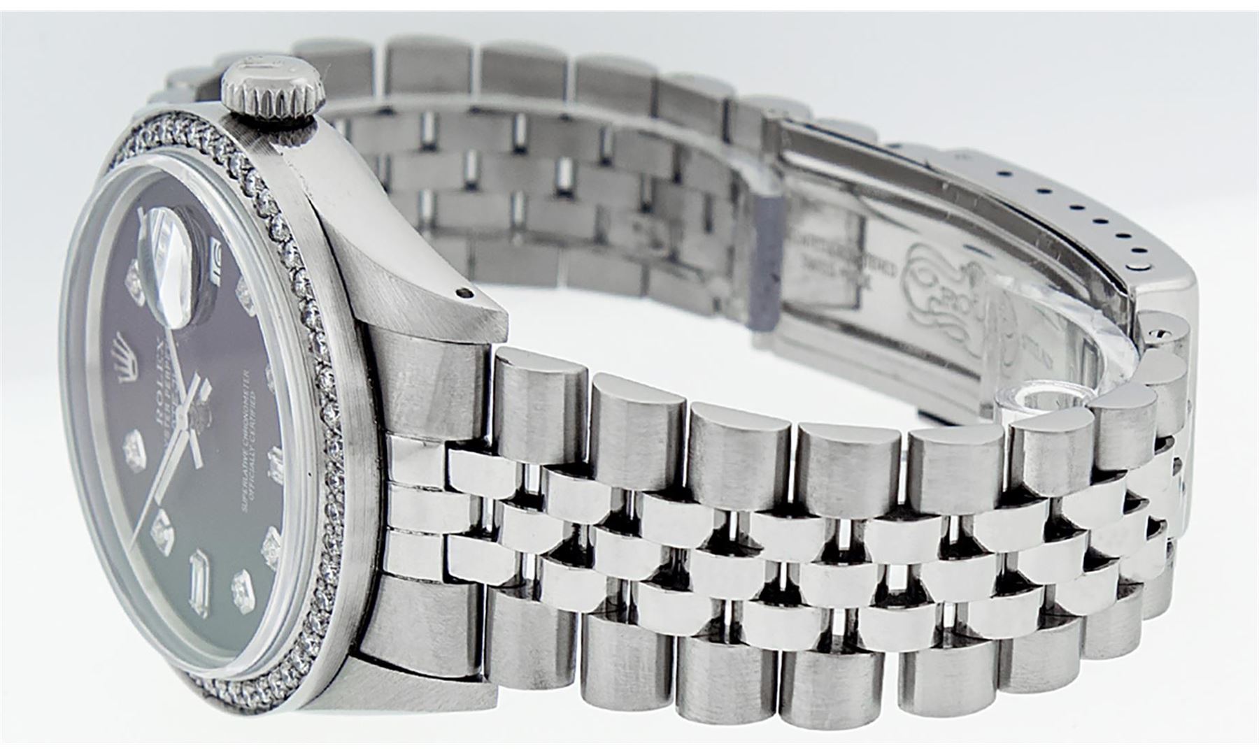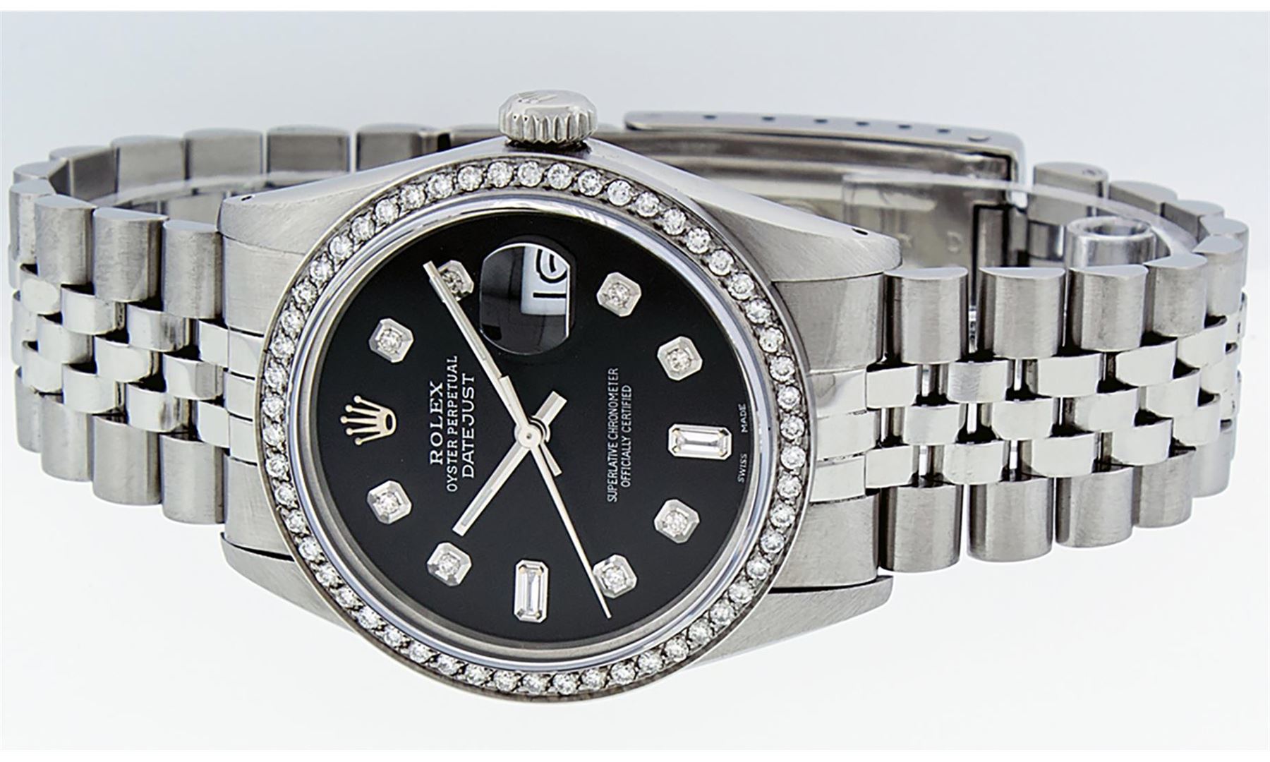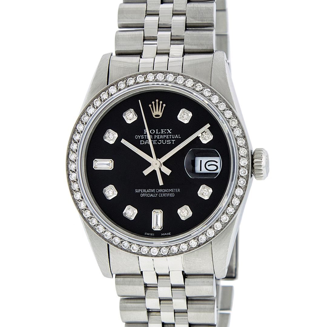 One Mens Rolex Stainless Steel Datejust Polished Bright with Satin Finish, This Watch Has Been Serviced & Electronically Tested, Stainless Steel Case: 36mm, Stainless Steel Crown, Custom Bezel: New Stainless Steel Beadset Diamond Bezel, Diamond Count: 54 Diamonds In Bezel, Total Weight 1.00 Carat, Clarity: SI-VS, Color: G to H. Custom Crystal: New Scratch Resistant Synthetic Sapphire Cyclops Lens. Custom Hands: New Luminescent Hands. Movement: Automatic Winding Movement Caliber 3035. Custom Dial: Black Diamond Dial, Diamond Count: 8 + 2 Baguette Diamonds In Dial, Color: G to H, Clarity: VS2-SI1. Date Window: 3 O'Clock Position Date Display, Quickset, Model: Datejust. Condition: G-6 Extra Fine. Bracelet: Stainless Steel Jubilee Band. Bright Polish & Satin Finish. 7.0 Inch Length, Adjustable. Standard Clasp, With Rolex Logo. This Watch Has Been Serviced Time Tested And Is In Excellent Condition It Is Free Of All Scratches And Dents.