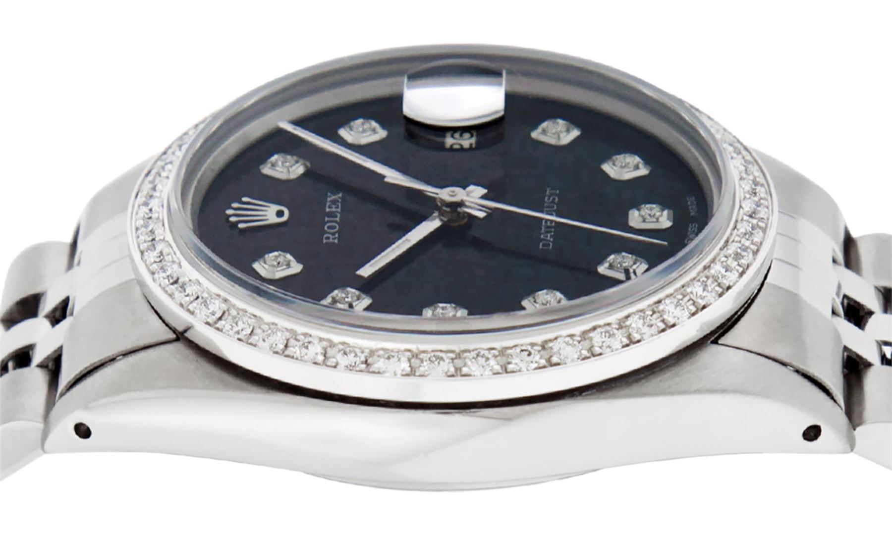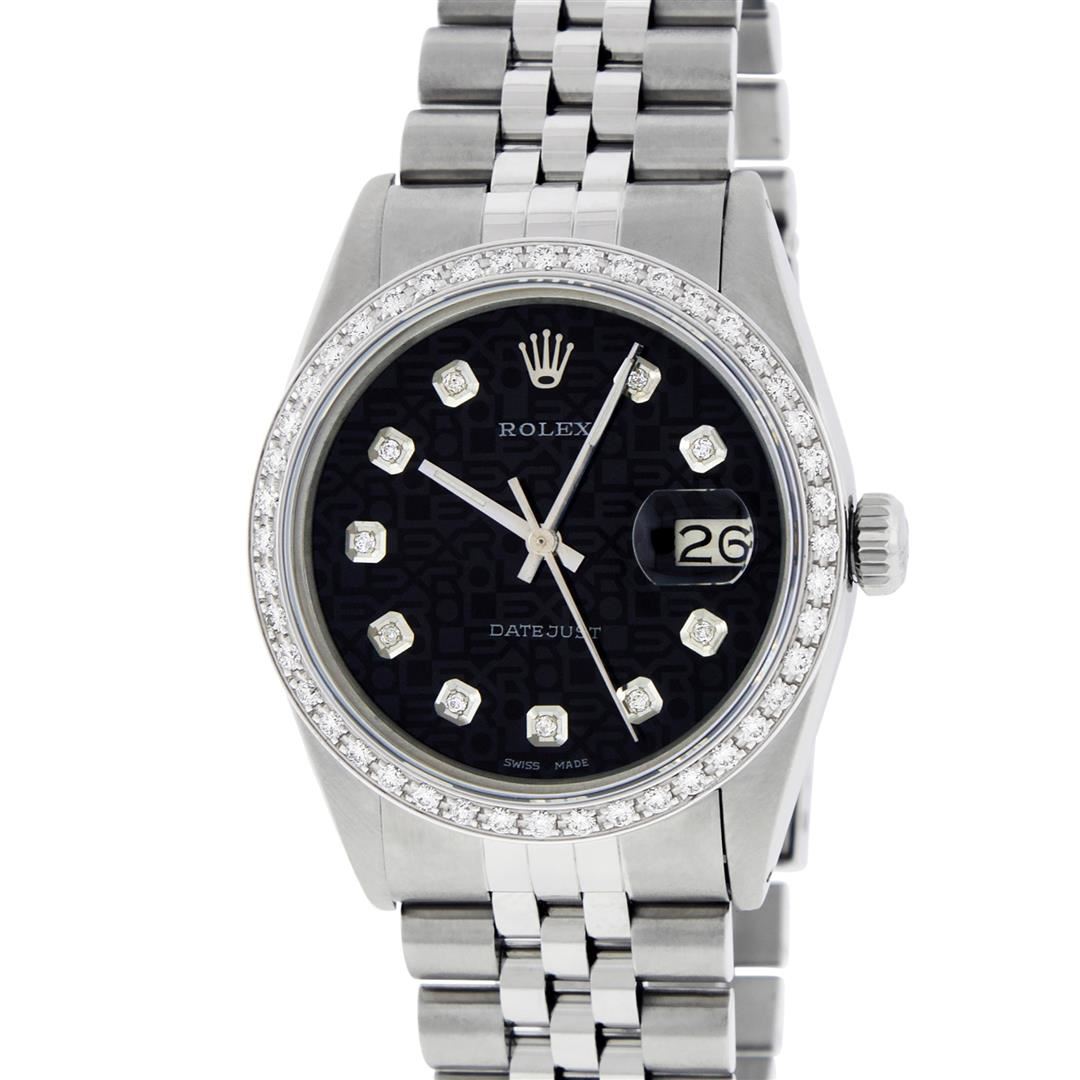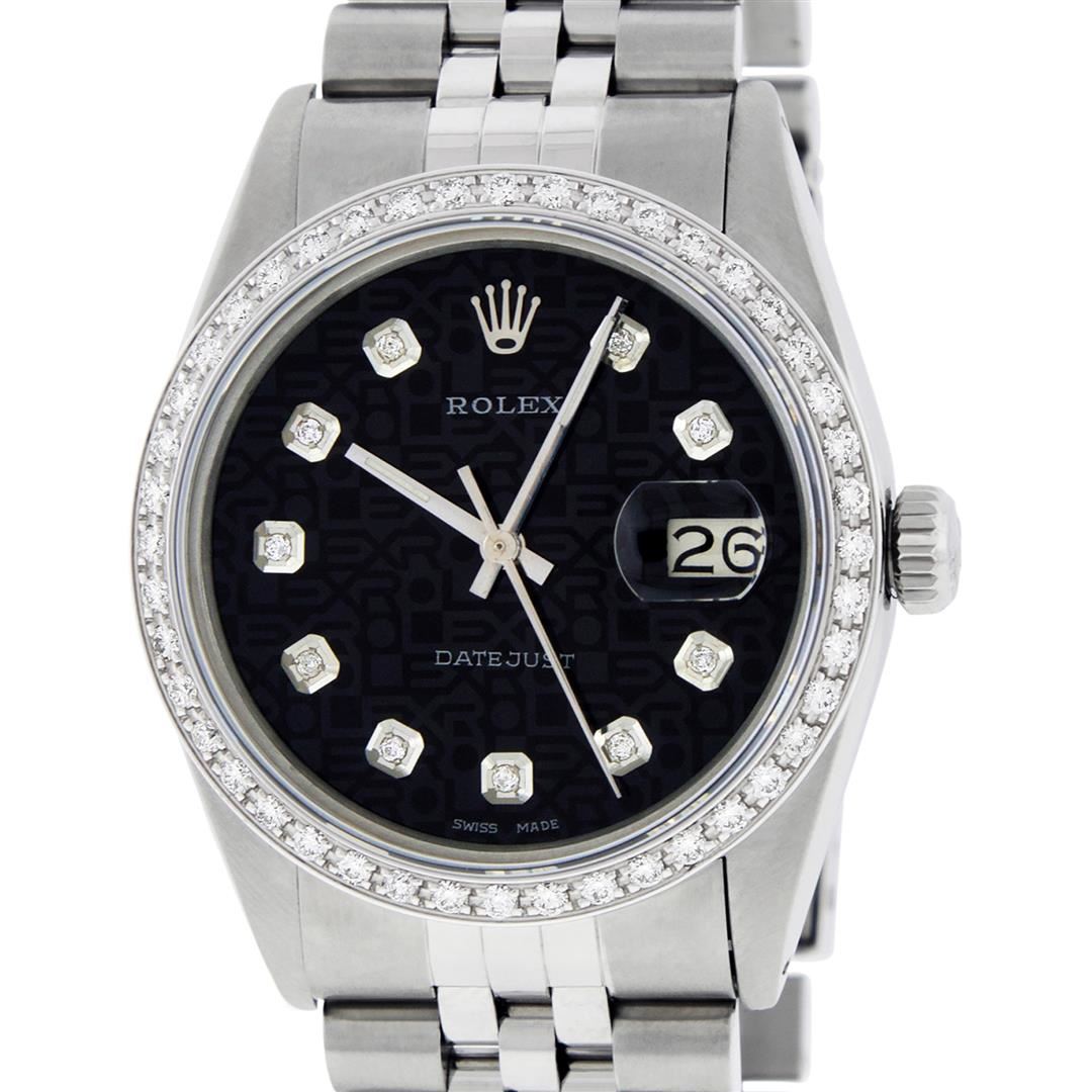 One Mens Stainless Steel Rolex Datejust Polished, Serviced & Electronically Tested, Stainless Steel Case: 36mm, Stainless Steel Crown, New Custom Bezel: 18K White Gold Beadset Diamond Bezel, Diamond Count: 44 Diamonds. Total Bezel Weight 1.00 Carat, Clarity: SI-VS, Color: G to H. Custom Crystal: New Scratch Resistant Synthetic Sapphire Cyclops Lens. Custom Hands: New Luminescent Hands. Movement: Automatic Winding Movement. Custom Refinished Dial: Black Jubilee With Diamond Hour Markers, Stone Count: 10 Diamond In Dial. G To H In Color, Clarity: SI-VS. Date Window: 3 O'Clock Position Date Display, Quickset, Model: Datejust. Condition: G-6 Extra Fine. Bracelet: Stainless Steel Jubilee. Bright Polish & Satin Finish. 7.0 Inch Length, Adjustable. Standard Clasp, With Rolex Logo. This Watch Has Been Serviced Time Tested And Is In Excellent Condition It Is Free Of All Scratches And Dents.