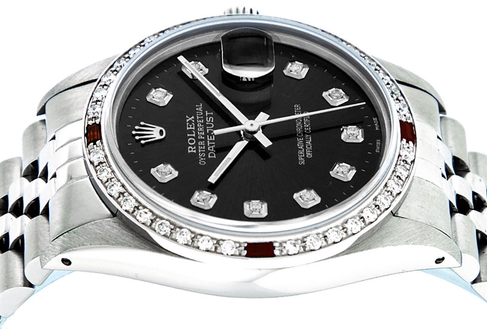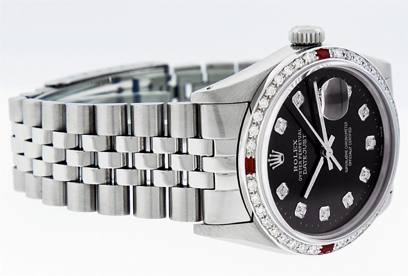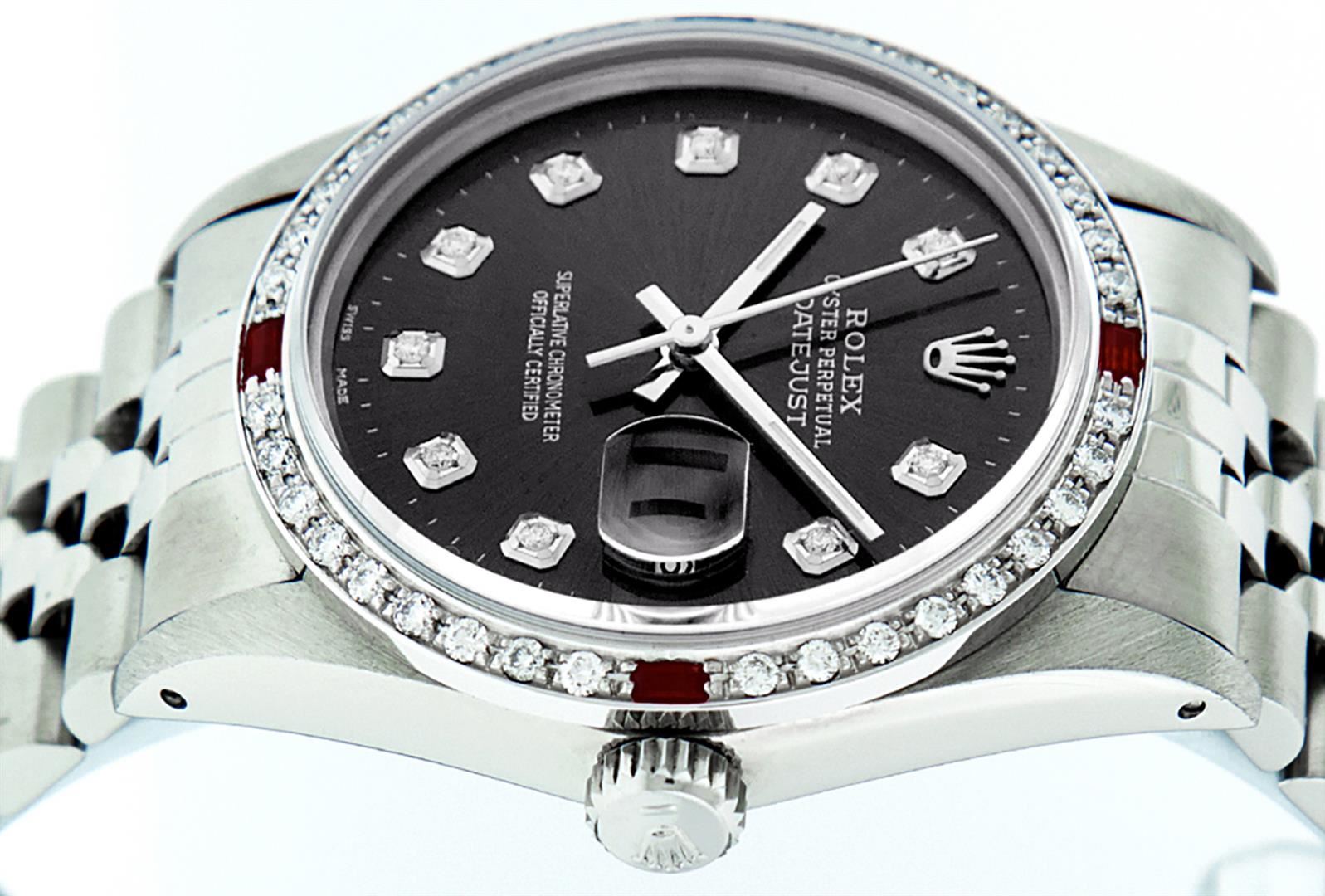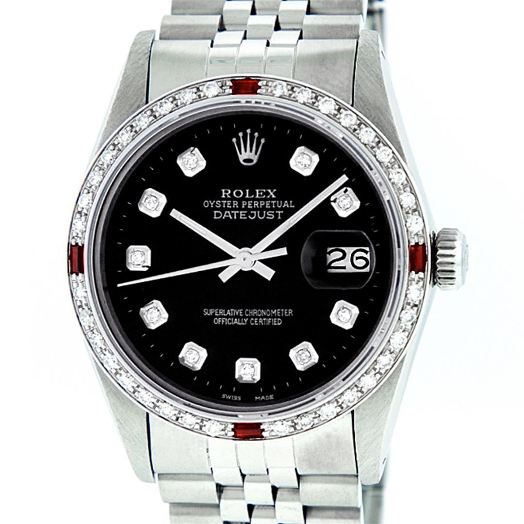 One Mens Stainless Steel Rolex Datejust Polished, Serviced & Electronically Tested, Stainless Steel Case: 36mm, Stainless Steel Crown, Custom Bezel: New 18K White Gold Ruby Beadset Diamond Bezel, Diamond + Gem Count: 36 Diamonds + 4 Rubies, Total Weight 1.00 Carat, Clarity: SI-VS, Color: G to H. Custom Crystal: New Scratch Resistant Synthetic Sapphire Cyclops Lens. Custom Hands: New Luminescent Hands. Movement: Automatic Winding Movement Caliber 3035. Custom Dial: Black Diamond Dial With Dash Track, 10 Diamonds in Dial, G To H In Color, Clarity: SI-VS. Date Window: 3 O'Clock Position Date Display, Quickset, Model: Datejust. Condition: G-6 Extra Fine. Bracelet: Stainless Steel Jubilee Band. Bright Polish & Satin Finish. 7.0 Inch Length, Adjustable. Standard Clasp, With Rolex Logo. This Watch Has Been Serviced Time Tested And Is In Excellent Condition It Is Free Of All Scratches And Dents.