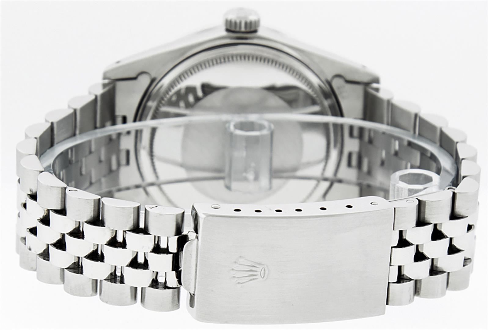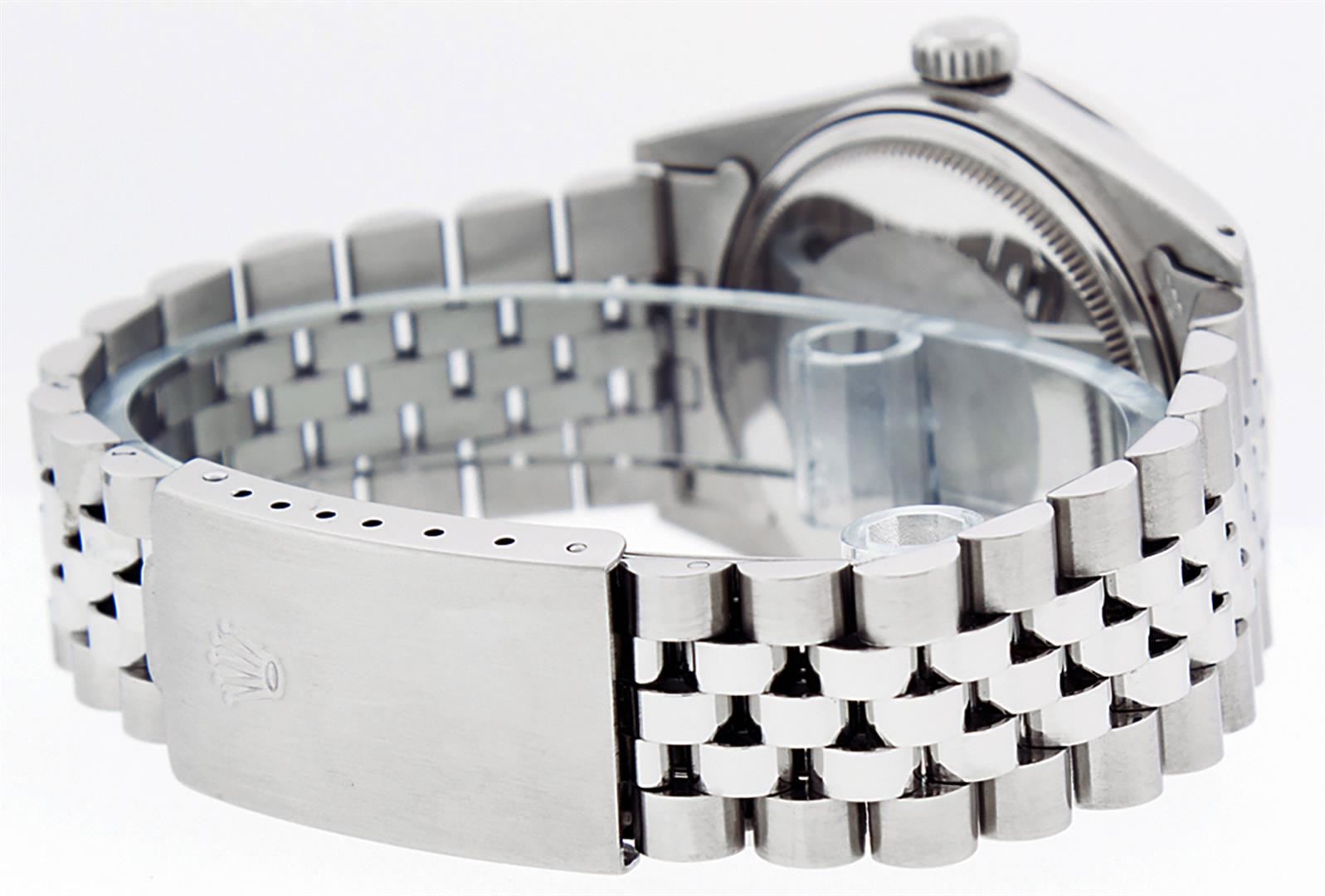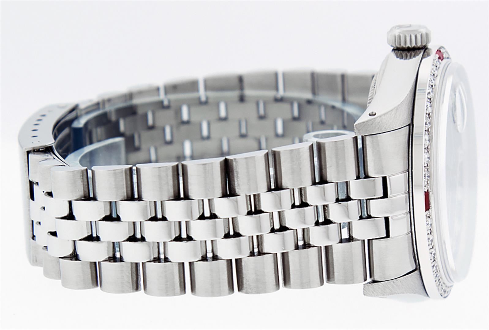 One Mens Stainless Steel Rolex Datejust Polished, Serviced & Electronically Tested, Stainless Steel Case: 36mm, Stainless Steel Crown, Custom Bezel: New 18K White Gold Ruby Beadset Diamond Bezel, Diamond + Gem Count: 36 Diamonds + 4 Rubies, Total Weight 1.00 Carat, Clarity: SI-VS, Color: G to H. Custom Crystal: New Scratch Resistant Synthetic Sapphire Cyclops Lens. Custom Hands: New Luminescent Hands. Movement: Automatic Winding Movement Caliber 3035. Custom Dial: Black Diamond Dial With Dash Track, 10 Diamonds in Dial, G To H In Color, Clarity: SI-VS. Date Window: 3 O'Clock Position Date Display, Quickset, Model: Datejust. Condition: G-6 Extra Fine. Bracelet: Stainless Steel Jubilee Band. Bright Polish & Satin Finish. 7.0 Inch Length, Adjustable. Standard Clasp, With Rolex Logo. This Watch Has Been Serviced Time Tested And Is In Excellent Condition It Is Free Of All Scratches And Dents.