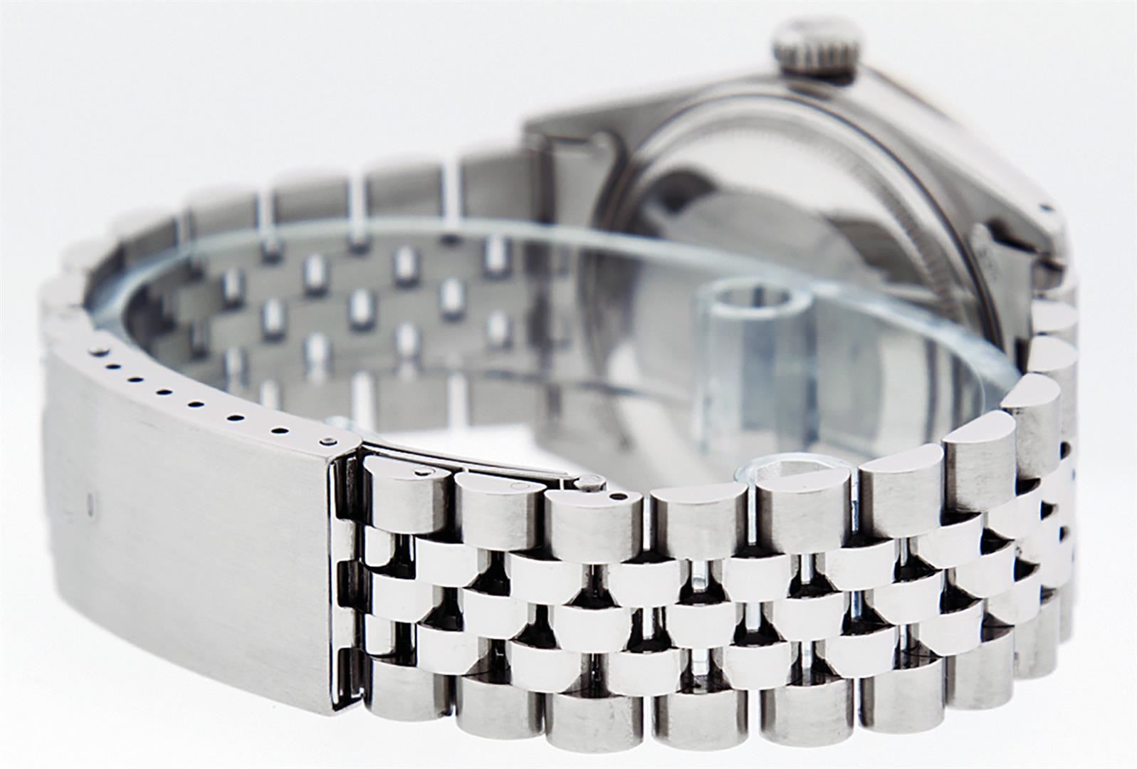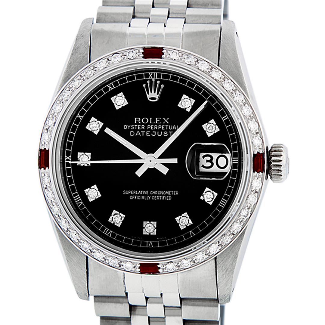One Mens Stainless Steel Rolex Datejust Polished, Serviced & Electronically Tested, Stainless Steel Case: 36mm, Stainless Steel Crown, Custom Bezel: New 18K White Gold Rubies Beadset Diamond Bezel, Diamond + Gem Count: 36 Diamonds + 4 Rubies, Total Weight 1.00 Carat, Clarity: SI-VS, Color: G to H. Custom Crystal: New Scratch Resistant Synthetic Sapphire Cyclops Lens. Custom Hands: New Luminescent Hands. Movement: Automatic Winding Movement Caliber 3035. Custom Dial: Black Diamond Dial, 10 Diamonds in Dial, G To H In Color, Clarity: SI-VS. Date Window: 3 O'Clock Position Date Display, Quickset, Model: Datejust. Condition: G-6 Extra Fine. Bracelet: Stainless Steel Jubilee Band. Bright Polish & Satin Finish. 7.0 Inch Length, Adjustable. Standard Clasp, With Rolex Logo. This Watch Has Been Serviced Time Tested And Is In Excellent Condition It Is Free Of All Scratches And Dents.