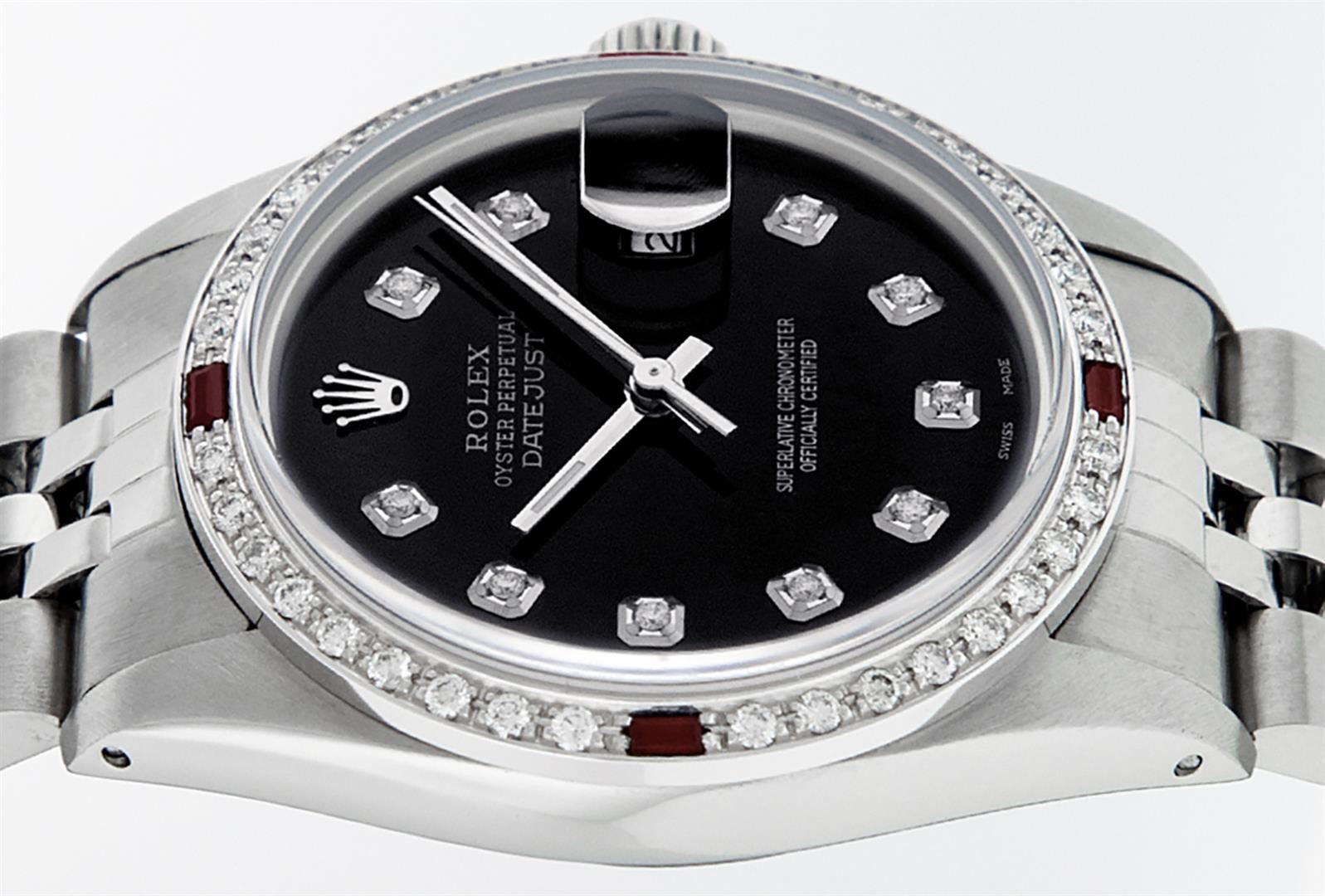 One Mens Stainless Steel Rolex Datejust Polished, Serviced & Electronically Tested, Stainless Steel Case: 36mm, Stainless Steel Crown, Custom Bezel: New 18K White Gold Ruby Beadset Diamond Bezel, Diamond + Gem Count: 36 Diamonds + 4 Rubies, Total Weight 1.00 Carat, Clarity: SI-VS, Color: G to H. Custom Crystal: New Scratch Resistant Synthetic Sapphire Cyclops Lens. Custom Hands: New Luminescent Hands. Movement: Automatic Winding Movement Caliber 3035. Custom Dial: Black Diamond Dial, 10 Diamonds in Dial, G To H In Color, Clarity: SI-VS. Date Window: 3 O'Clock Position Date Display, Quickset, Model: Datejust. Condition: G-6 Extra Fine. Bracelet: Stainless Steel Jubilee Band. Bright Polish & Satin Finish. 7.0 Inch Length, Adjustable. Standard Clasp, With Rolex Logo. This Watch Has Been Serviced Time Tested And Is In Excellent Condition It Is Free Of All Scratches And Dents.
