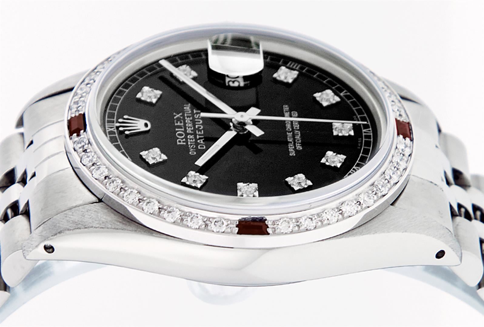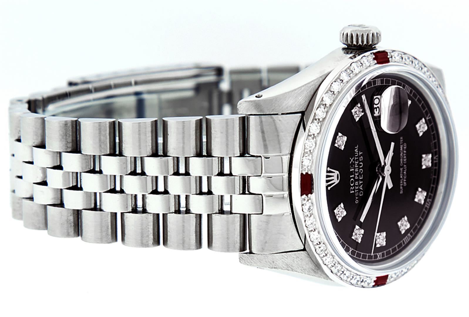 One Mens Stainless Steel Rolex Datejust Polished, Serviced & Electronically Tested, Stainless Steel Case: 36mm, Stainless Steel Crown, Custom Bezel: New 18K White Gold Rubies Beadset Diamond Bezel, Diamond + Gem Count: 36 Diamonds + 4 Rubies, Total Weight 1.00 Carat, Clarity: SI-VS, Color: G to H. Custom Crystal: New Scratch Resistant Synthetic Sapphire Cyclops Lens. Custom Hands: New Luminescent Hands. Movement: Automatic Winding Movement Caliber 3035. Custom Dial: Black Diamond Dial, 10 Diamonds in Dial, G To H In Color, Clarity: SI-VS. Date Window: 3 O'Clock Position Date Display, Quickset, Model: Datejust. Condition: G-6 Extra Fine. Bracelet: Stainless Steel Jubilee Band. Bright Polish & Satin Finish. 7.0 Inch Length, Adjustable. Standard Clasp, With Rolex Logo. This Watch Has Been Serviced Time Tested And Is In Excellent Condition It Is Free Of All Scratches And Dents.