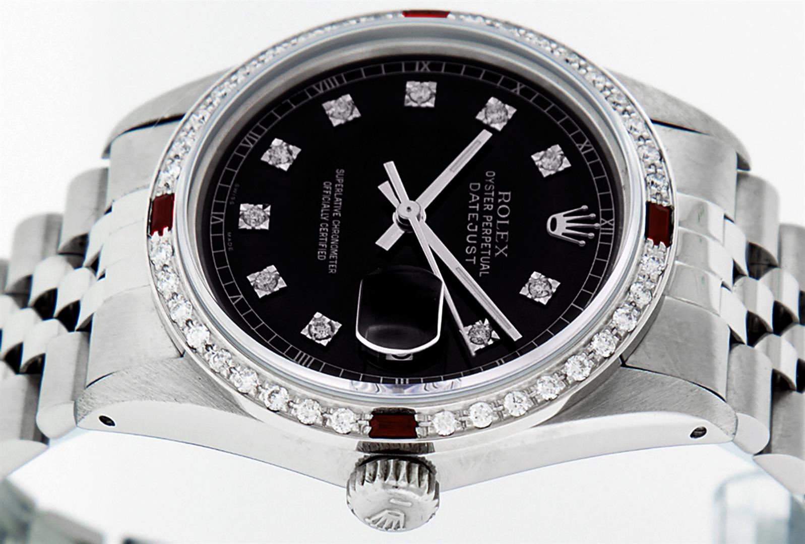 One Mens Stainless Steel Rolex Datejust Polished, Serviced & Electronically Tested, Stainless Steel Case: 36mm, Stainless Steel Crown, Custom Bezel: New 18K White Gold Rubies Beadset Diamond Bezel, Diamond + Gem Count: 36 Diamonds + 4 Rubies, Total Weight 1.00 Carat, Clarity: SI-VS, Color: G to H. Custom Crystal: New Scratch Resistant Synthetic Sapphire Cyclops Lens. Custom Hands: New Luminescent Hands. Movement: Automatic Winding Movement Caliber 3035. Custom Dial: Black Diamond Dial, 10 Diamonds in Dial, G To H In Color, Clarity: SI-VS. Date Window: 3 O'Clock Position Date Display, Quickset, Model: Datejust. Condition: G-6 Extra Fine. Bracelet: Stainless Steel Jubilee Band. Bright Polish & Satin Finish. 7.0 Inch Length, Adjustable. Standard Clasp, With Rolex Logo. This Watch Has Been Serviced Time Tested And Is In Excellent Condition It Is Free Of All Scratches And Dents.