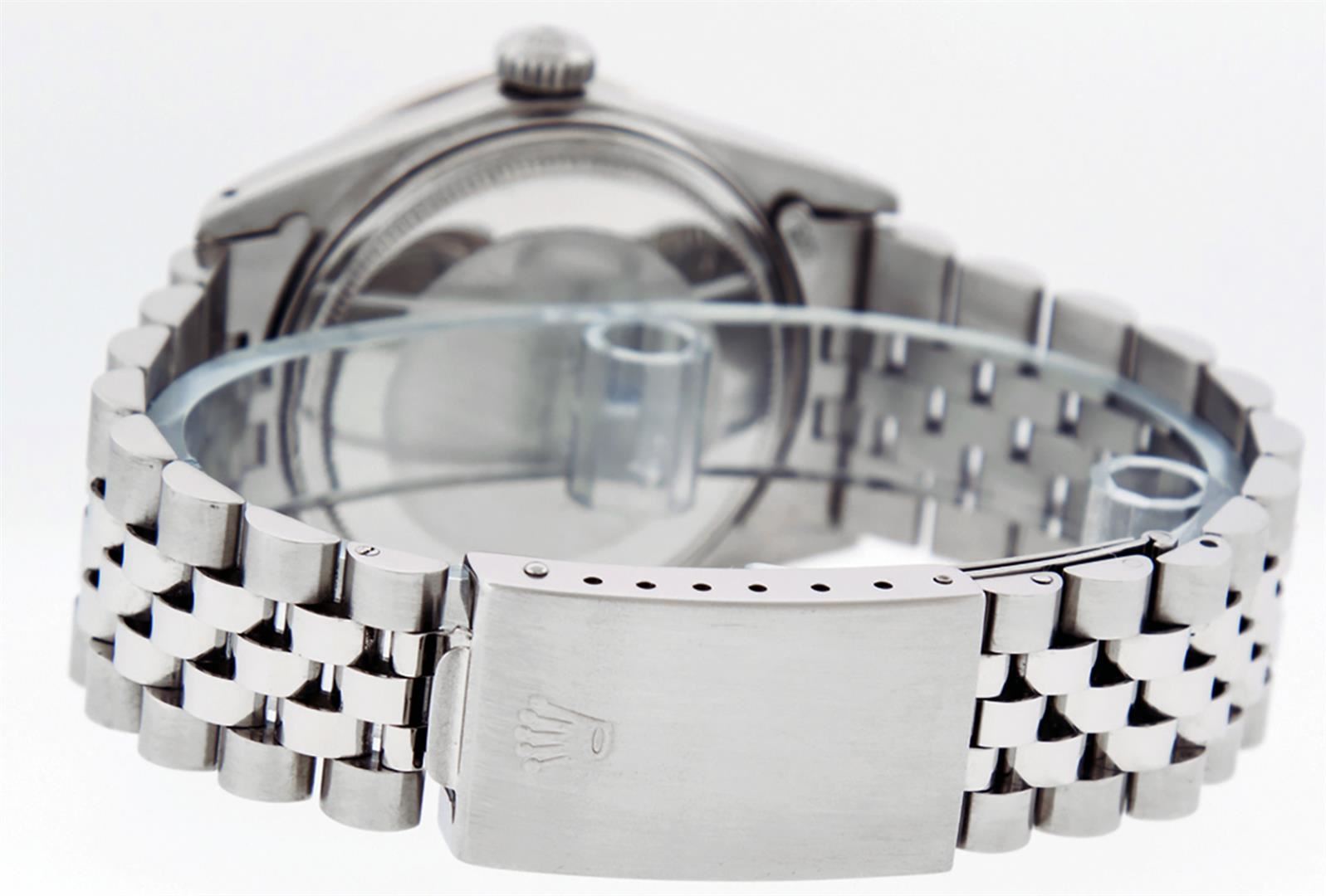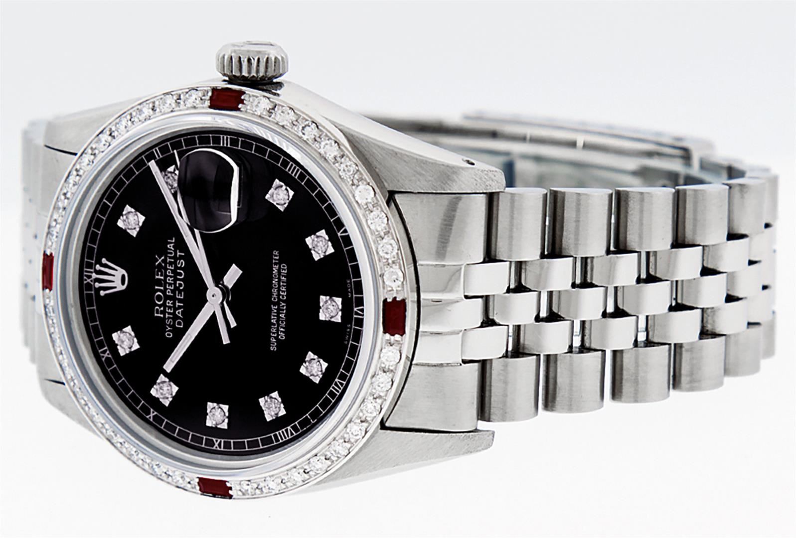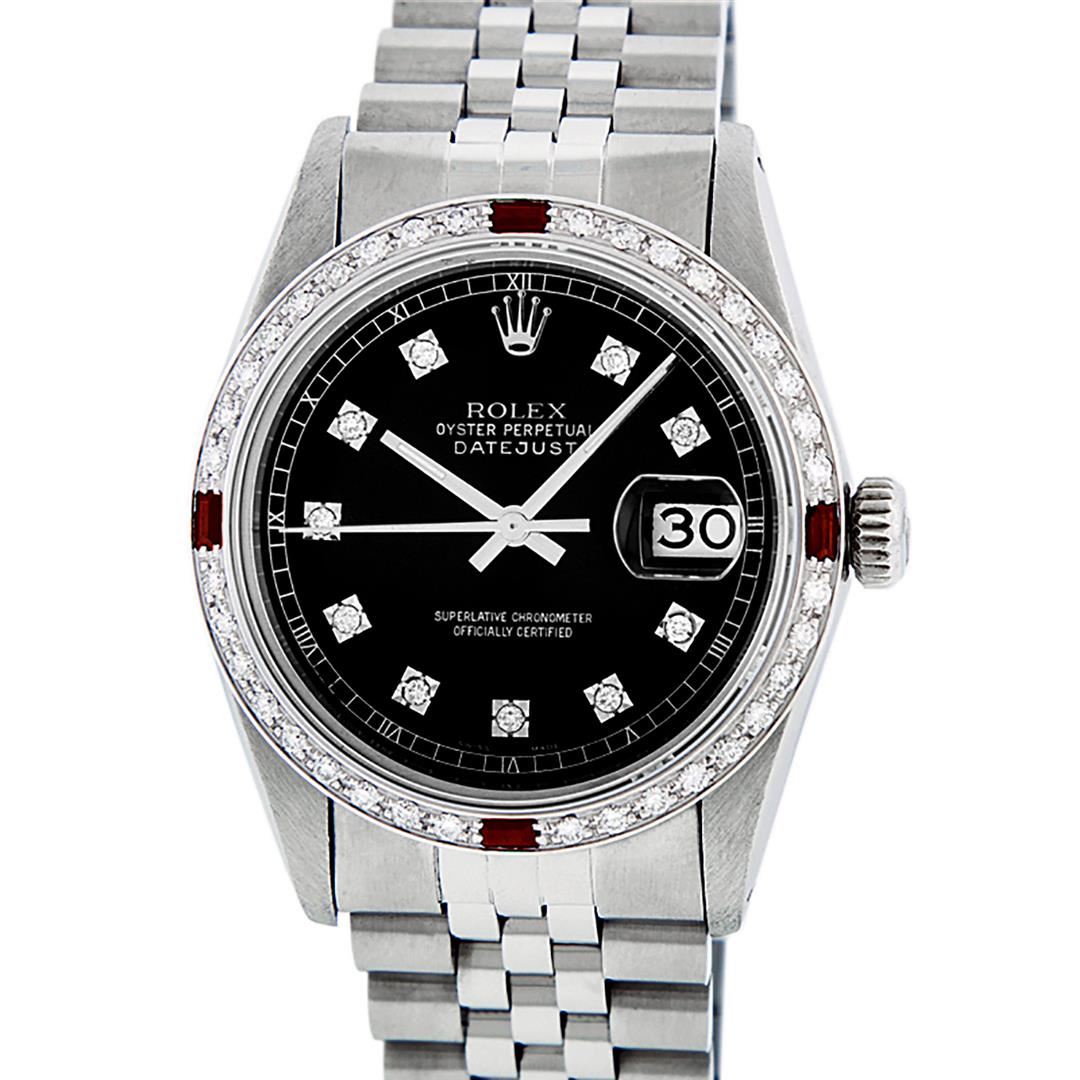 One Mens Stainless Steel Rolex Datejust Polished, Serviced & Electronically Tested, Stainless Steel Case: 36mm, Stainless Steel Crown, Custom Bezel: New 18K White Gold Rubies Beadset Diamond Bezel, Diamond + Gem Count: 36 Diamonds + 4 Rubies, Total Weight 1.00 Carat, Clarity: SI-VS, Color: G to H. Custom Crystal: New Scratch Resistant Synthetic Sapphire Cyclops Lens. Custom Hands: New Luminescent Hands. Movement: Automatic Winding Movement Caliber 3035. Custom Dial: Black Diamond Dial, 10 Diamonds in Dial, G To H In Color, Clarity: SI-VS. Date Window: 3 O'Clock Position Date Display, Quickset, Model: Datejust. Condition: G-6 Extra Fine. Bracelet: Stainless Steel Jubilee Band. Bright Polish & Satin Finish. 7.0 Inch Length, Adjustable. Standard Clasp, With Rolex Logo. This Watch Has Been Serviced Time Tested And Is In Excellent Condition It Is Free Of All Scratches And Dents.