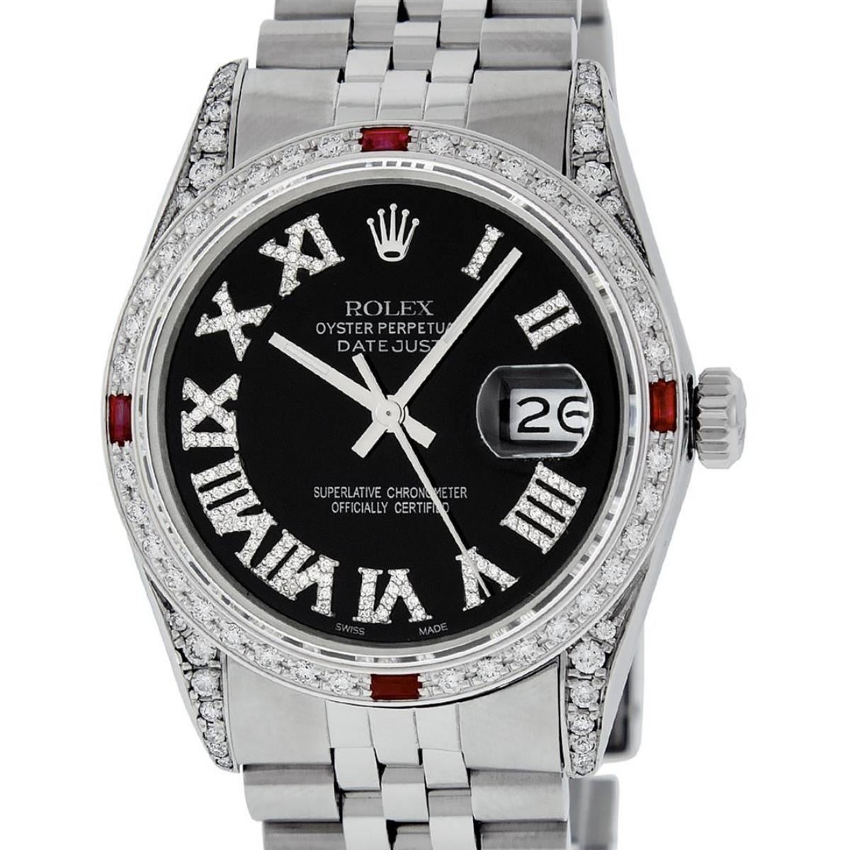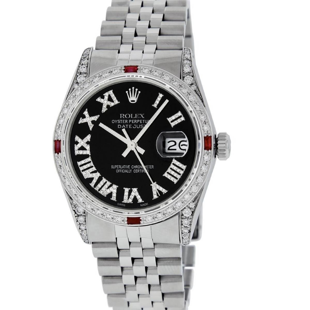 One Mens Stainless Steel Rolex Datejust Polished Bright with Satin Finish, Serviced & Electronically Tested, Stainless Steel Case: 36mm, Diamond Lugs: 24 Diamonds On Lugs, Color: G to H, Clarity: SI-VS. Stainless Steel Crown, New Custom Bezel: 18K White Gold Beadset + Ruby Diamond Bezel, Diamond Count: 36 Diamonds + 4 Rubies On Bezel, Total Bezel Weight 1.00 Carat, Clarity: SI-VS, Color: G to H. Custom Crystal: New Scratch Resistant Synthetic Sapphire Cyclops Lens. Movement: Automatic Winding Movement Caliber 3035. Custom Dial: Black Roman Diamond Dial, Diamond Color: G To H In Color, Clarity: SI-VS. Date Window: 3 O'Clock Position Date Display, Quickset, Model: Quickset Datejust, Condition: G-6 Extra Fine. Bracelet: Stainless Steel Jubilee Band. Bright Polish & Satin Finish. 7.0 Inch Length, Adjustable. Standard Clasp, With Rolex Logo. This Watch Has Been Serviced Time Tested And Is In Excellent Condition It Is Free Of All Scratches And Dents. This Watch Also Comes With A Rolex Box.