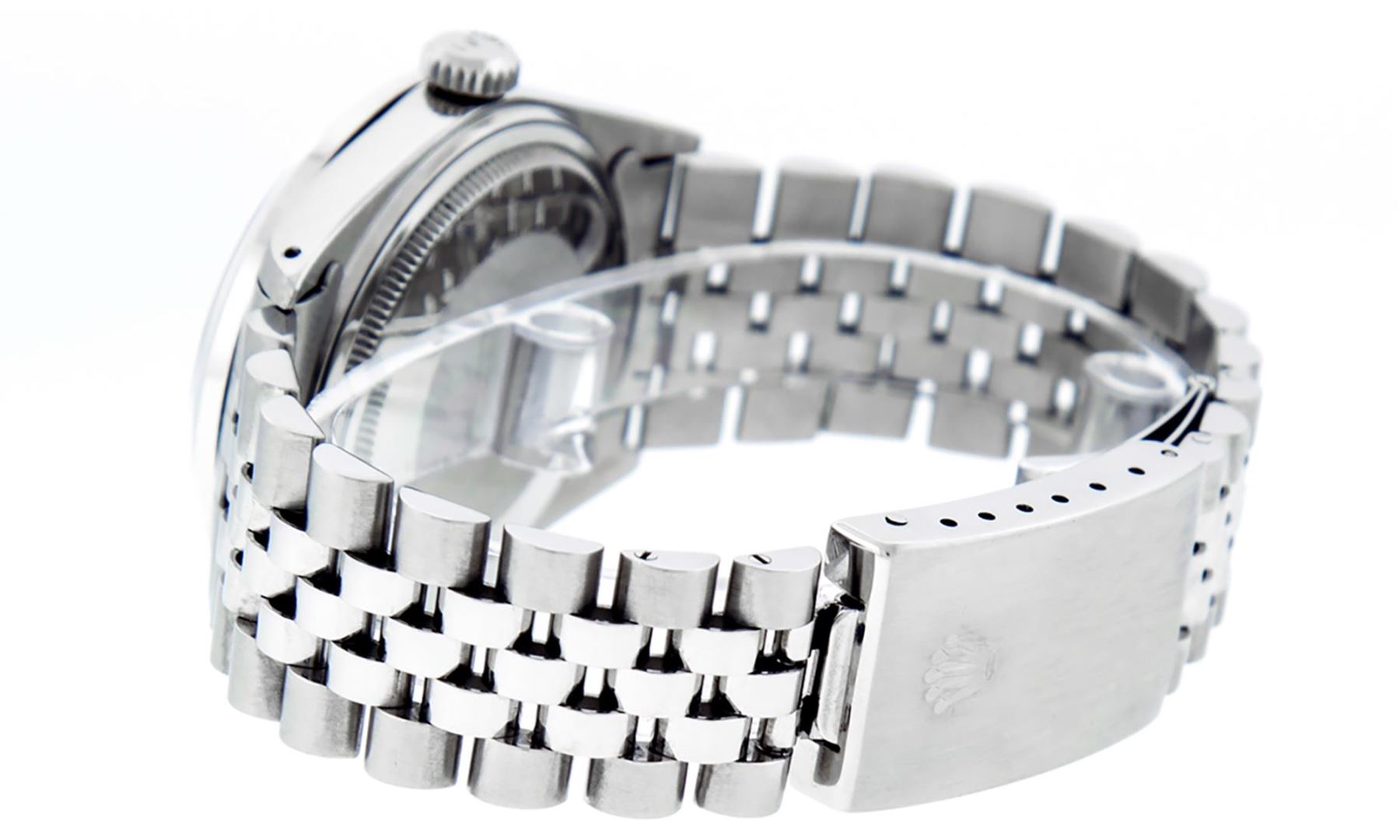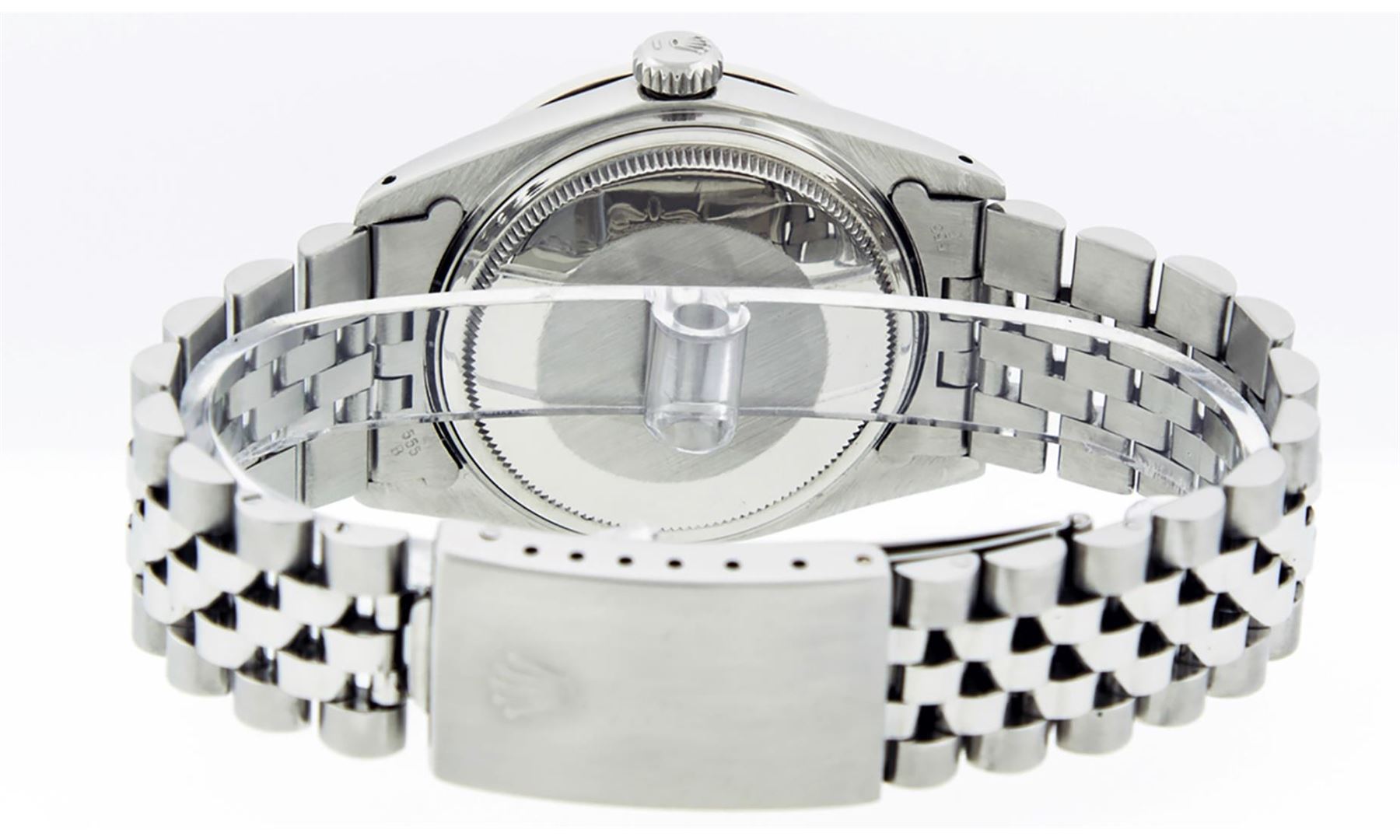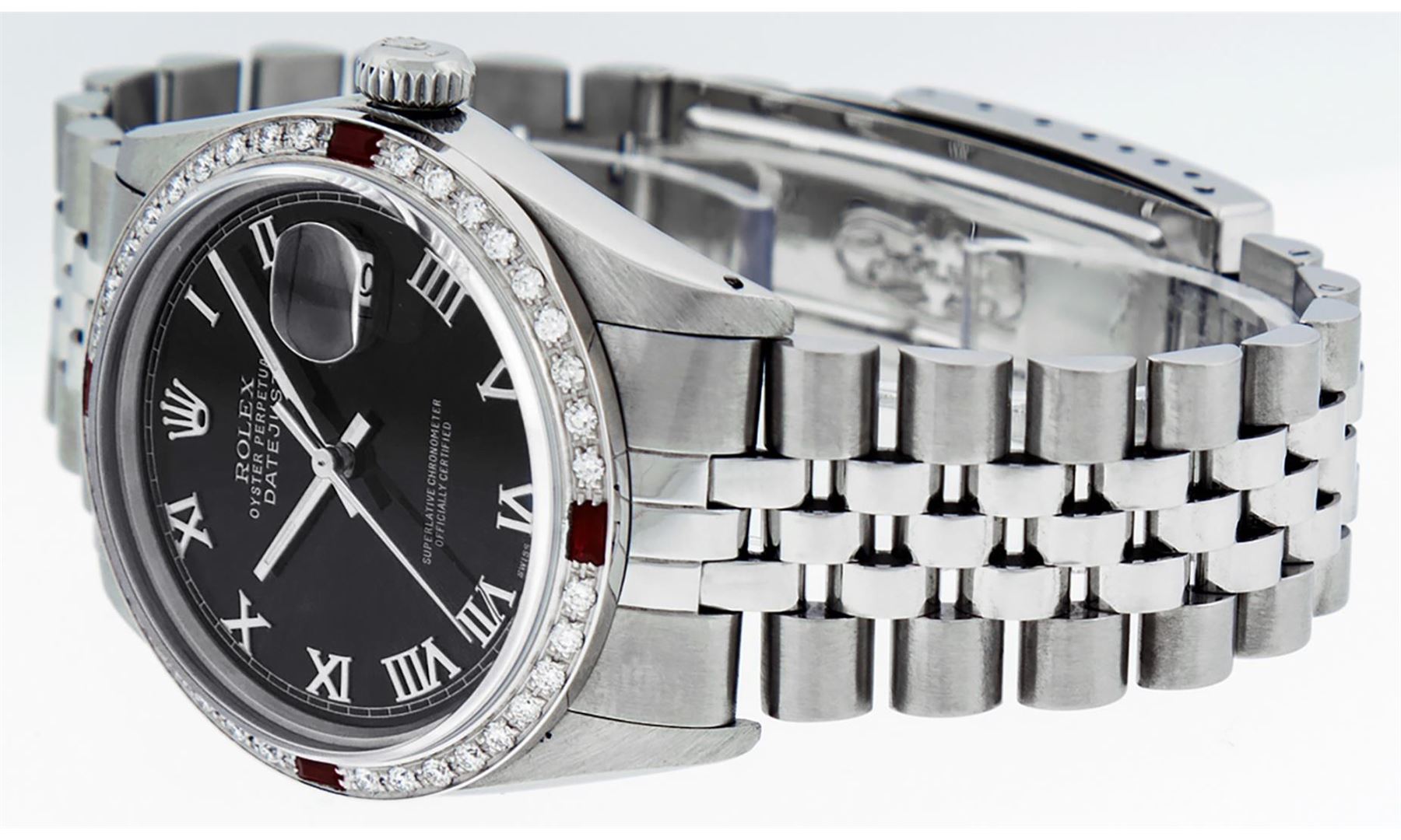 One Mens Pre Owned Stainless Steel Rolex Datejust Polished Bright with Satin Finish, Rolex Stainless Steel Case: 36mm, Rolex Stainless Steel Crown, Custom Bezel: New 18K White Gold Ruby Beadset Diamond Bezel With Added Diamonds And Rubies, Diamond + Gem Count: 36 Diamonds + 4 Rubies, Total Weight 1.00 Carat, Clarity: SI-VS, Color: G to H. Custom Crystal: New Sapphire With Magnified Date Window. Custom Hands: New Luminescent Hands. Rolex Movement: Automatic Winding Movement 3035. Custom Dial: Refinished To Black With Roman Hour Markers With Square Track. Date Window: 3 O'Clock Position Date Display, Quickset, Model: Datejust, Condition: G-6 Extra Fine. Rolex Bracelet: Stainless Steel Jubilee Band. Bracelet: 7.0 Inch Length, Adjustable. Standard Clasp, With Rolex Logo. This Watch Has Been Serviced Time Tested And Is In Excellent Condition It Is Free Of All Scratches And Dents.