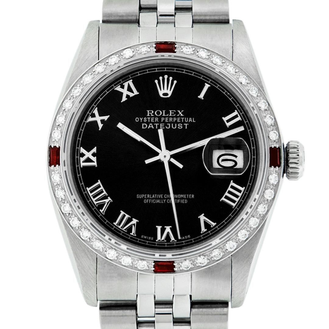 One Mens Pre Owned Stainless Steel Rolex Datejust Polished Bright with Satin Finish, Rolex Stainless Steel Case: 36mm, Rolex Stainless Steel Crown, Custom Bezel: New 18K White Gold Ruby Beadset Diamond Bezel With Added Diamonds And Rubies, Diamond + Gem Count: 36 Diamonds + 4 Rubies, Total Weight 1.00 Carat, Clarity: SI-VS, Color: G to H. Custom Crystal: New Sapphire With Magnified Date Window. Custom Hands: New Luminescent Hands. Rolex Movement: Automatic Winding Movement 3035. Custom Dial: Refinished To Black With Roman Hour Markers With Square Track. Date Window: 3 O'Clock Position Date Display, Quickset, Model: Datejust, Condition: G-6 Extra Fine. Rolex Bracelet: Stainless Steel Jubilee Band. Bracelet: 7.0 Inch Length, Adjustable. Standard Clasp, With Rolex Logo. This Watch Has Been Serviced Time Tested And Is In Excellent Condition It Is Free Of All Scratches And Dents.