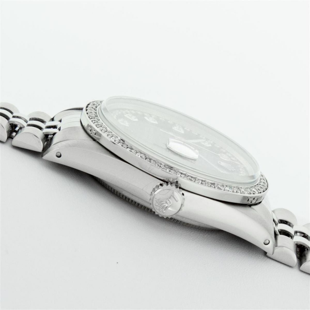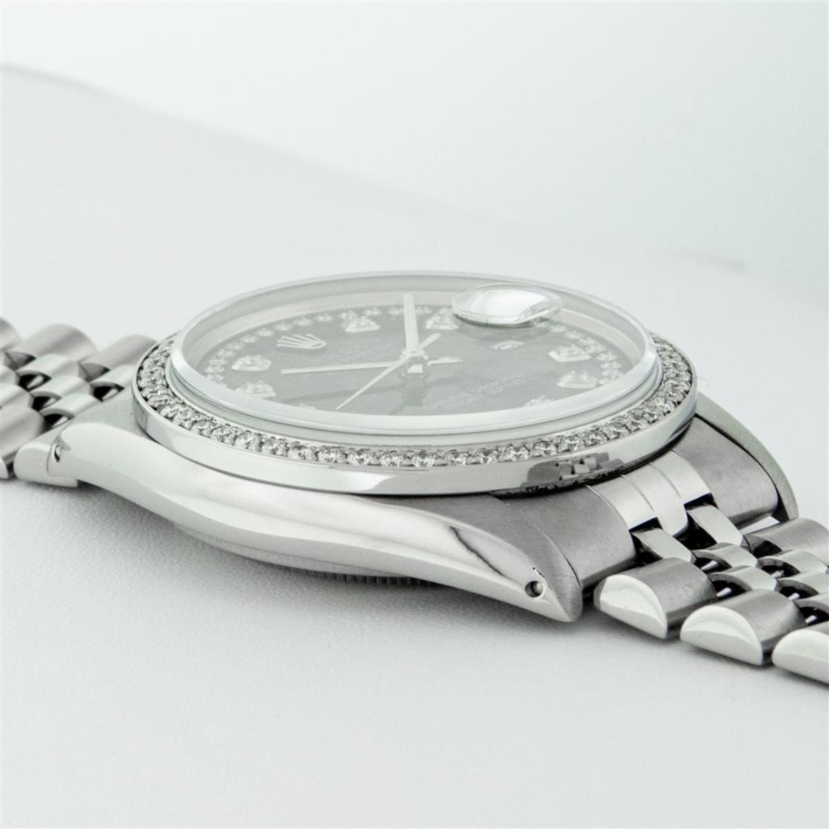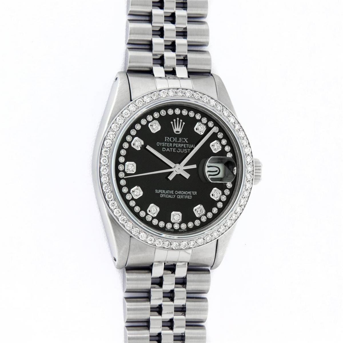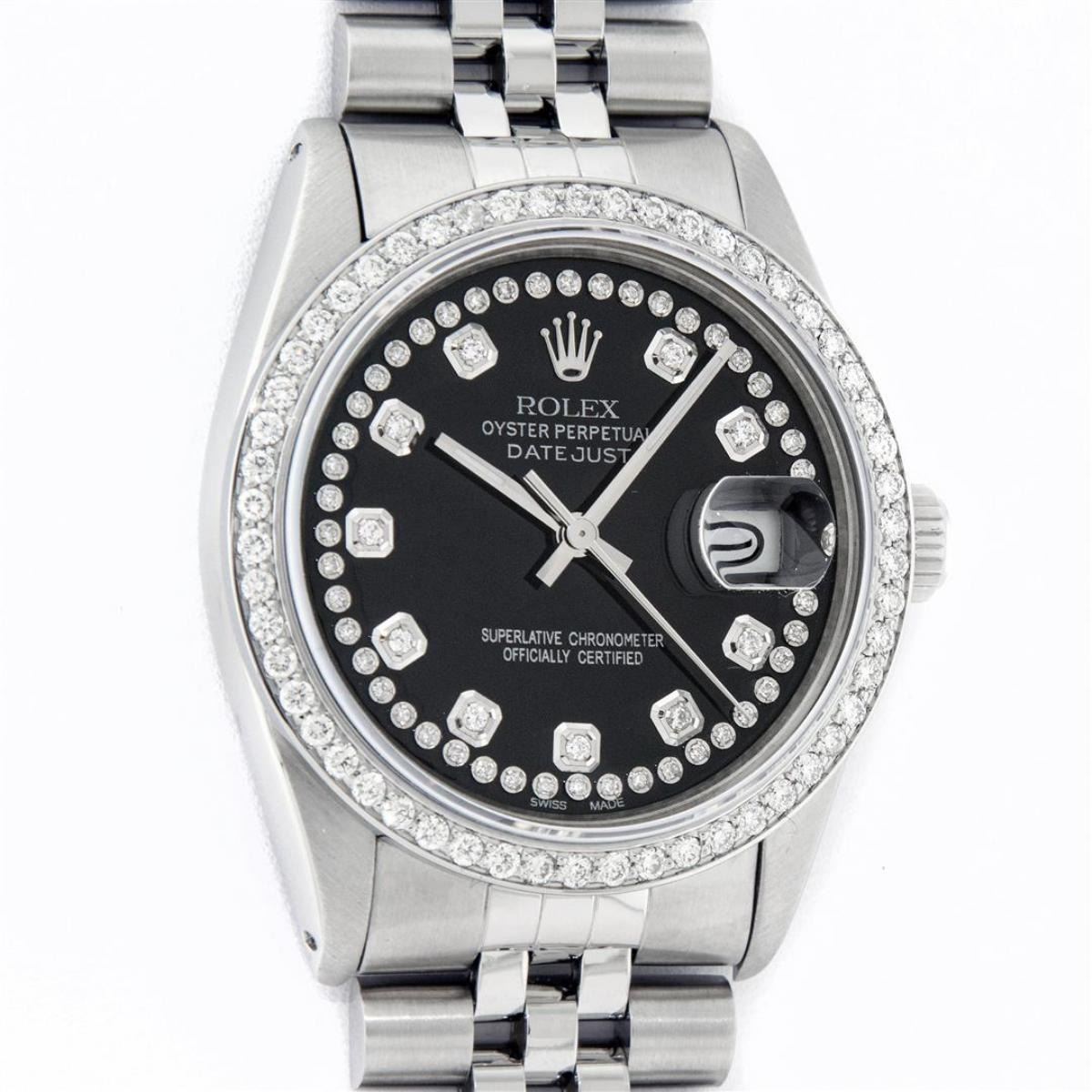 One Mens Rolex Stainless Steel Datejust Polished Bright with Satin Finish, This Watch Has Been Serviced & Electronically Tested, Stainless Steel Case: 36mm, Stainless Steel Crown, Custom Bezel: New Stainless Steel Beadset Diamond Bezel, Diamond Count: 54 Diamonds, Total Weight 1.00 Carat, Clarity: SI-VS, Color: G to H. Custom Crystal: New Synthetic Sapphire Cyclops Lens. Custom Hands: New Luminescent Hands. Movement: Automatic Winding Movement Caliber 3035. Custom Dial: Black String Diamond Dial, Diamond Count: 58 Diamonds In Dial, Color: G to H, Clarity: VS2-SI1. Date Window: 3 O'Clock Position Date Display, Quickset, Model: Datejust. Condition: G-6 Extra Fine. Bracelet: Stainless Steel Jubilee Band. Bright Polish & Satin Finish. 7.0 Inch Length, Adjustable. Standard Clasp, With Rolex Logo. This Watch Has Been Serviced Time Tested And Is In Excellent Condition It Is Free Of All Scratches And Dents. This Watch Comes With A Rolex Box And Appraisal.