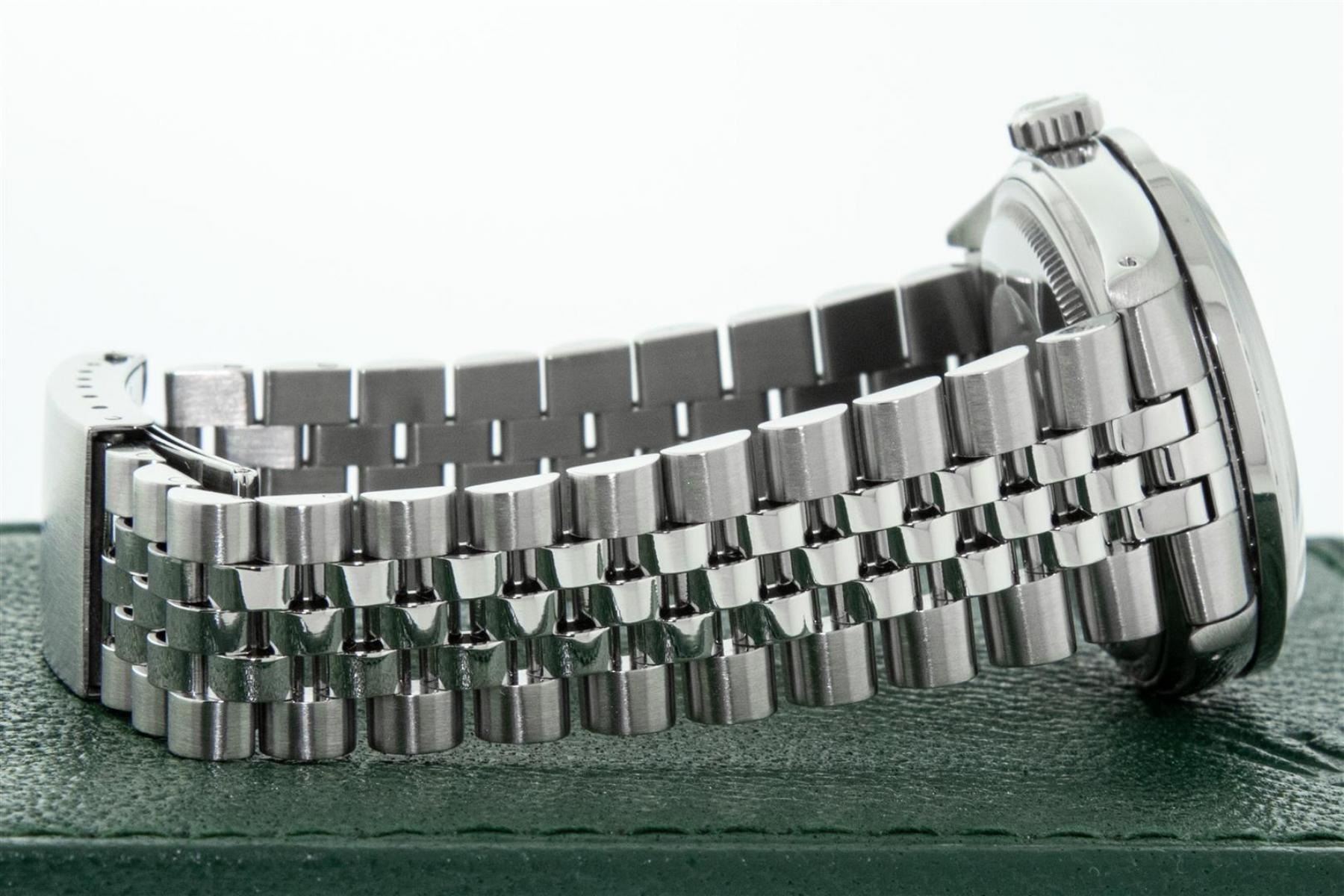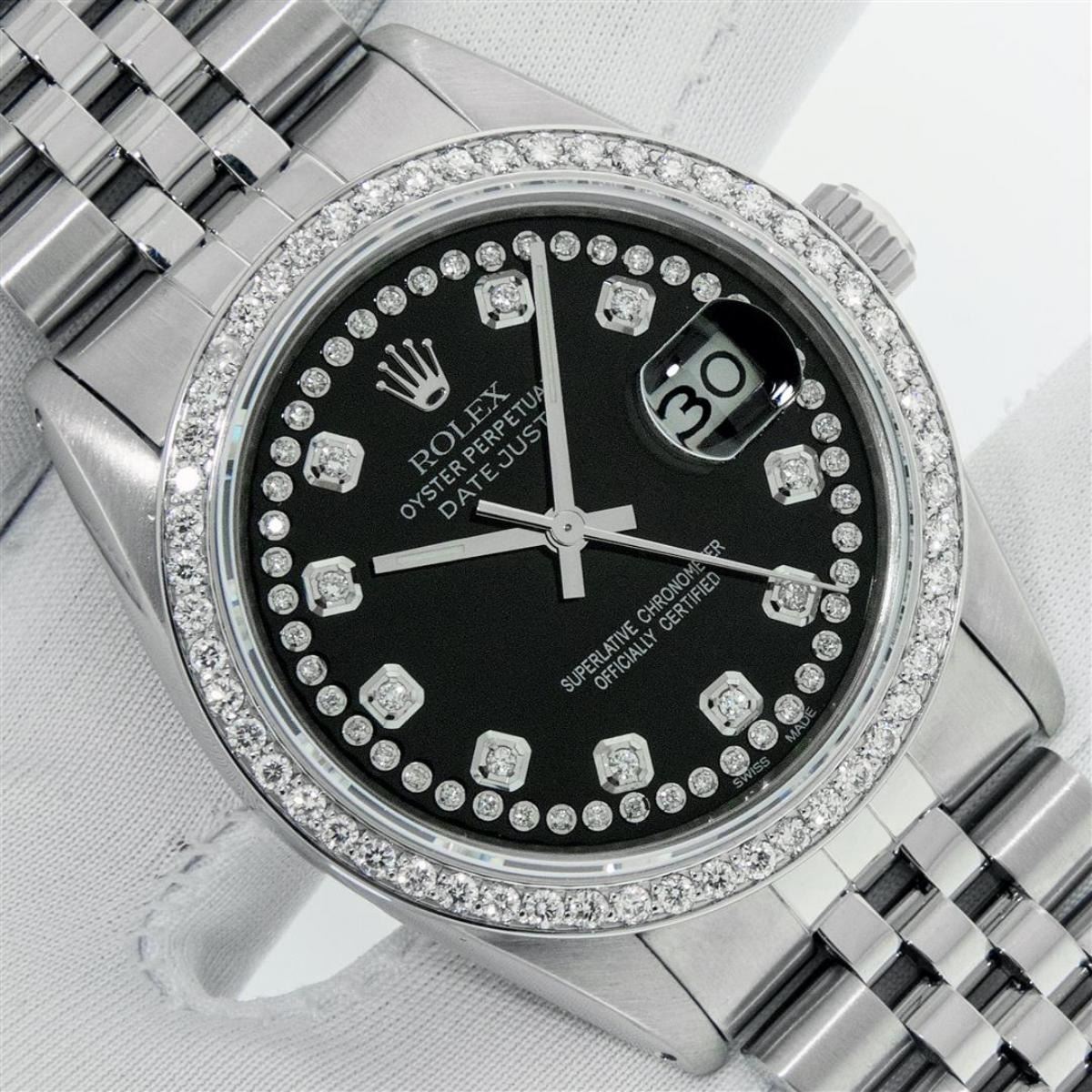 One Mens Rolex Stainless Steel Datejust Polished Bright with Satin Finish, This Watch Has Been Serviced & Electronically Tested, Stainless Steel Case: 36mm, Stainless Steel Crown, Custom Bezel: New Stainless Steel Beadset Diamond Bezel, Diamond Count: 54 Diamonds, Total Weight 1.00 Carat, Clarity: SI-VS, Color: G to H. Custom Crystal: New Synthetic Sapphire Cyclops Lens. Custom Hands: New Luminescent Hands. Movement: Automatic Winding Movement. Custom Dial: Black String Diamond Dial, Diamond Count: 58 Diamonds In Dial, Color: G to H, Clarity: VS2-SI1. Date Window: 3 O'Clock Position Date Display, Quickset, Model: Datejust. Condition: G-6 Extra Fine. Bracelet: Stainless Steel Jubilee Band. Bright Polish & Satin Finish. 7.0 Inch Length, Adjustable. Standard Clasp, With Rolex Logo. This Watch Has Been Serviced Time Tested And Is In Excellent Condition It Is Free Of All Scratches And Dents. This Watch Comes With A Rolex Box.