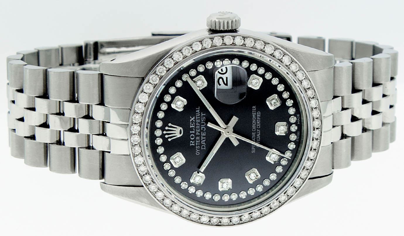 One Mens Rolex Stainless Steel Datejust Polished Bright with Satin Finish, This Watch Has Been Serviced & Electronically Tested, Stainless Steel Case: 36mm, Stainless Steel Crown, Custom Bezel: New Stainless Steel Beadset Diamond Bezel, Diamond Count: 54 Diamonds, Total Weight 1.00 Carat, Clarity: SI-VS, Color: G to H. Custom Crystal: New Synthetic Sapphire Cyclops Lens. Custom Hands: New Luminescent Hands. Movement: Automatic Winding Movement Caliber 3035. Custom Dial: Black String Diamond Dial, Diamond Count: 58 Diamonds In Dial, Color: G to H, Clarity: VS2-SI1. Date Window: 3 O'Clock Position Date Display, Quickset, Model: Datejust. Condition: G-6 Extra Fine. Bracelet: Stainless Steel Jubilee Band. Bright Polish & Satin Finish. 7.0 Inch Length, Adjustable. Standard Clasp, With Rolex Logo. This Watch Has Been Serviced Time Tested And Is In Excellent Condition It Is Free Of All Scratches And Dents.