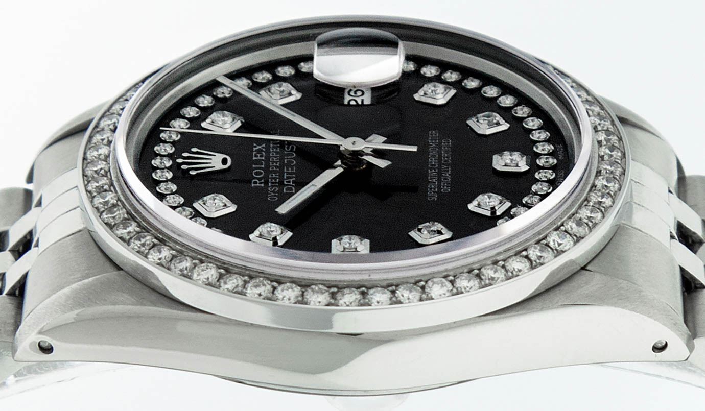 One Mens Rolex Stainless Steel Datejust Polished Bright with Satin Finish, This Watch Has Been Serviced & Electronically Tested, Stainless Steel Case: 36mm, Stainless Steel Crown, Custom Bezel: New Stainless Steel Beadset Diamond Bezel, Diamond Count: 54 Diamonds, Total Weight 1.00 Carat, Clarity: SI-VS, Color: G to H. Custom Crystal: New Synthetic Sapphire Cyclops Lens. Custom Hands: New Luminescent Hands. Movement: Automatic Winding Movement Caliber 3035. Custom Dial: Black String Diamond Dial, Diamond Count: 58 Diamonds In Dial, Color: G to H, Clarity: VS2-SI1. Date Window: 3 O'Clock Position Date Display, Quickset, Model: Datejust. Condition: G-6 Extra Fine. Bracelet: Stainless Steel Jubilee Band. Bright Polish & Satin Finish. 7.0 Inch Length, Adjustable. Standard Clasp, With Rolex Logo. This Watch Has Been Serviced Time Tested And Is In Excellent Condition It Is Free Of All Scratches And Dents.