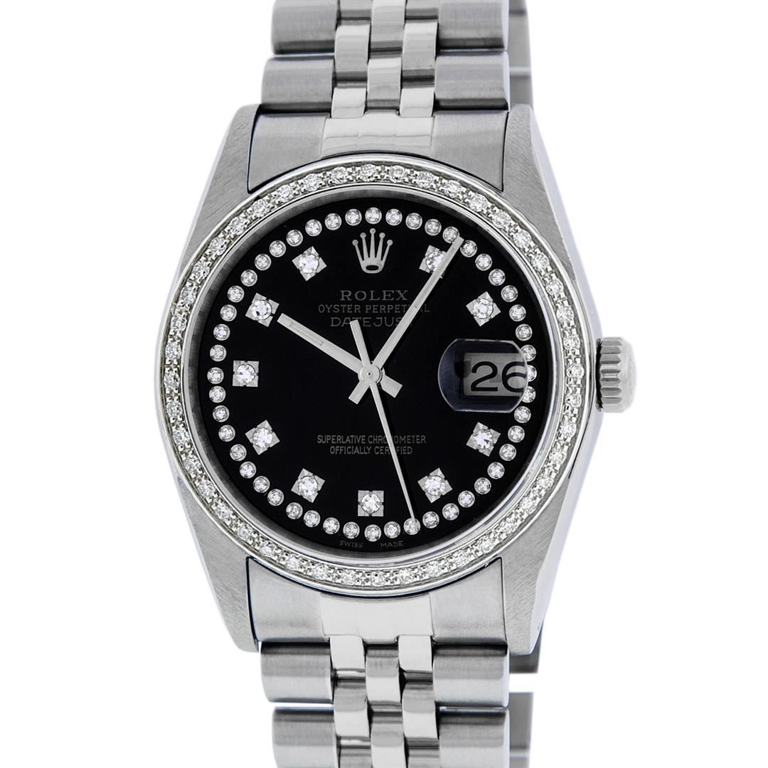 One Mens Rolex Stainless Steel Datejust Polished Bright with Satin Finish, This Watch Has Been Serviced & Electronically Tested, Stainless Steel Case: 36mm, Stainless Steel Crown, Custom Bezel: New 18K White Gold Beadset Diamond Bezel, Diamond Count: 44 Diamonds, Total Weight 1.00 Carat, Clarity: SI-VS, Color: G to H. Custom Crystal: New Scratch Resistant Synthetic Sapphire Cyclops Lens. Custom Hands: New Luminescent Hands. Movement: Automatic Winding Movement Caliber 3035. Custom Dial: Black String Single Cut Diamond Dial, Diamond Count: 58 Diamonds In Dial, Color: G to H, Clarity: VS2. Date Window: 3 O'Clock Position Date Display, Quickset, Model: Datejust. Condition: G-6 Extra Fine. Bracelet: Stainless Steel Jubilee Band. Bright Polish & Satin Finish. 7.0 Inch Length, Adjustable. Standard Clasp, With Rolex Logo. This Watch Has Been Serviced Time Tested And Is In Excellent Condition It Is Free Of All Scratches And Dents.