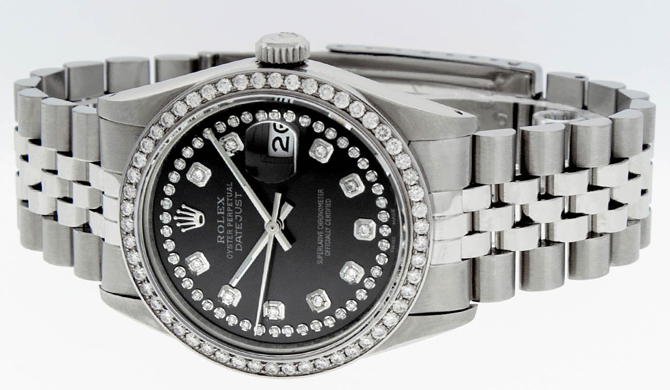 One Mens Rolex Stainless Steel Datejust Polished Bright with Satin Finish, This Watch Has Been Serviced & Electronically Tested, Stainless Steel Case: 36mm, Stainless Steel Crown, Custom Bezel: New Stainless Steel Beadset Diamond Bezel, Diamond Count: 54 Diamonds, Total Weight 1.00 Carat, Clarity: SI-VS, Color: G to H. Custom Crystal: New Synthetic Sapphire Cyclops Lens. Custom Hands: New Luminescent Hands. Movement: Automatic Winding Movement Caliber 3035. Custom Dial: Black String Diamond Dial, Diamond Count: 58 Diamonds In Dial, Color: G to H, Clarity: VS2-SI1. Date Window: 3 O'Clock Position Date Display, Quickset, Model: Datejust. Condition: G-6 Extra Fine. Bracelet: Stainless Steel Jubilee Band. Bright Polish & Satin Finish. 7.0 Inch Length, Adjustable. Standard Clasp, With Rolex Logo. This Watch Has Been Serviced Time Tested And Is In Excellent Condition It Is Free Of All Scratches And Dents.
