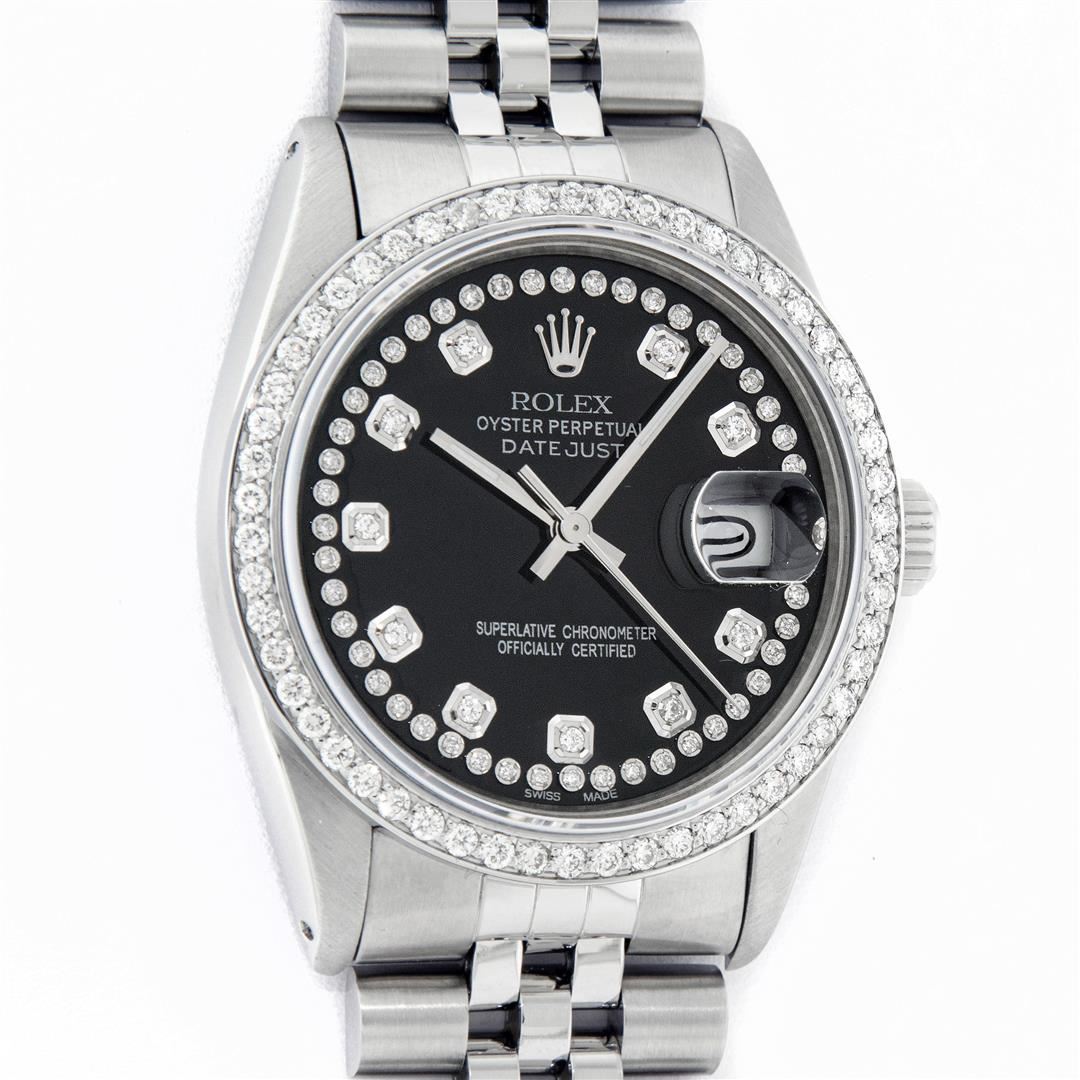 One Men's Rolex Stainless Steel Datejust Polished Bright with Satin Finish, This Watch Has Been Serviced & Electronically Tested, Stainless Steel Case: 36mm, Stainless Steel Crown, Custom Bezel:�New Stainless Steel�Beadset Diamond Bezel, Diamond Count:�54 Diamonds On Bezel, Total Bezel Weight 1.00 Carat, Clarity: SI-VS, Color: G to H. Custom Crystal: New Synthetic Sapphire Cyclops Lens. Custom Hands: New Luminescent Hands. Movement: Automatic Winding Movement Caliber 3035. Custom Dial: Black String Diamond Dial, Diamond Count: 58 Diamonds On Dial, Color: G to H, Clarity: VS2-SI1. Date Window: 3 O'Clock Position Date Display, Quickset, Model: Datejust. Condition: G-6 Extra Fine. Bracelet: Stainless Steel Jubilee Band. Bright Polish & Satin Finish.�7.0 Inch Length, Adjustable. Standard Clasp, With Rolex Logo. This Watch Has Been Serviced Time Tested And Is In Excellent Condition It Is Free Of All Scratches And Dents.