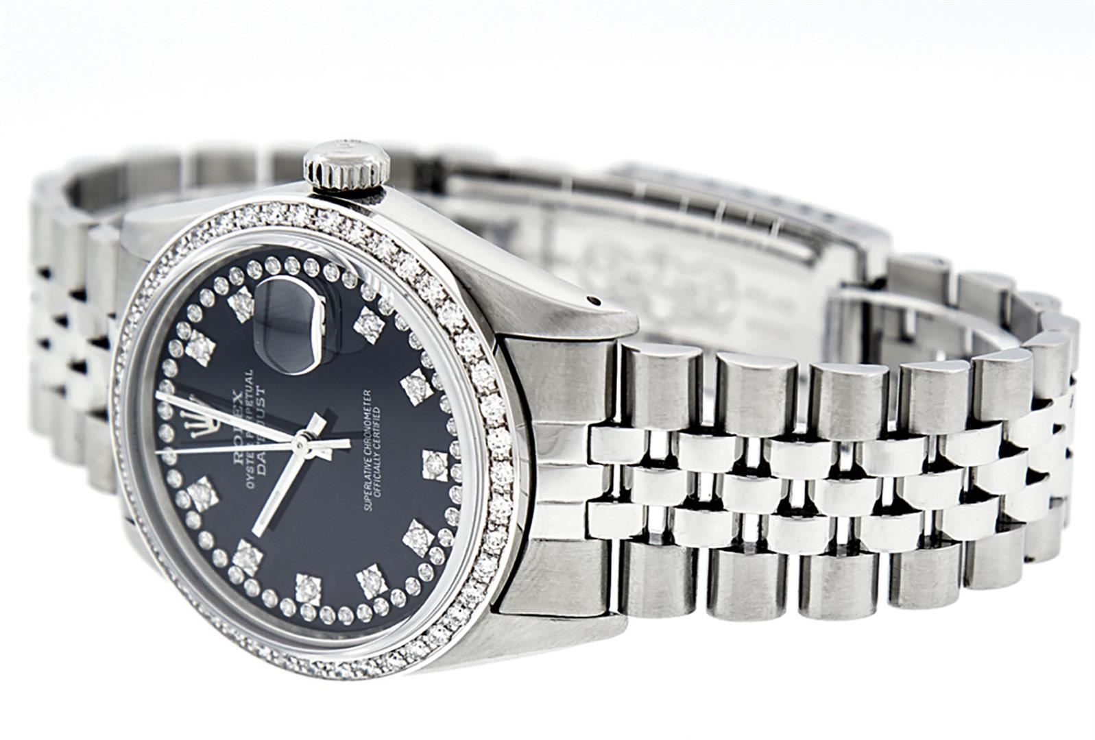One Mens Rolex Stainless Steel Datejust Polished Bright with Satin Finish, This Watch Has Been Serviced & Electronically Tested, Stainless Steel Case: 36mm, Stainless Steel Crown, Custom Bezel: New 18K White Gold Beadset Diamond Bezel, Diamond Count: 44 Diamonds, Total Weight 1.00 Carat, Clarity: SI-VS, Color: G to H. Custom Crystal: New Scratch Resistant Synthetic Sapphire Cyclops Lens. Custom Hands: New Luminescent Hands. Movement: Automatic Winding Movement Caliber 3035. Custom Dial: Black String Single Cut Diamond Dial, Diamond Count: 58 Diamonds In Dial, Color: G to H, Clarity: VS2. Date Window: 3 O'Clock Position Date Display, Quickset, Model: Datejust. Condition: G-6 Extra Fine. Bracelet: Stainless Steel Jubilee Band. Bright Polish & Satin Finish. 7.0 Inch Length, Adjustable. Standard Clasp, With Rolex Logo. This Watch Has Been Serviced Time Tested And Is In Excellent Condition It Is Free Of All Scratches And Dents.