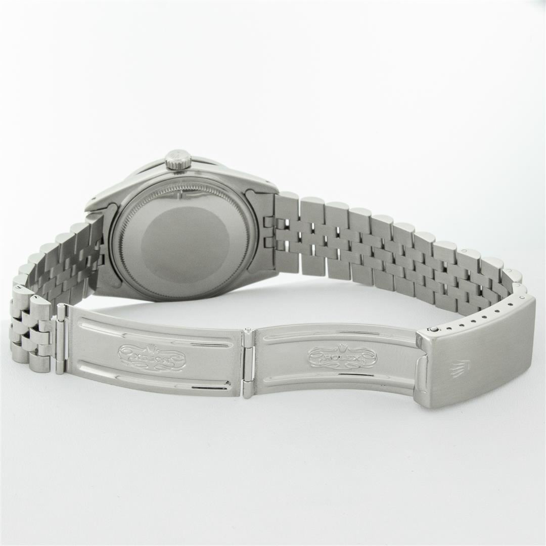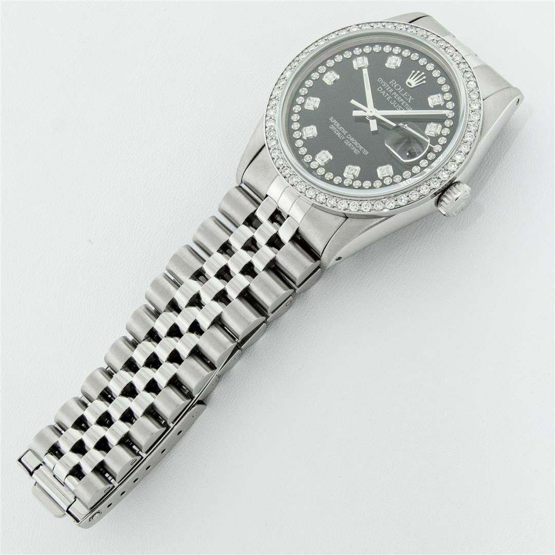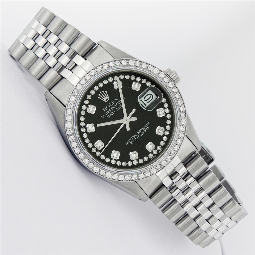 One Men's Rolex Stainless Steel Datejust Polished Bright with Satin Finish, This Watch Has Been Serviced & Electronically Tested, Stainless Steel Case: 36mm, Stainless Steel Crown, Custom Bezel: New Stainless Steel Beadset Diamond Bezel, Diamond Count: 54 Diamonds On Bezel, Total Bezel Weight 1.00 Carat, Clarity: SI-VS, Color: G to H. Custom Crystal: New Synthetic Sapphire Cyclops Lens. Custom Hands: New Luminescent Hands. Movement: Automatic Winding Movement Caliber 3035. Custom Dial: Black String Diamond Dial, Diamond Count: 58 Diamonds On Dial, Color: G to H, Clarity: VS2-SI1. Date Window: 3 O'Clock Position Date Display, Quickset, Model: Datejust. Condition: G-6 Extra Fine. Bracelet: Stainless Steel Jubilee Band. Bright Polish & Satin Finish. 7.0 Inch Length, Adjustable. Standard Clasp, With Rolex Logo. This Watch Has Been Serviced Time Tested And Is In Excellent Condition It Is Free Of All Scratches And Dents.