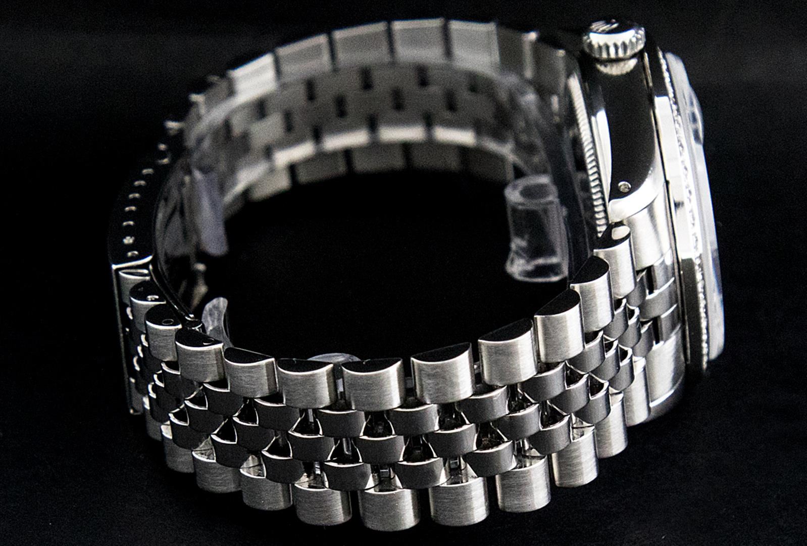 One Mens Rolex Stainless Steel Datejust Polished Bright with Satin Finish, This Watch Has Been Serviced & Electronically Tested, Stainless Steel Case: 36mm, Stainless Steel Crown, Custom Bezel: New 18K White Gold Beadset Diamond Bezel, Diamond Count: 44 Diamonds, Total Weight 1.00 Carat, Clarity: SI-VS, Color: G to H. Custom Crystal: New Scratch Resistant Synthetic Sapphire Cyclops Lens. Custom Hands: New Luminescent Hands. Movement: Automatic Winding Movement Caliber 3035. Custom Dial: Black String Single Cut Diamond Dial, Diamond Count: 58 Diamonds In Dial, Color: G to H, Clarity: VS2. Date Window: 3 O'Clock Position Date Display, Quickset, Model: Datejust. Condition: G-6 Extra Fine. Bracelet: Stainless Steel Jubilee Band. Bright Polish & Satin Finish. 7.0 Inch Length, Adjustable. Standard Clasp, With Rolex Logo. This Watch Has Been Serviced Time Tested And Is In Excellent Condition It Is Free Of All Scratches And Dents.