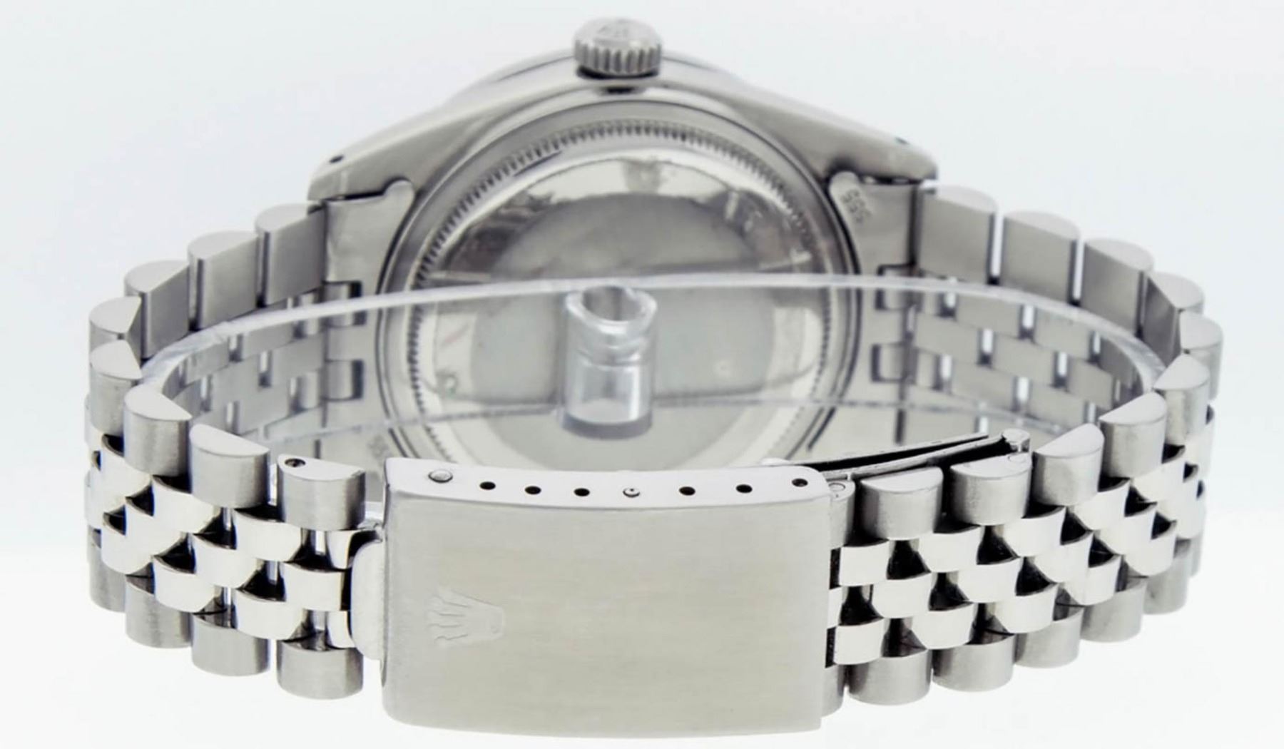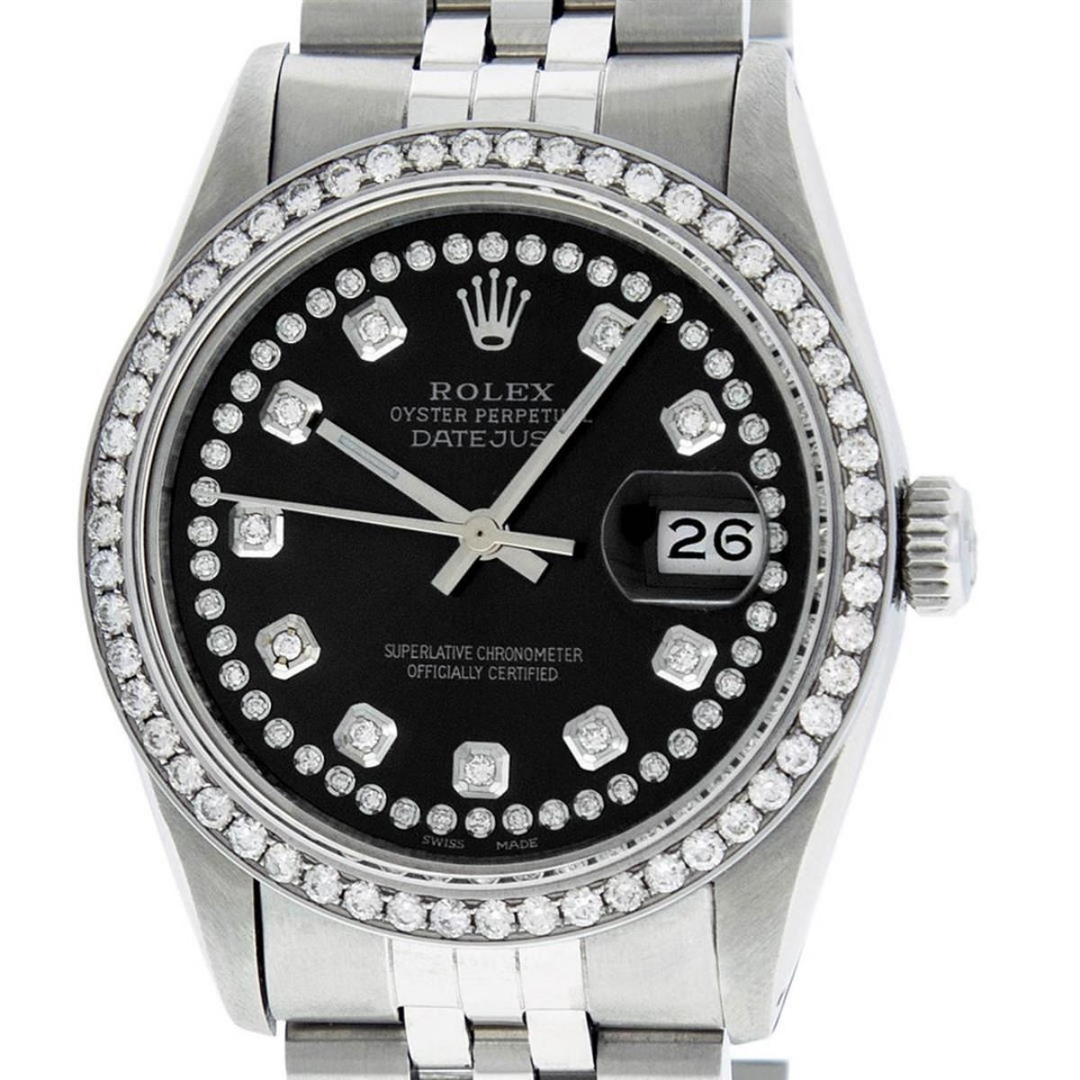 One Mens Rolex Stainless Steel Datejust Polished Bright with Satin Finish, This Watch Has Been Serviced & Electronically Tested, Stainless Steel Case: 36mm, Stainless Steel Crown, Custom Bezel: New Stainless Steel Beadset Diamond Bezel, Diamond Count: 54 Diamonds, Total Weight 1.00 Carat, Clarity: SI-VS, Color: G to H. Custom Crystal: New Synthetic Sapphire Cyclops Lens. Custom Hands: New Luminescent Hands. Movement: Automatic Winding Movement Caliber 3035. Custom Dial: Black String Diamond Dial, Diamond Count: 58 Diamonds In Dial, Color: G to H, Clarity: VS2-SI1. Date Window: 3 O'Clock Position Date Display, Quickset, Model: Datejust. Condition: G-6 Extra Fine. Bracelet: Stainless Steel Jubilee Band. Bright Polish & Satin Finish. 7.0 Inch Length, Adjustable. Standard Clasp, With Rolex Logo. This Watch Has Been Serviced Time Tested And Is In Excellent Condition It Is Free Of All Scratches And Dents.