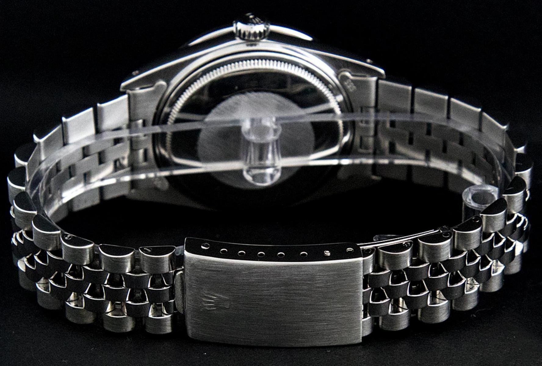One Mens Rolex Stainless Steel Datejust Polished Bright with Satin Finish, This Watch Has Been Serviced & Electronically Tested, Stainless Steel Case: 36mm, Stainless Steel Crown, Custom Bezel: New 18K White Gold Beadset Diamond Bezel, Diamond Count: 44 Diamonds, Total Weight 1.00 Carat, Clarity: SI-VS, Color: G to H. Custom Crystal: New Scratch Resistant Synthetic Sapphire Cyclops Lens. Custom Hands: New Luminescent Hands. Movement: Automatic Winding Movement. Custom Dial: Black String Single Cut Diamond Dial, Diamond Count: 58 Diamonds In Dial, Color: G to H, Clarity: VS2. Date Window: 3 O'Clock Position Date Display, Quickset, Model: Datejust. Condition: G-6 Extra Fine. Bracelet: Stainless Steel Jubilee Band. Bright Polish & Satin Finish. 7.0 Inch Length, Adjustable. Standard Clasp, With Rolex Logo. This Watch Has Been Serviced Time Tested And Is In Excellent Condition It Is Free Of All Scratches And Dents.
