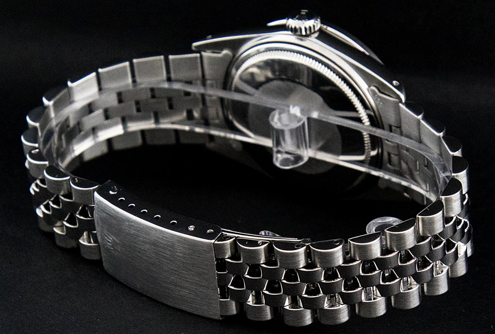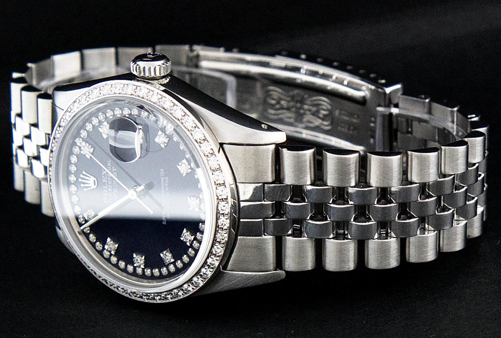 One Mens Rolex Stainless Steel Datejust Polished Bright with Satin Finish, This Watch Has Been Serviced & Electronically Tested, Stainless Steel Case: 36mm, Stainless Steel Crown, Custom Bezel: New 18K White Gold Beadset Diamond Bezel, Diamond Count: 44 Diamonds, Total Weight 1.00 Carat, Clarity: SI-VS, Color: G to H. Custom Crystal: New Scratch Resistant Synthetic Sapphire Cyclops Lens. Custom Hands: New Luminescent Hands. Movement: Automatic Winding Movement. Custom Dial: Black String Single Cut Diamond Dial, Diamond Count: 58 Diamonds In Dial, Color: G to H, Clarity: VS2. Date Window: 3 O'Clock Position Date Display, Quickset, Model: Datejust. Condition: G-6 Extra Fine. Bracelet: Stainless Steel Jubilee Band. Bright Polish & Satin Finish. 7.0 Inch Length, Adjustable. Standard Clasp, With Rolex Logo. This Watch Has Been Serviced Time Tested And Is In Excellent Condition It Is Free Of All Scratches And Dents.