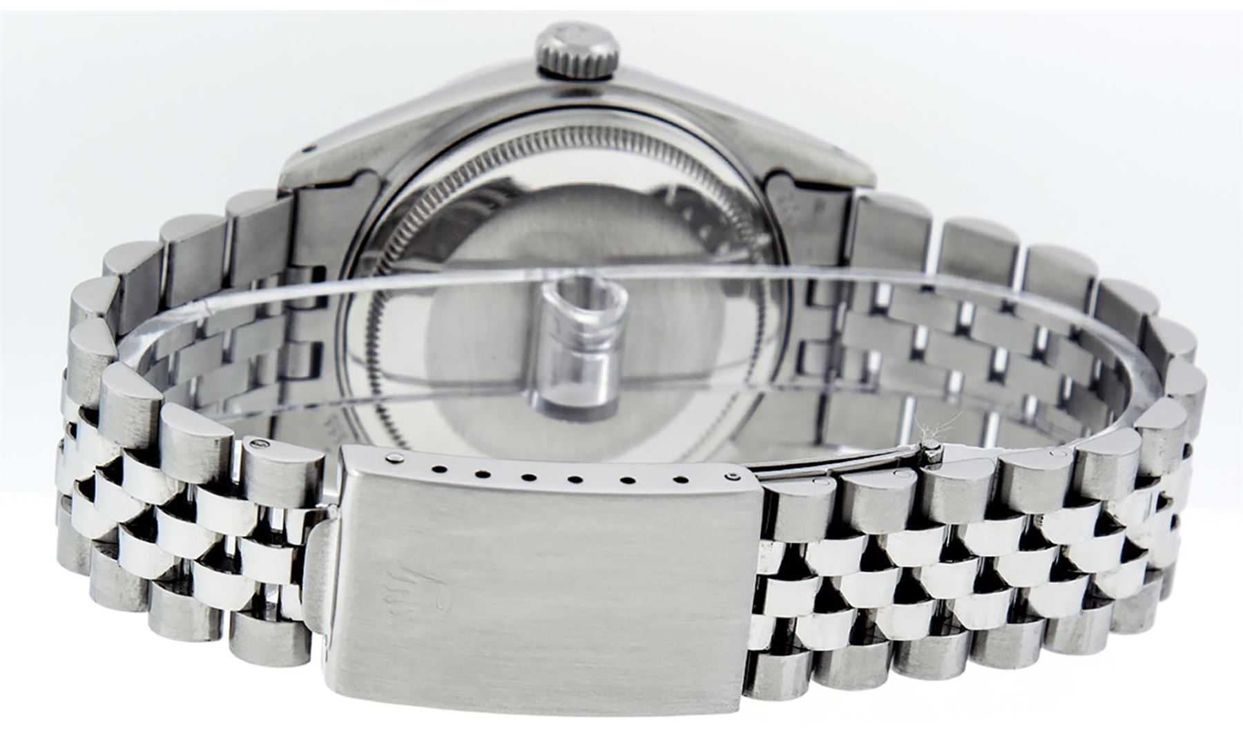One Mens Pre Owned Rolex Datejust Polished Bright with Satin Finish, Serviced And Electronically Tested, Stainless Steel Case: 36mm, Custom Diamond Lugs: 28 Diamonds On Lugs, Stainless Steel Crown, Custom Bezel: 18K White Gold Diamond + Ruby Beadset, Diamond Count: 36 Diamonds + 4 Rubies. Custom Crystal: New Sapphire With Magnified Date Window. Custom Hands: New Luminescent Hands. Rolex Movement: Automatic Winding Movement 3035. Custom Dial:Custom Black Dial With Added Diamonds, Stone Count: 58 Diamonds In Dial. Date Window: 3 O'Clock Position Date Display, Quickset, Model: Datejust, Condition: G-6 Extra Fine. Rolex Bracelet: Stainless Steel Jubilee Band. Bright Polish And Satin Finish. 7.0 Inch Length, Adjustable. Standard Clasp, With Rolex Logo. This Watch Has Been Serviced And Polished And Its Free Of All Dents And Scratches.