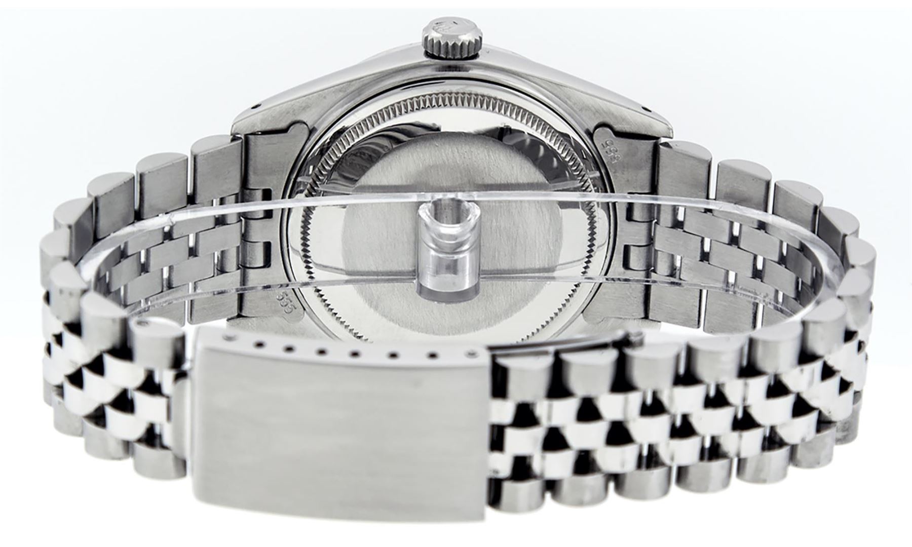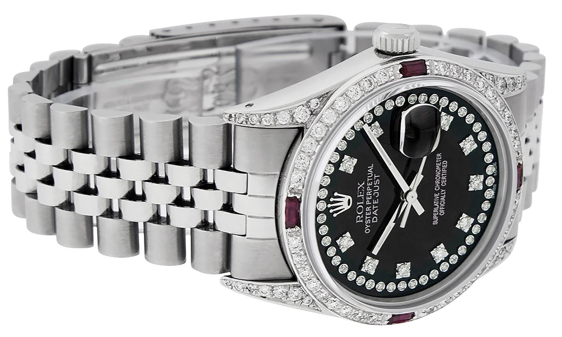 One Mens Pre Owned Rolex Datejust Polished Bright with Satin Finish, Serviced And Electronically Tested, Stainless Steel Case: 36mm, Custom Diamond Lugs: 28 Diamonds On Lugs, Stainless Steel Crown, Custom Bezel: 18K White Gold Diamond + Ruby Beadset, Diamond Count: 36 Diamonds + 4 Rubies. Custom Crystal: New Sapphire With Magnified Date Window. Custom Hands: New Luminescent Hands. Rolex Movement: Automatic Winding Movement 3035. Custom Dial:Custom Black Dial With Added Diamonds, Stone Count: 58 Diamonds In Dial. Date Window: 3 O'Clock Position Date Display, Quickset, Model: Datejust, Condition: G-6 Extra Fine. Rolex Bracelet: Stainless Steel Jubilee Band. Bright Polish And Satin Finish. 7.0 Inch Length, Adjustable. Standard Clasp, With Rolex Logo. This Watch Has Been Serviced And Polished And Its Free Of All Dents And Scratches.