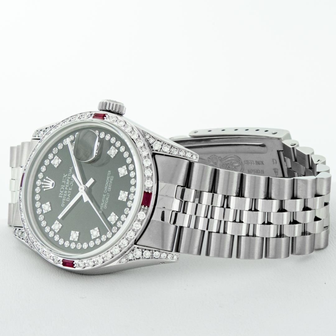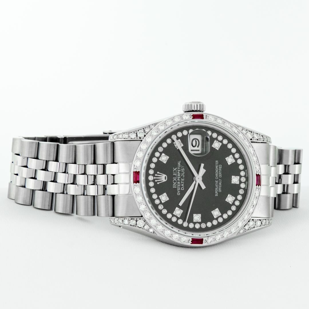 One Mens Pre Owned Rolex Datejust Polished Bright with Satin Finish, Serviced And Electronically Tested, Stainless Steel Case: 36mm, Custom Diamond Lugs: 28 Diamonds On Lugs, Stainless Steel Crown, Custom Bezel: 18K White Gold Diamond + Ruby Beadset, Diamond Count: 36 Diamonds + 4 Rubies. Custom Crystal: New Sapphire With Magnified Date Window. Custom Hands: New Luminescent Hands. Rolex Movement: Automatic Winding Movement 3035. Custom Dial:Custom Black Dial With Added Diamonds, Stone Count: 58 Diamonds In Dial. Date Window: 3 O'Clock Position Date Display, Quickset, Model: Datejust, Condition: G-6 Extra Fine. Rolex Bracelet: Stainless Steel Jubilee Band. Bright Polish And Satin Finish. 7.0 Inch Length, Adjustable. Standard Clasp, With Rolex Logo. This Watch Has Been Serviced And Polished And Its Free Of All Dents And Scratches.