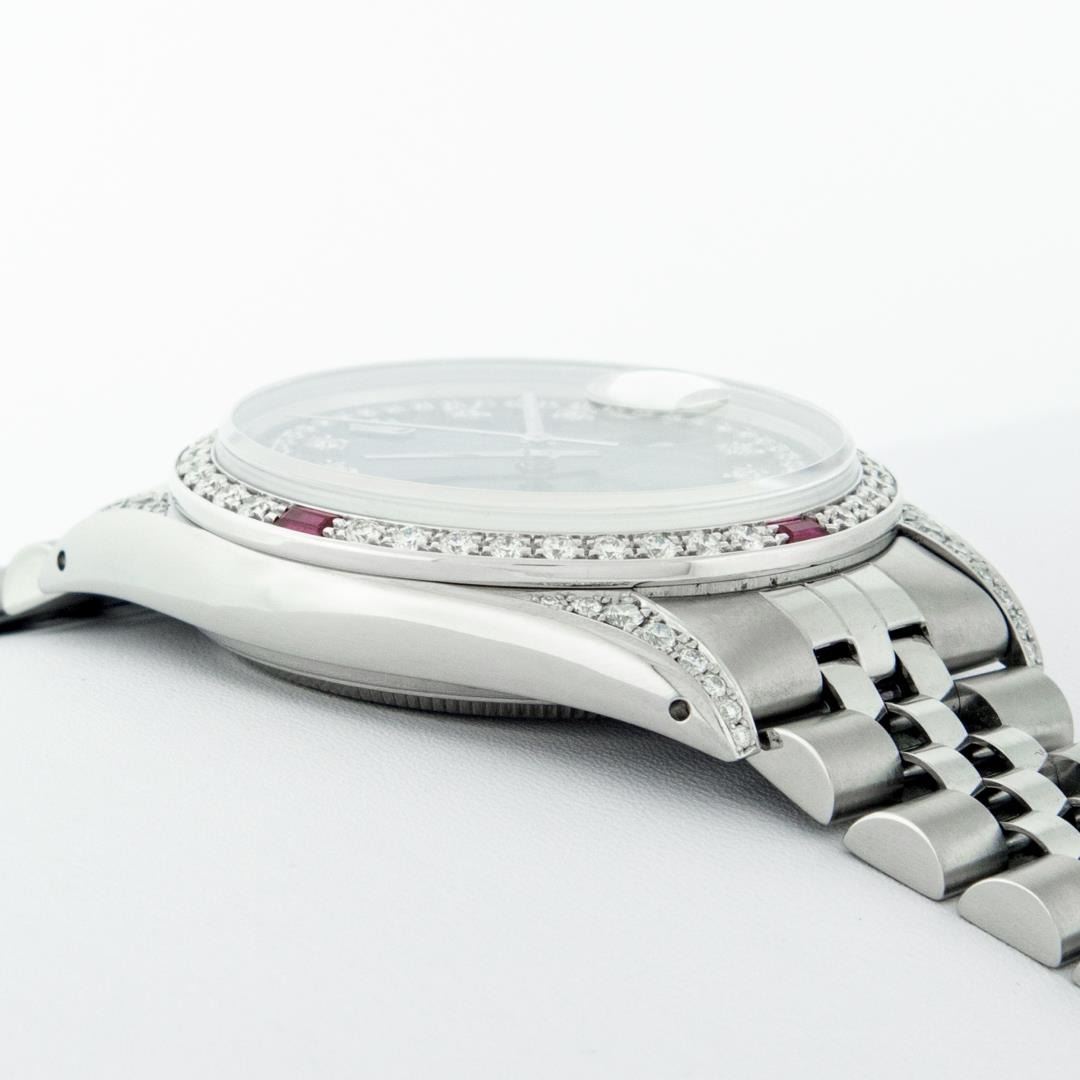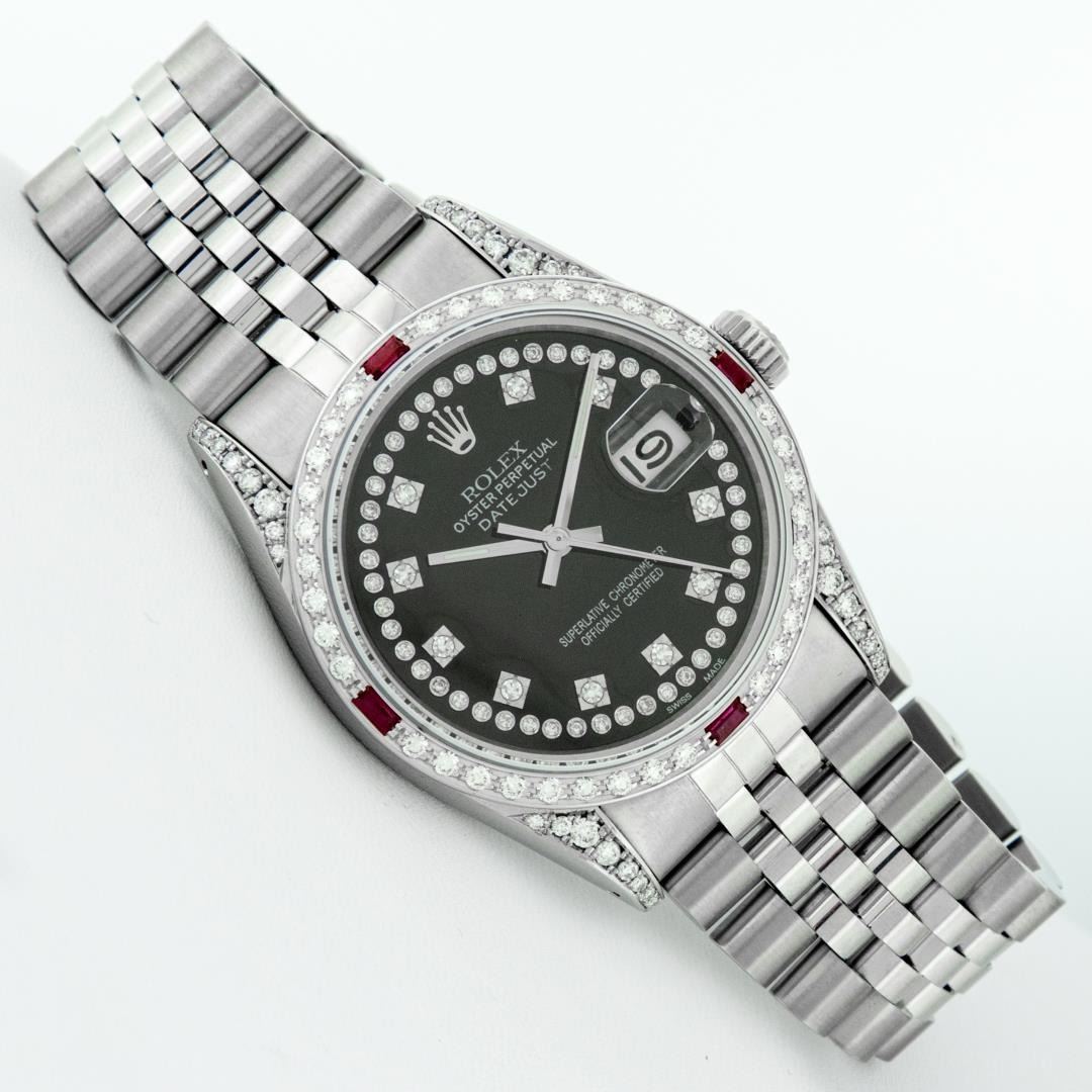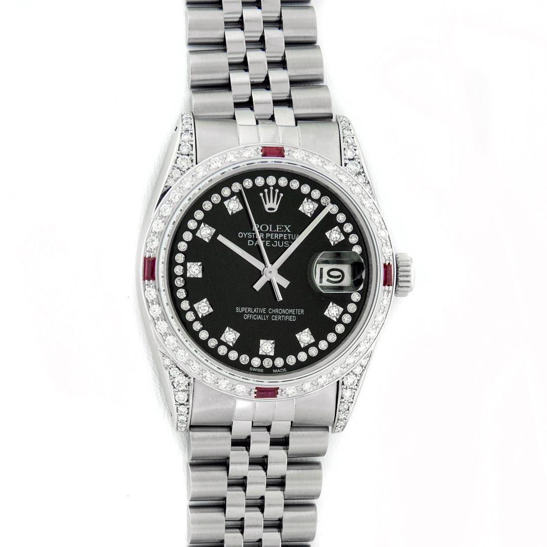 One Mens Pre Owned Rolex Datejust Polished Bright with Satin Finish, Serviced And Electronically Tested, Stainless Steel Case: 36mm, Custom Diamond Lugs: 28 Diamonds On Lugs, Stainless Steel Crown, Custom Bezel: 18K White Gold Diamond + Ruby Beadset, Diamond Count: 36 Diamonds + 4 Rubies. Custom Crystal: New Sapphire With Magnified Date Window. Custom Hands: New Luminescent Hands. Rolex Movement: Automatic Winding Movement 3035. Custom Dial:Custom Black Dial With Added Diamonds, Stone Count: 58 Diamonds In Dial. Date Window: 3 O'Clock Position Date Display, Quickset, Model: Datejust, Condition: G-6 Extra Fine. Rolex Bracelet: Stainless Steel Jubilee Band. Bright Polish And Satin Finish. 7.0 Inch Length, Adjustable. Standard Clasp, With Rolex Logo. This Watch Has Been Serviced And Polished And Its Free Of All Dents And Scratches.
