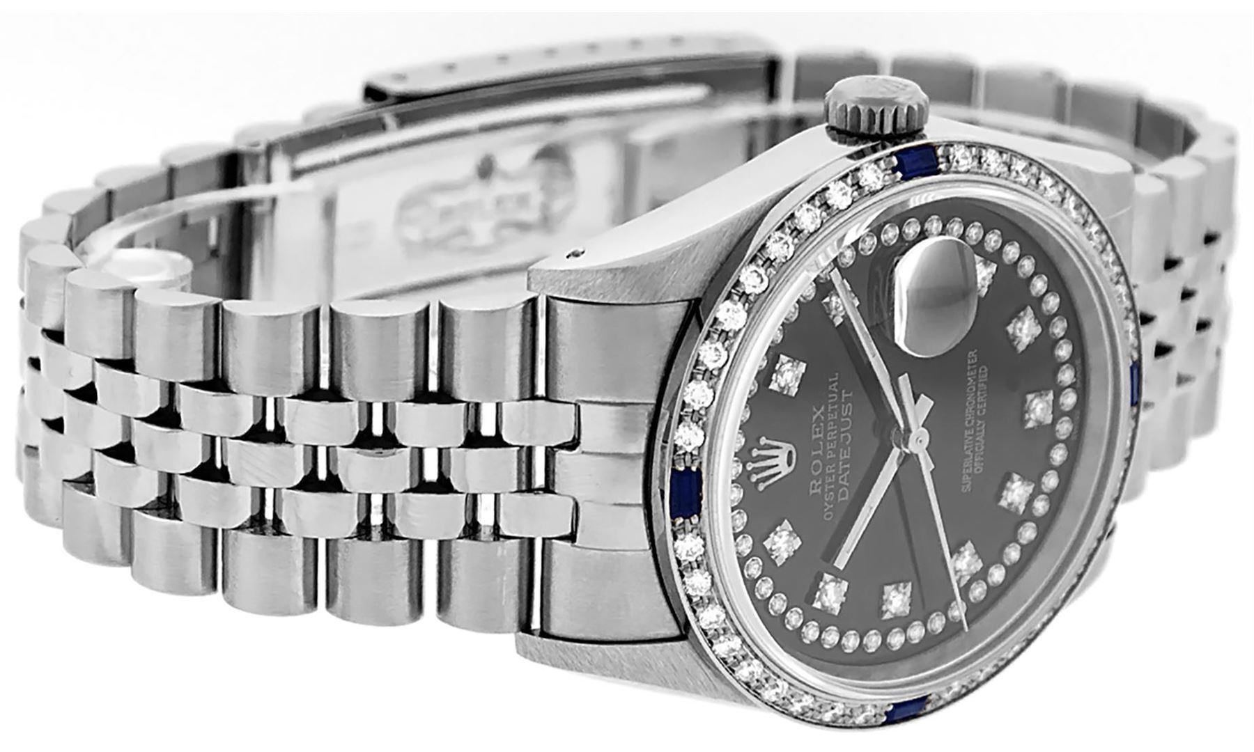 One Mens Stainless Steel Rolex Datejust Polished, Serviced & Electronically Tested, Stainless Steel Case: 36mm, Stainless Steel Crown, Custom Bezel: New 18K White Gold Sapphire Beadset Diamond Bezel, Diamond + Gem Count: 36 Diamonds + 4 Sapphires, Total Weight 1.00 Carat, Clarity: SI-VS, Color: G to H. Custom Crystal: New Scratch Resistant Synthetic Sapphire Cyclops Lens. Custom Hands: New Luminescent Hands. Movement: Automatic Winding Movement Caliber 3035. Custom Dial: Black String Diamond Dial, Diamond Count: 58 Diamonds in Dial, G To H In Color, Clarity: SI-VS. Date Window: 3 O'Clock Position Date Display, Quickset, Model: Datejust. Condition: G-6 Extra Fine. Bracelet: Stainless Steel Jubilee Band. Bright Polish & Satin Finish. 7.0 Inch Length, Adjustable. Standard Clasp, With Rolex Logo. This Watch Has Been Serviced Time Tested And Is In Excellent Condition It Is Free Of All Scratches And Dents.