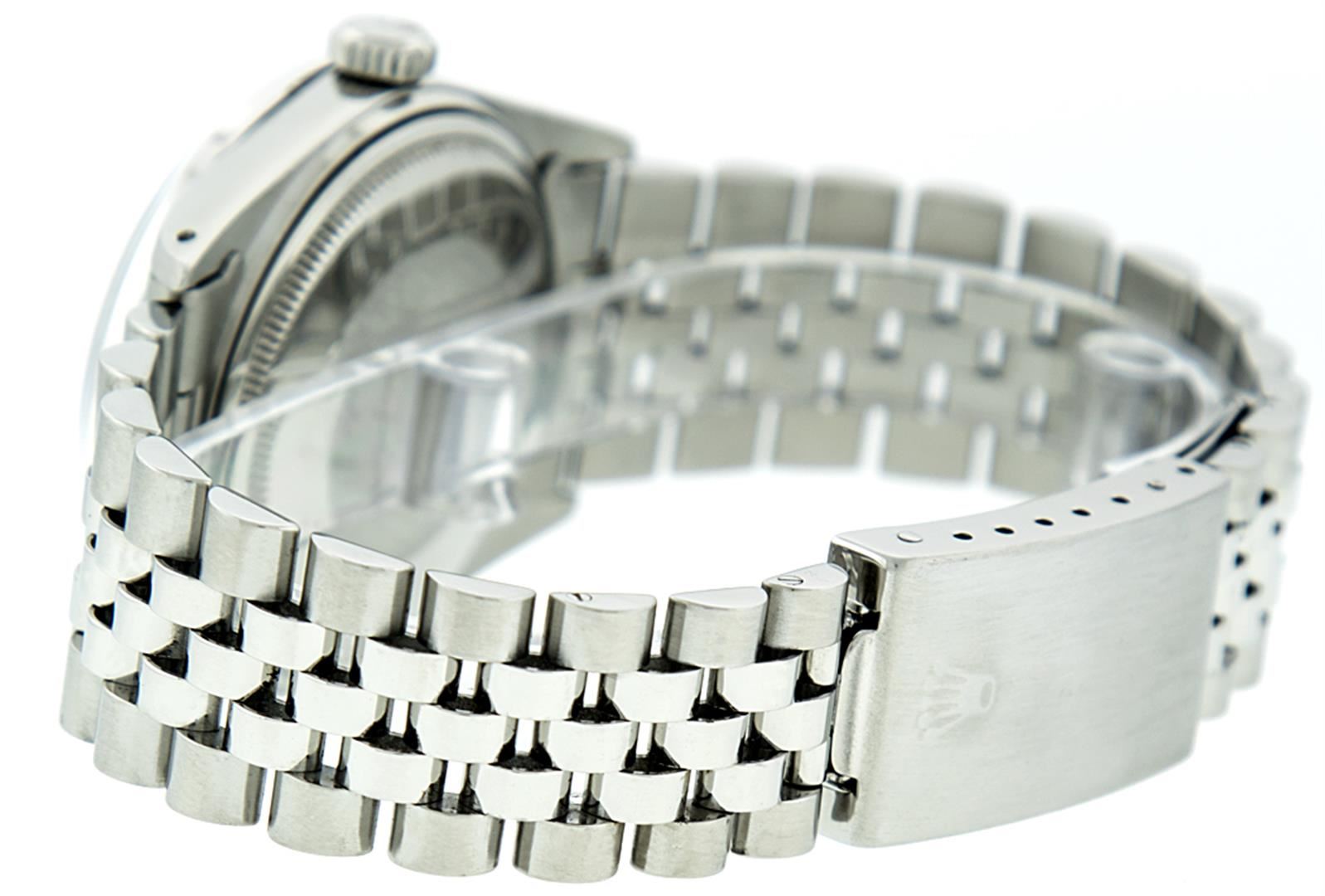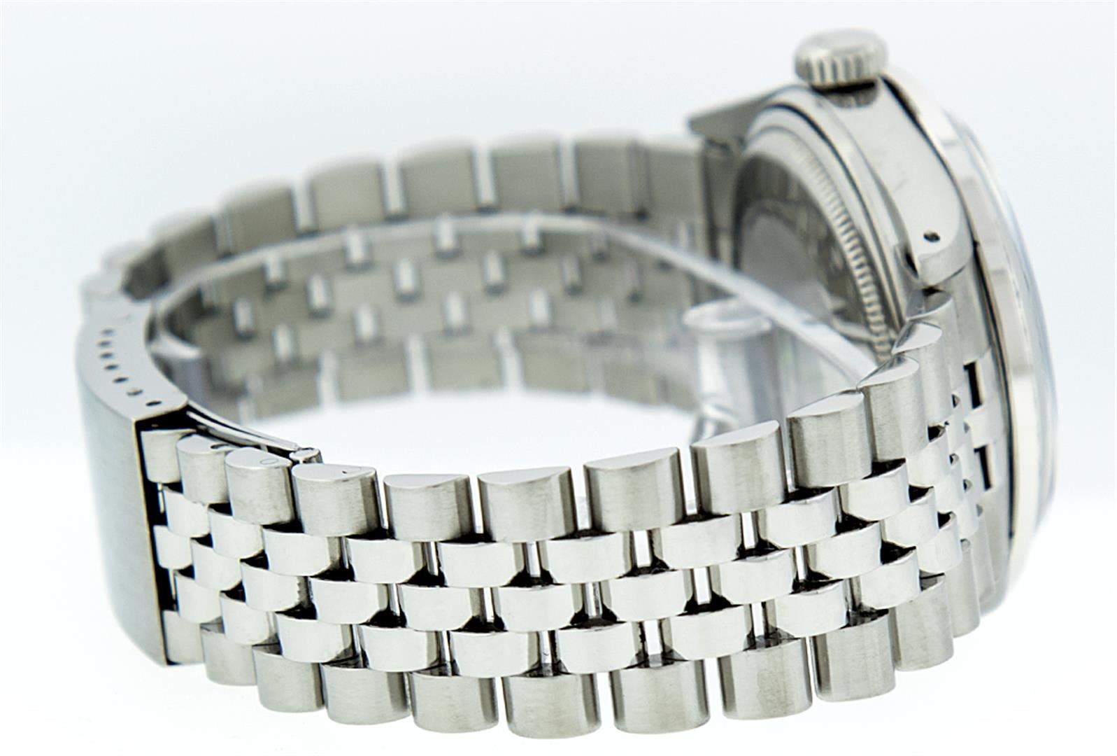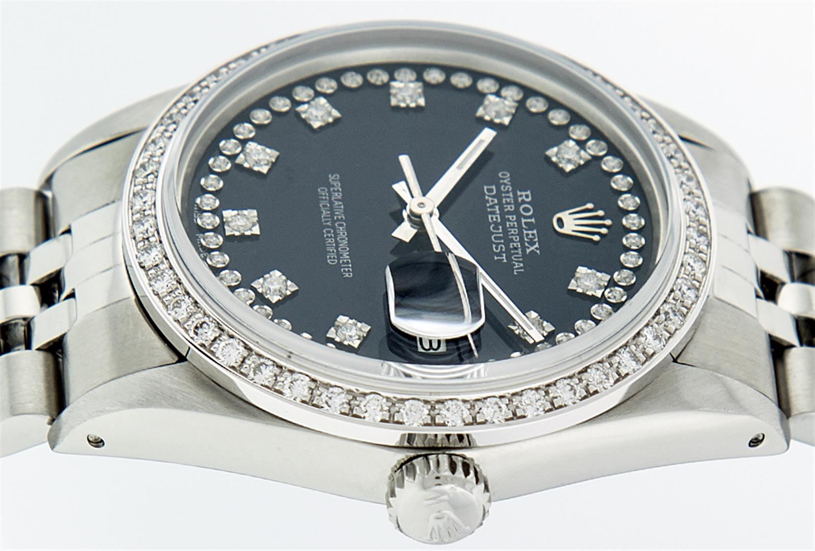 One Mens Rolex Datejust Polished, Serviced & Electronically Tested, Stainless Steel Case:36mm, Stainless Steel Crown, Custom Bezel: Stainless Steel Beadset Diamond Bezel, Diamond Count: 54 Diamonds. Total Weight .90 Carat, Clarity: SI-VS, Color: G to H. Custom Crystal: Synthetic Sapphire Cyclops Lens. Movement: Automatic Winding Movement Caliber 3035. Custom Dial: Black String Diamond Dial, Diamond Count: 58 Diamond In Dial G To H In Color, Clarity: VS. Date Window: 3 O'Clock Position Date Display, Quickset, Model: Datejust, Condition: G-6 Extra Fine. Bracelet: Stainless Steel Jubilee. Bright Polish & Satin Finish. 7.0 Inch Length, Adjustable. Standard Clasp, With Rolex Logo.
