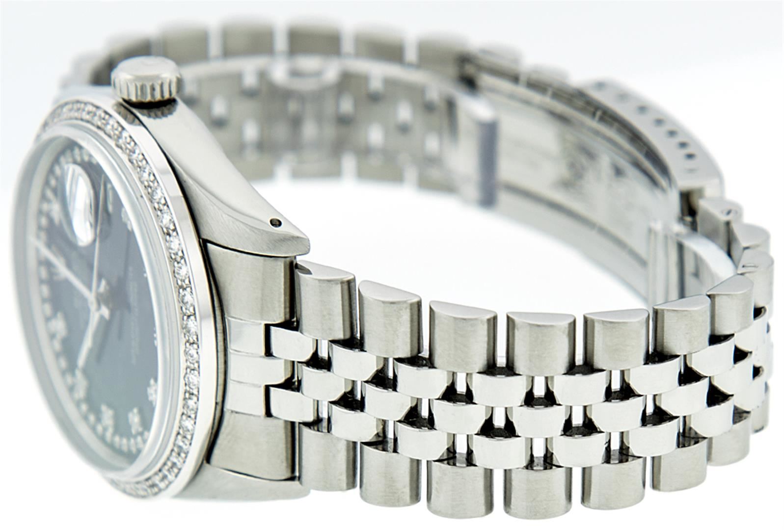 One Mens Rolex Datejust Polished, Serviced & Electronically Tested, Stainless Steel Case:36mm, Stainless Steel Crown, Custom Bezel: Stainless Steel Beadset Diamond Bezel, Diamond Count: 54 Diamonds. Total Weight .90 Carat, Clarity: SI-VS, Color: G to H. Custom Crystal: Synthetic Sapphire Cyclops Lens. Movement: Automatic Winding Movement Caliber 3035. Custom Dial: Black String Diamond Dial, Diamond Count: 58 Diamond In Dial G To H In Color, Clarity: VS. Date Window: 3 O'Clock Position Date Display, Quickset, Model: Datejust, Condition: G-6 Extra Fine. Bracelet: Stainless Steel Jubilee. Bright Polish & Satin Finish. 7.0 Inch Length, Adjustable. Standard Clasp, With Rolex Logo.