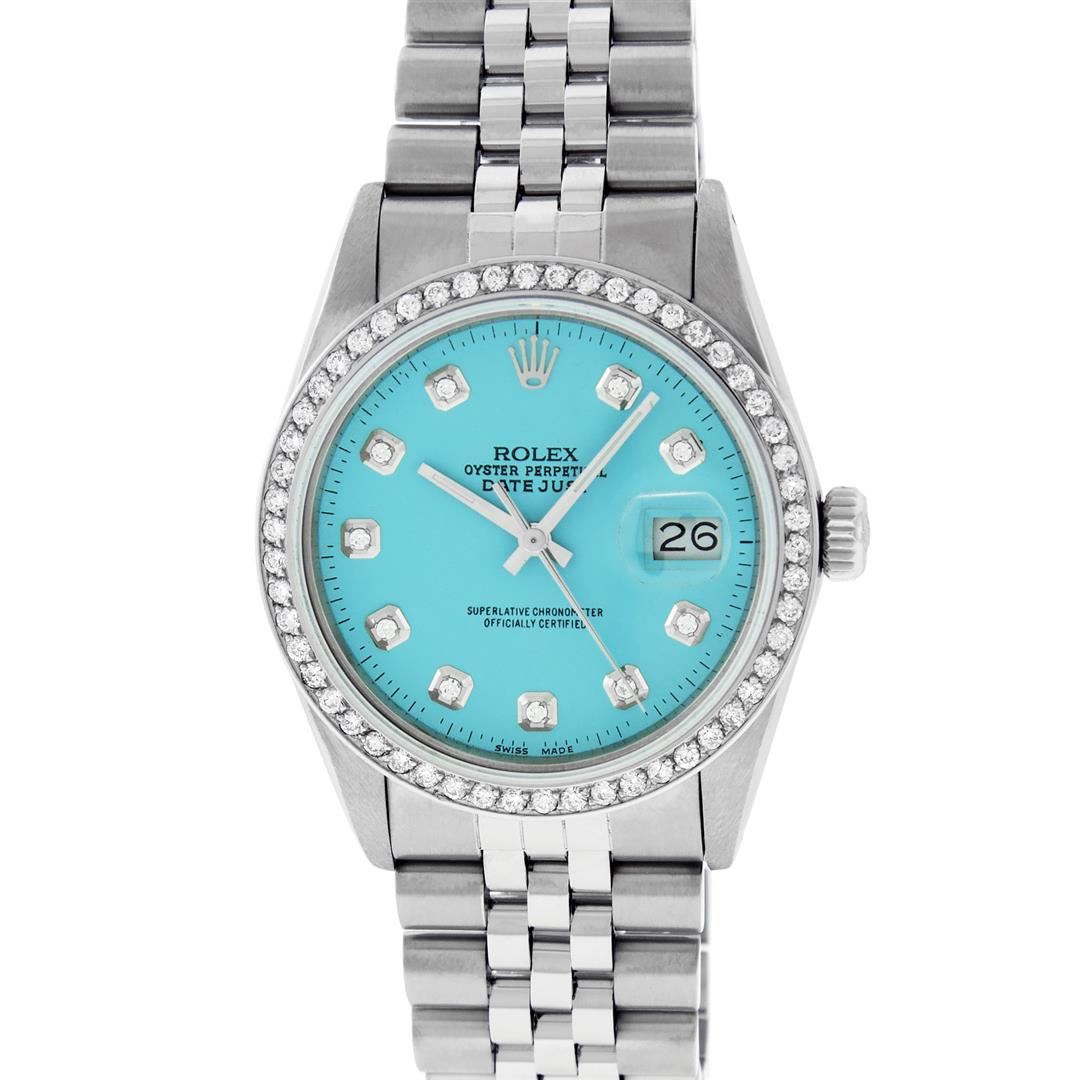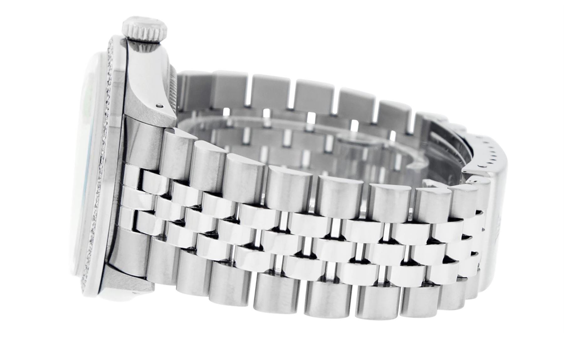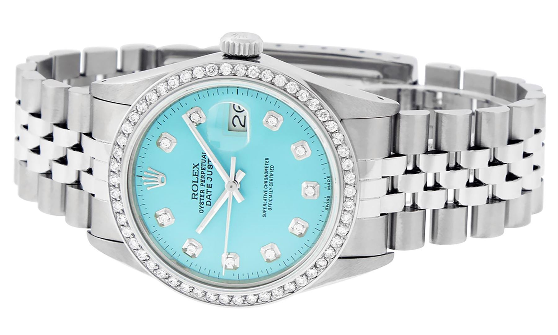 One Mens Rolex Stainless Steel Datejust Polished Bright with Satin Finish, This Watch Has Been Serviced & Electronically Tested, Stainless Steel Case: 36mm, Stainless Steel Crown, Custom Bezel: New Stainless Steel Beadset Diamond Bezel, Diamond Count: 54 Diamonds On Bezel, Total Weight 1.00 Carat, Clarity: SI-VS, Color: G to H. Custom Crystal: New Scratch Resistant Synthetic Sapphire Cyclops Lens. Custom Hands: New Luminescent Hands. Movement: Automatic Winding Movement Caliber 3035. Custom Dial: Blue Diamond Dial With Dash Track, Diamond Count: 10 Diamonds On Dial, Color: G to H, Clarity: VS2-SI1. Date Window: 3 O'Clock Position Date Display, Quickset, Model: Datejust. Condition: G-6 Extra Fine. Bracelet: Stainless Steel Jubilee Band. Bright Polish & Satin Finish. 7.0 Inch Length, Adjustable. Standard Clasp, With Rolex Logo. This Watch Has Been Serviced Time Tested And Is In Excellent Condition It Is Free Of All Scratches And Dents.